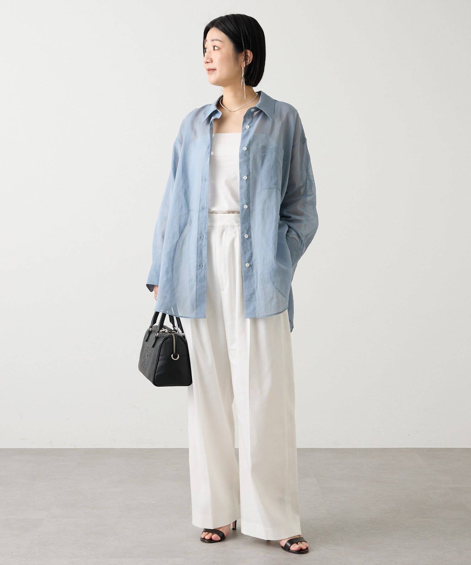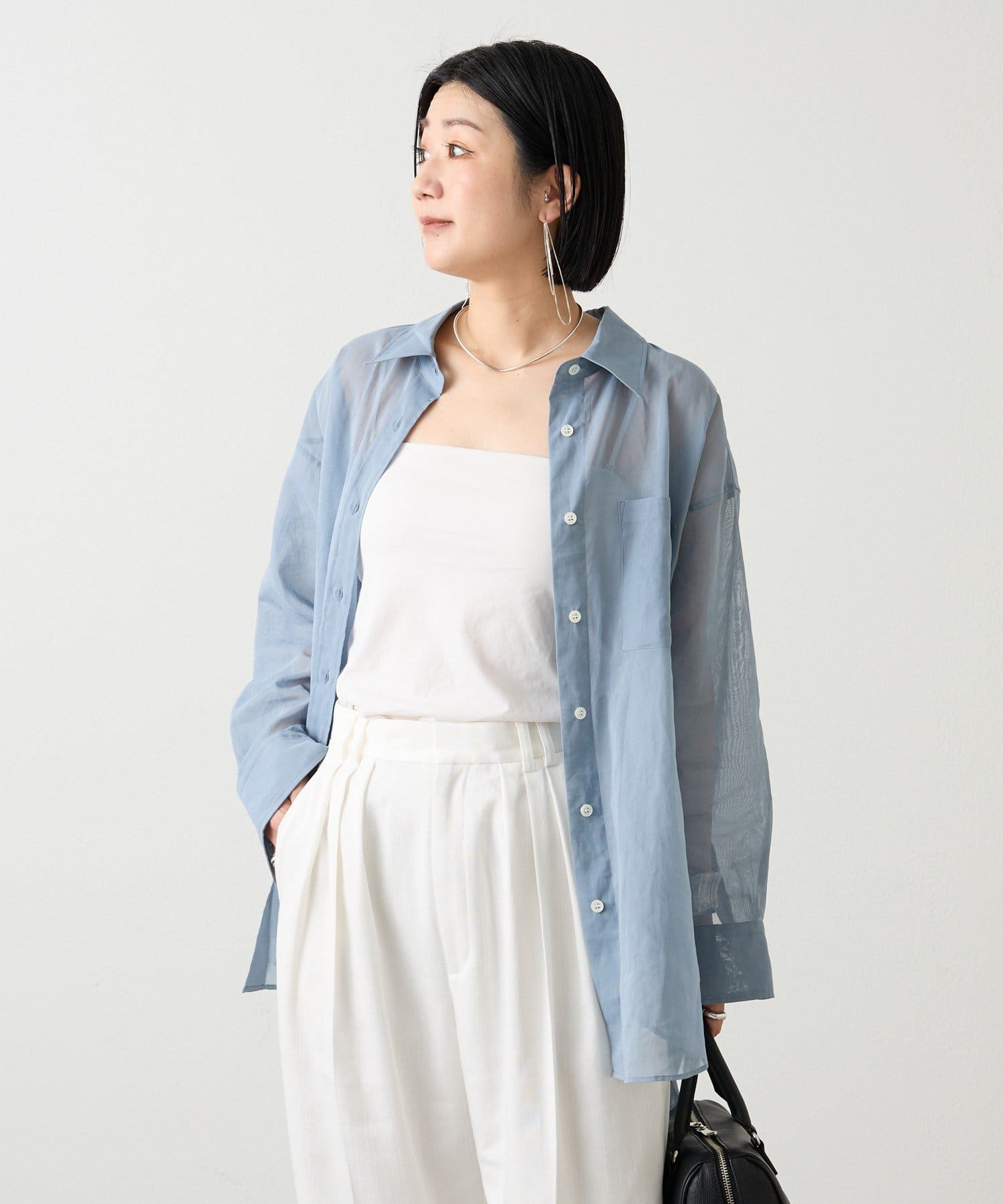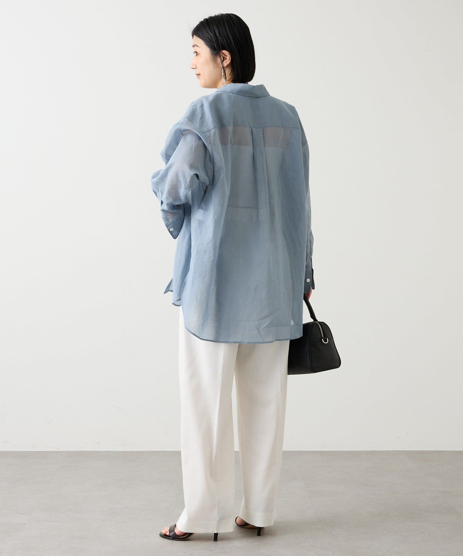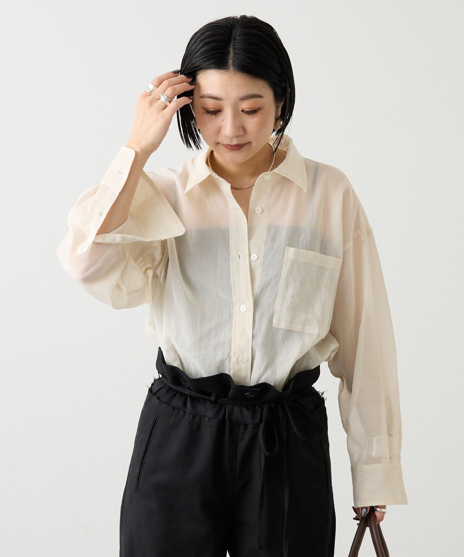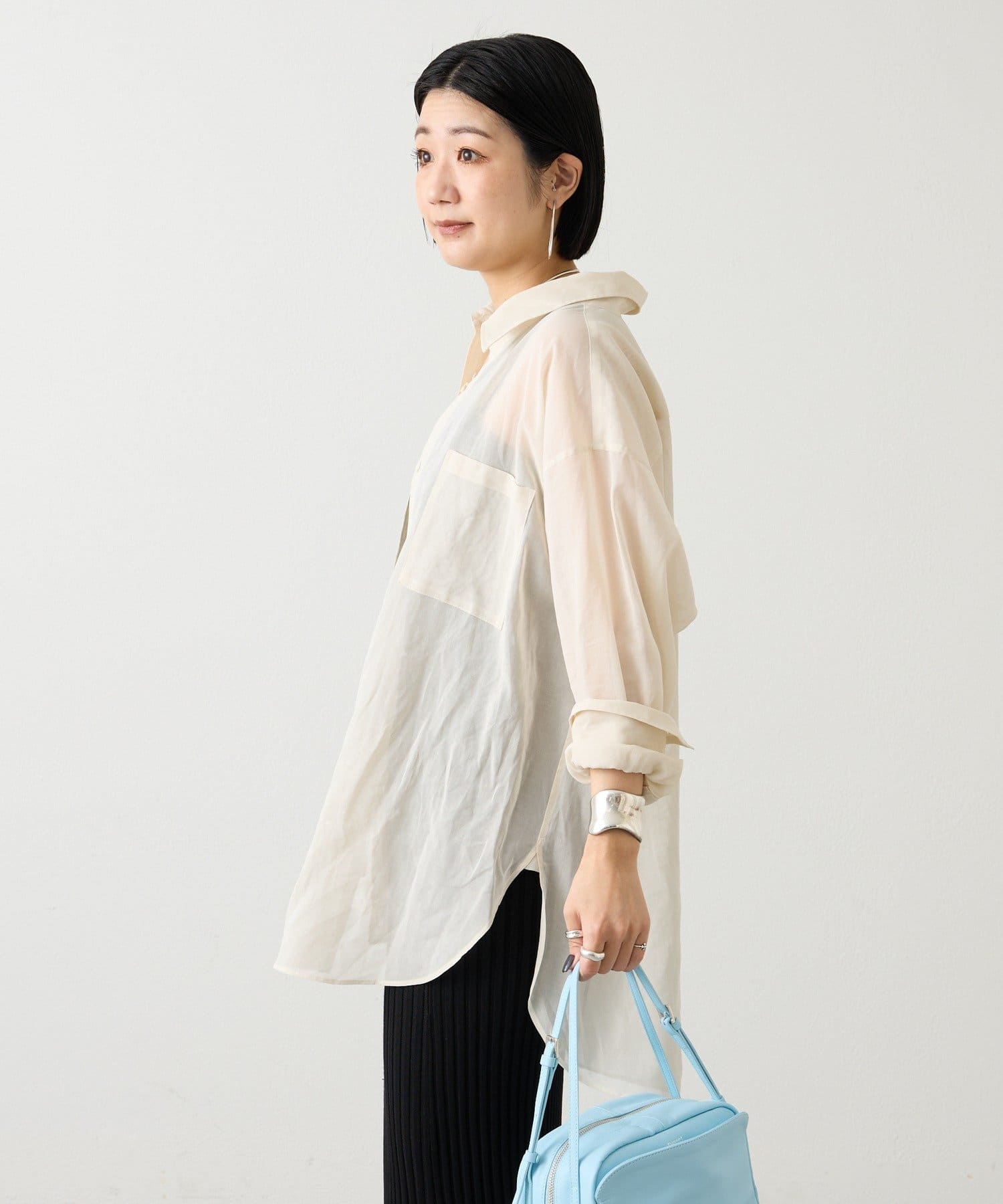 適度なハリと透明感をもたせた、オーバーシルエットのシアーシャツ。