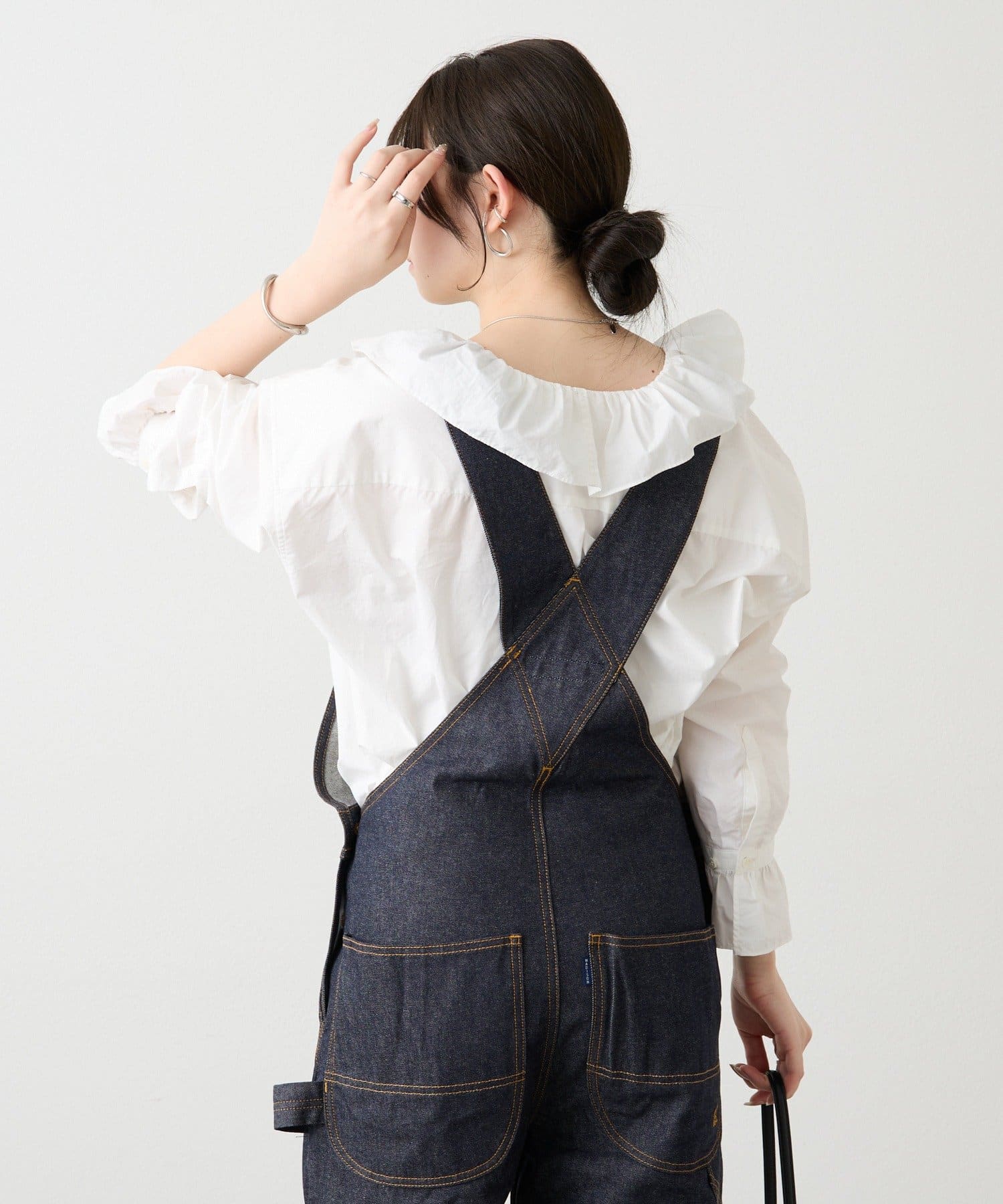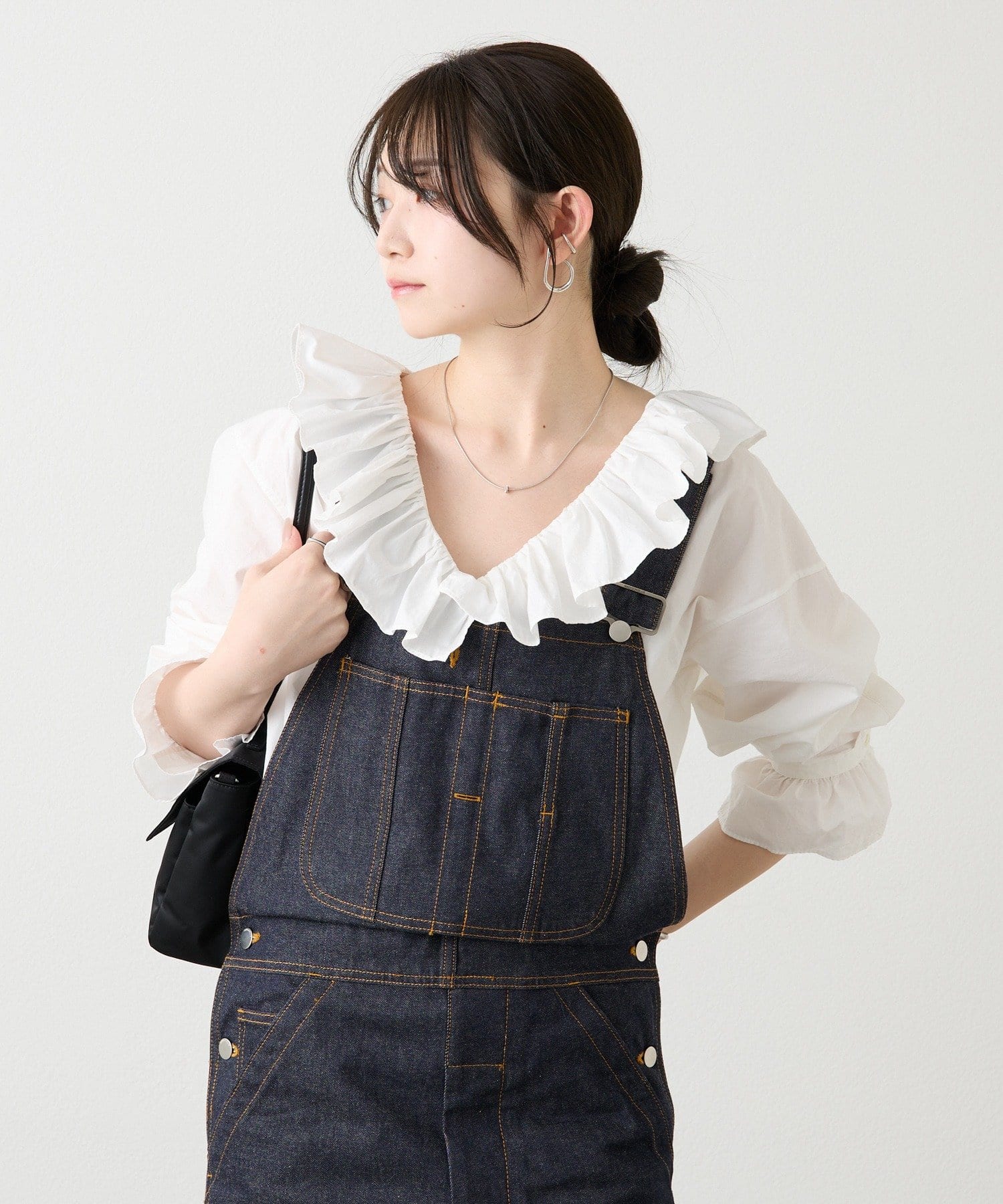 襟元のラッフルが甘い印象なので、デニムなどのカジュアルアイテムと合わせたスタイリングがおすすめです。