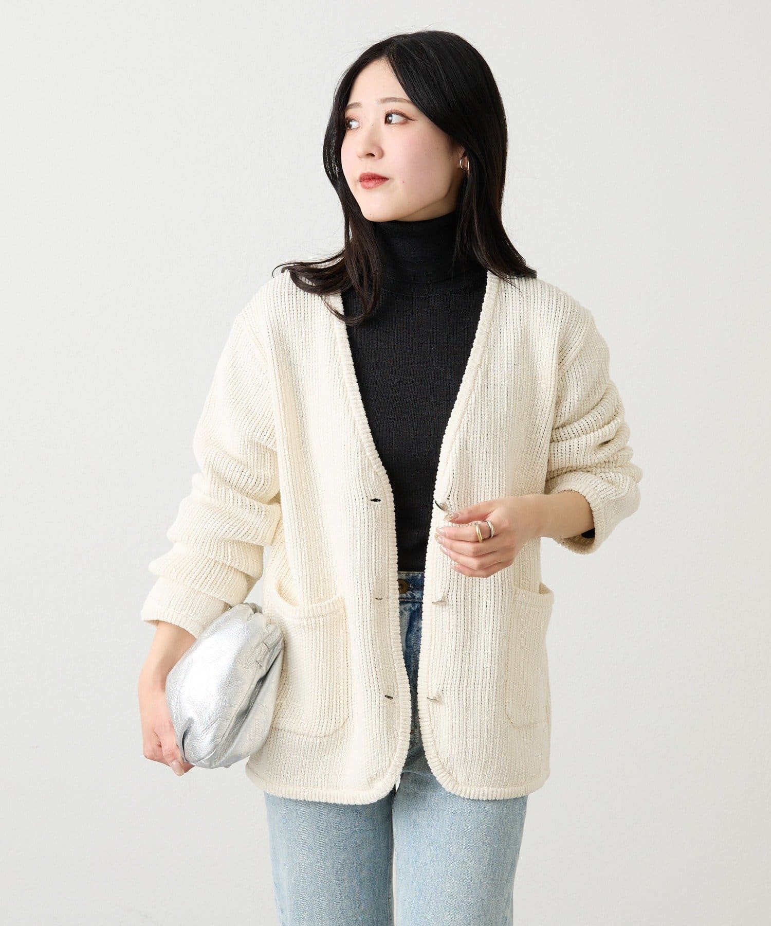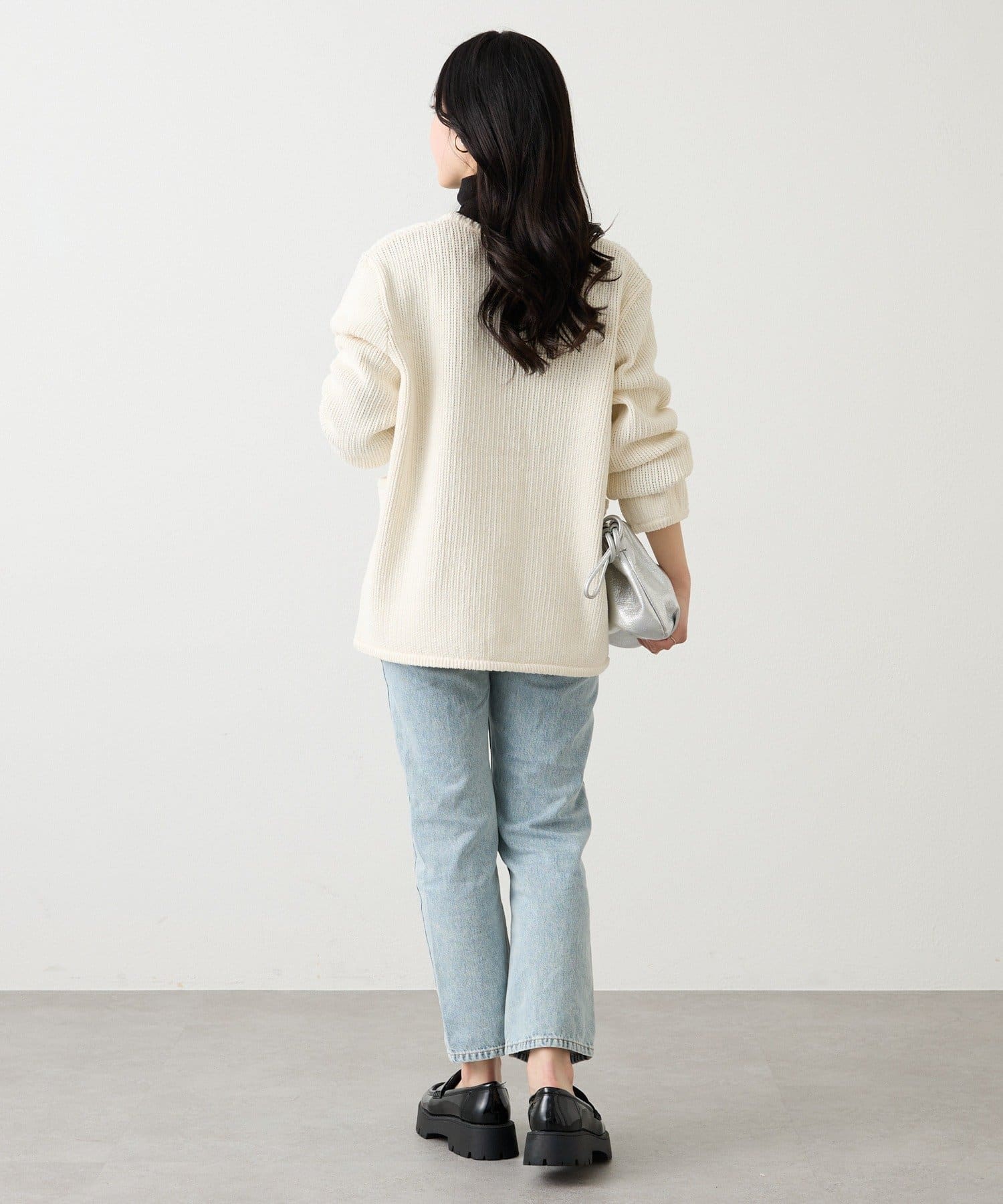 表情のある編地がシンプルなコーディネートのアクセントになり、
