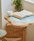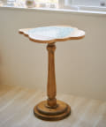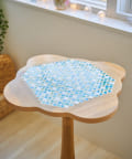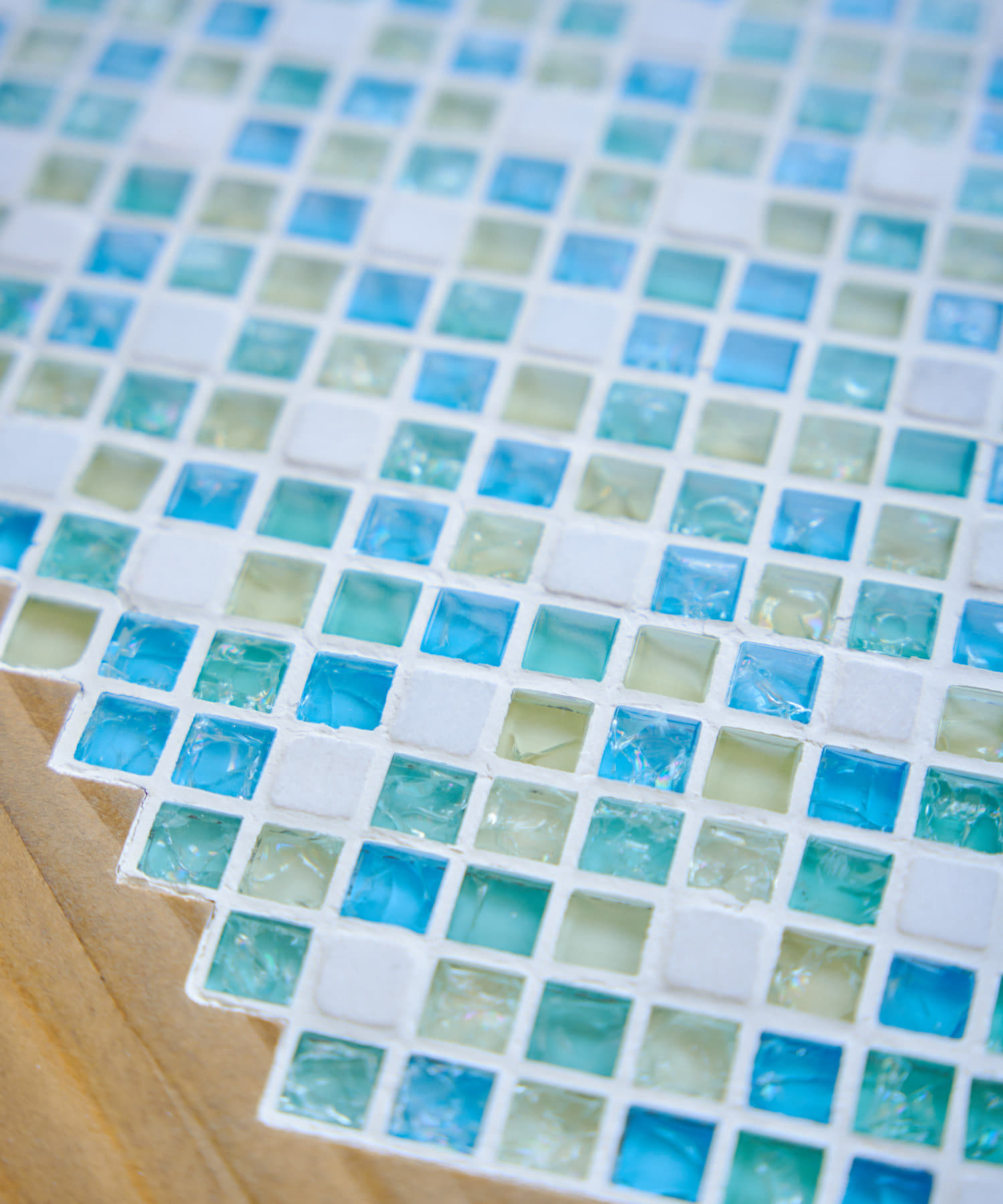 天板の形と、色付きのモザイクガラスが特徴的なテーブル。