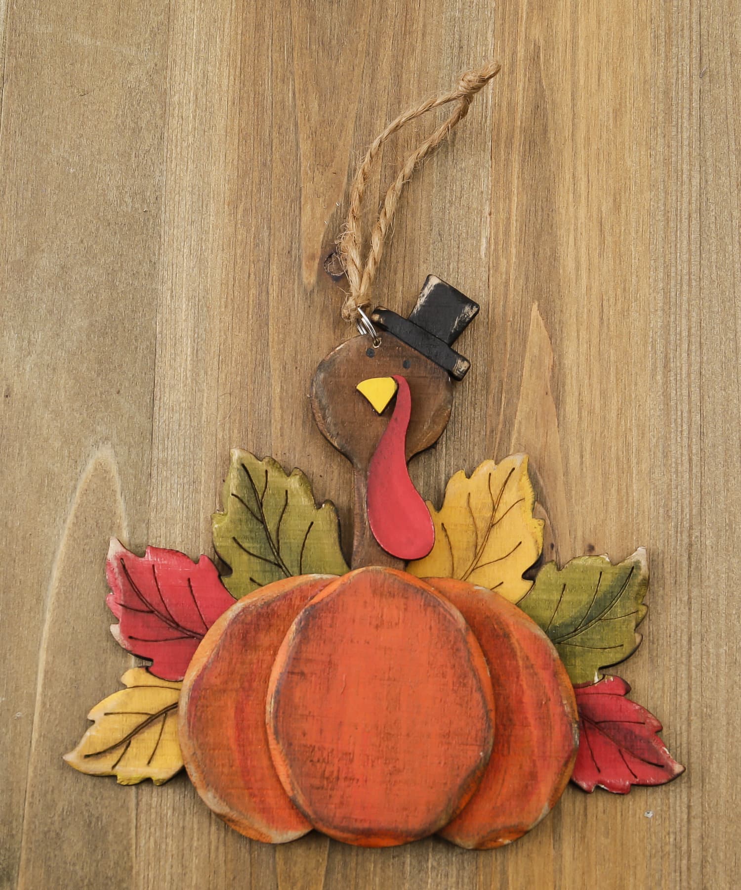 ハロウィン感のあるかぼちゃと落ち葉、そしてハットをかぶった七面鳥がユニークなオーナメント。