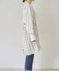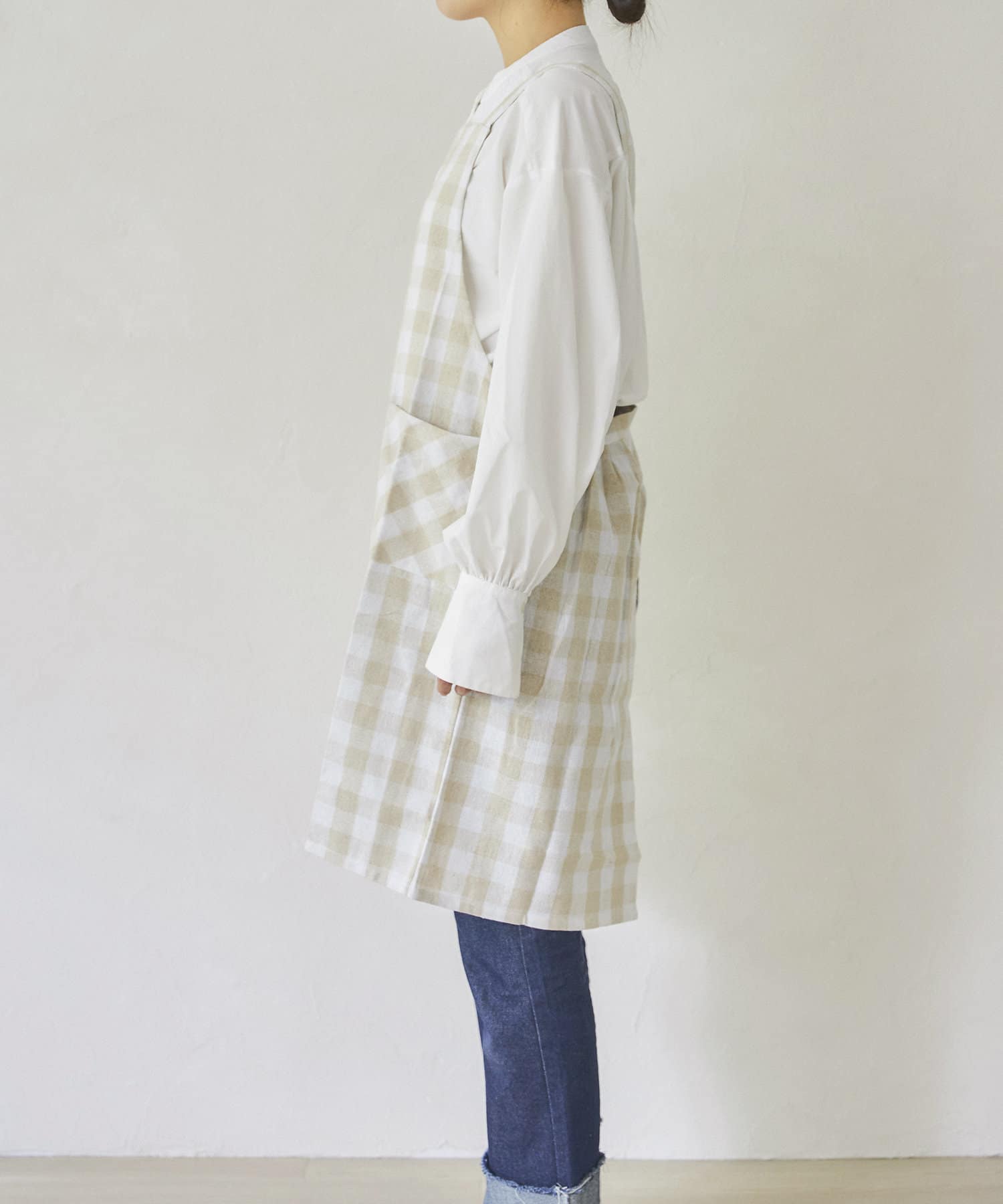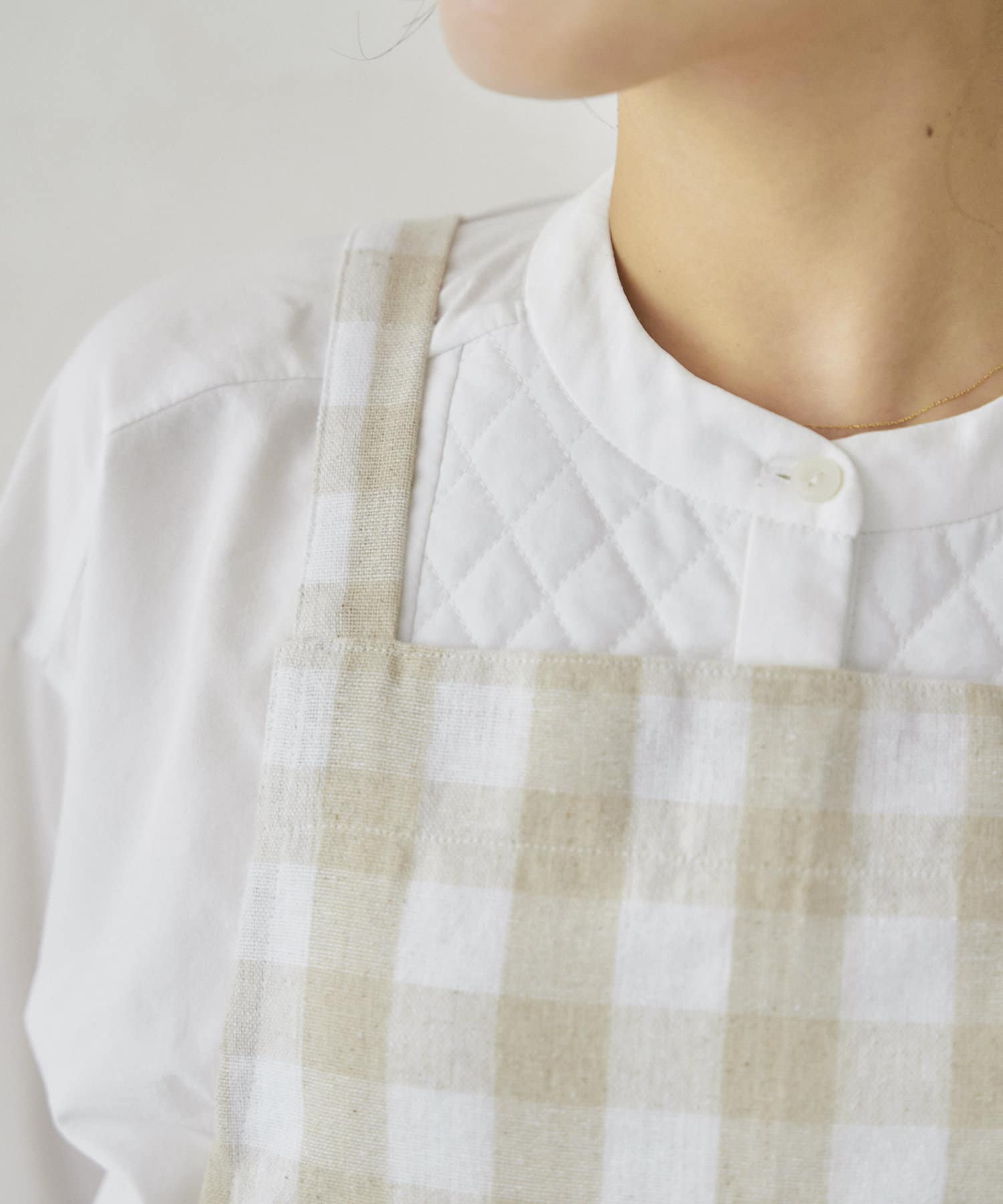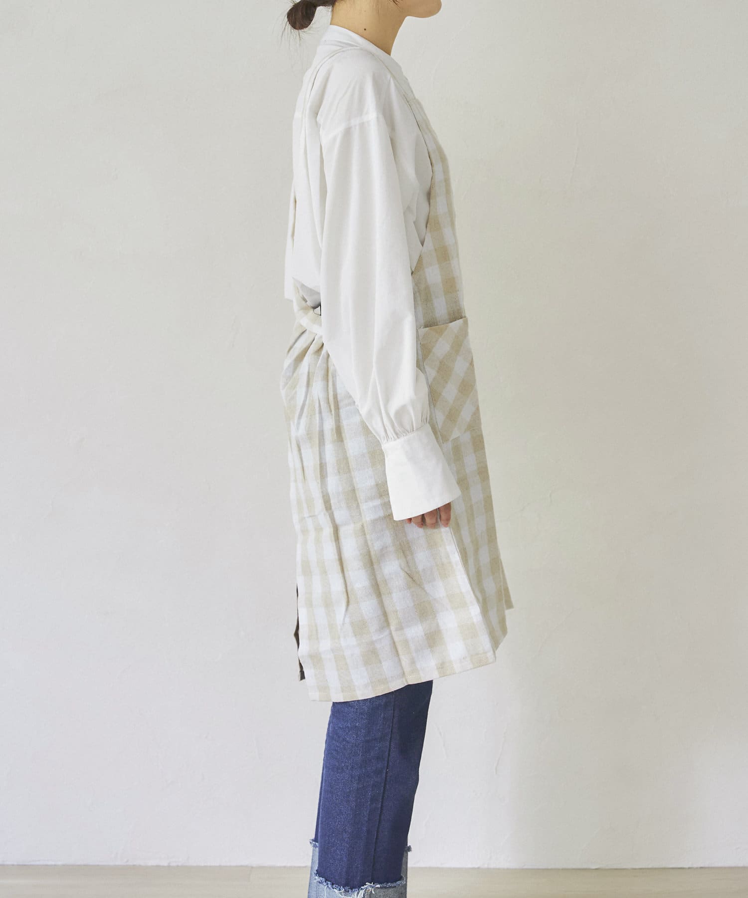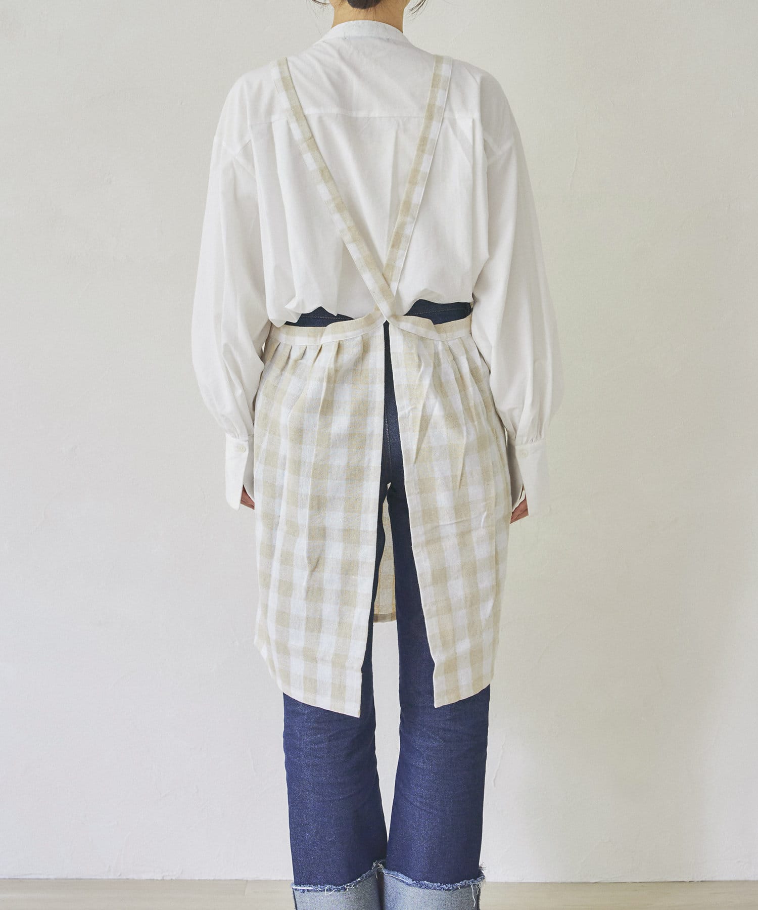 明るいホワイトとベージュのチェックエプロン。