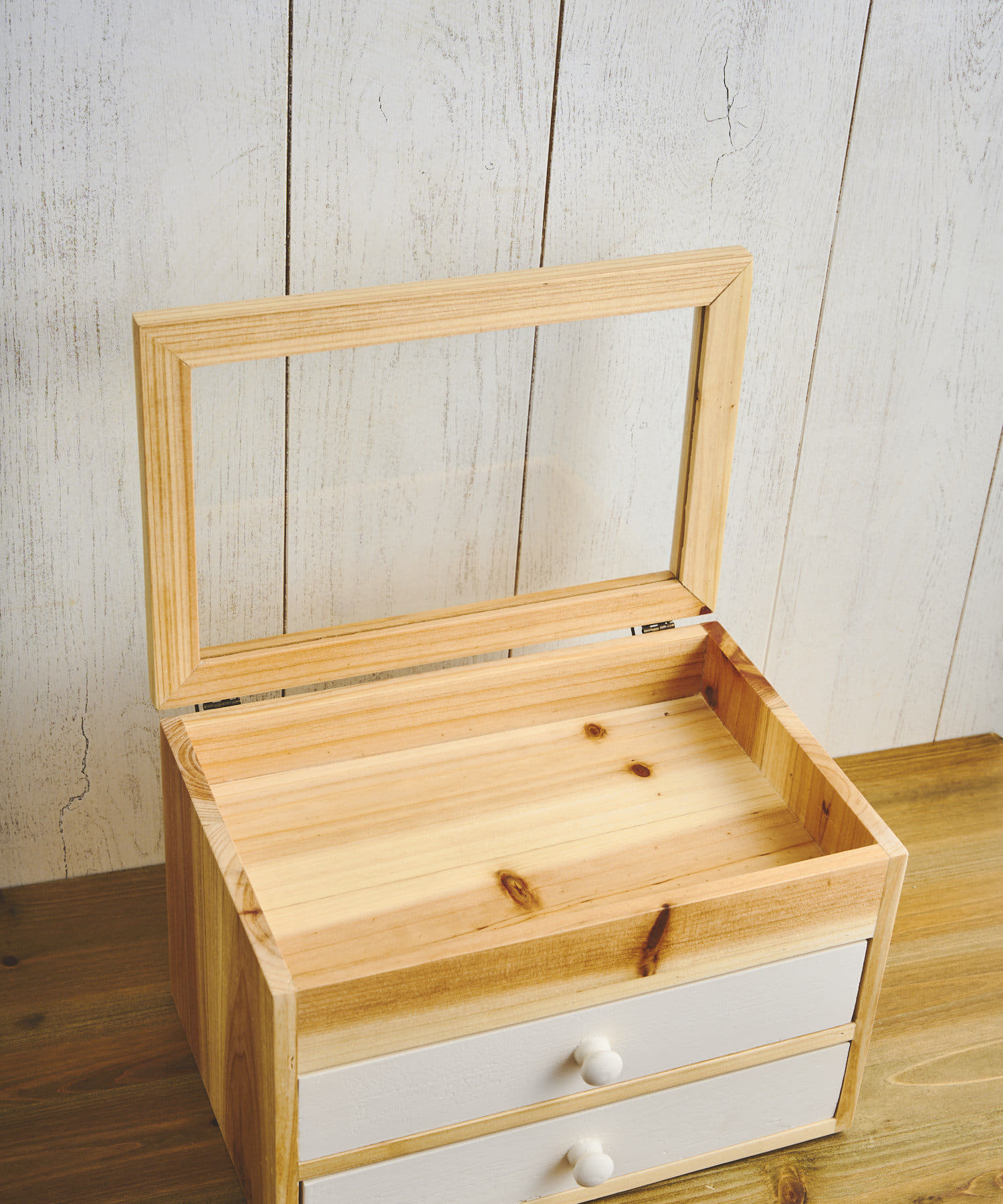 ナチュラルなウッドブラウン×ホワイトのカラーがかわいらしい引き出しボックス。