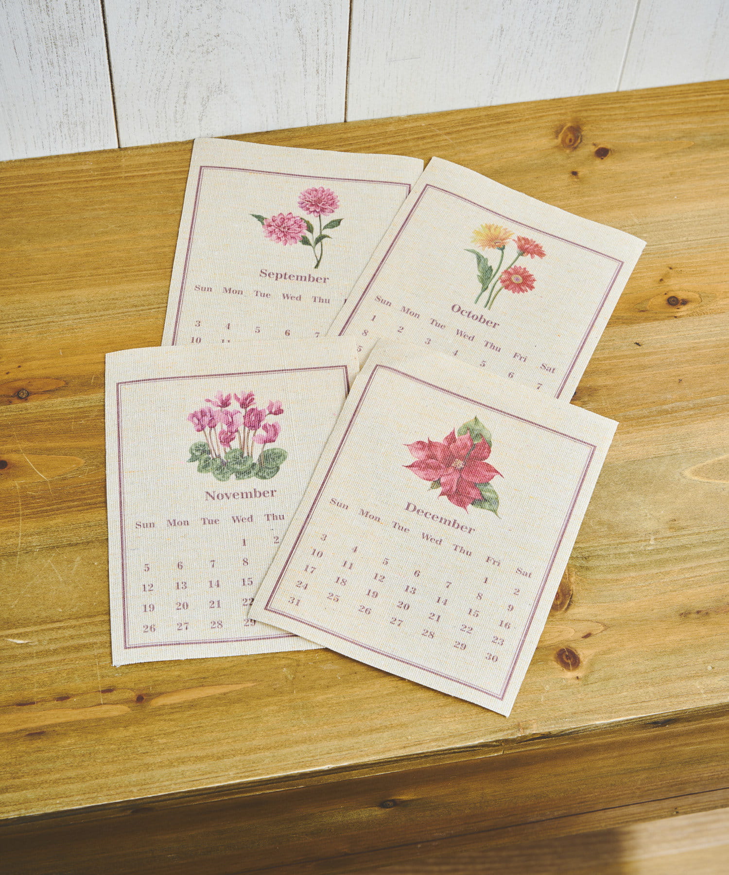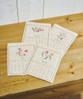 お花が好きなので購入しました。一枚一枚違った季節の花が描かれていて、しっかりしてるけど柔らかさもある生成りの生地の素敵なカレンダーです。アンティークっぽく飾りたいと思います。
