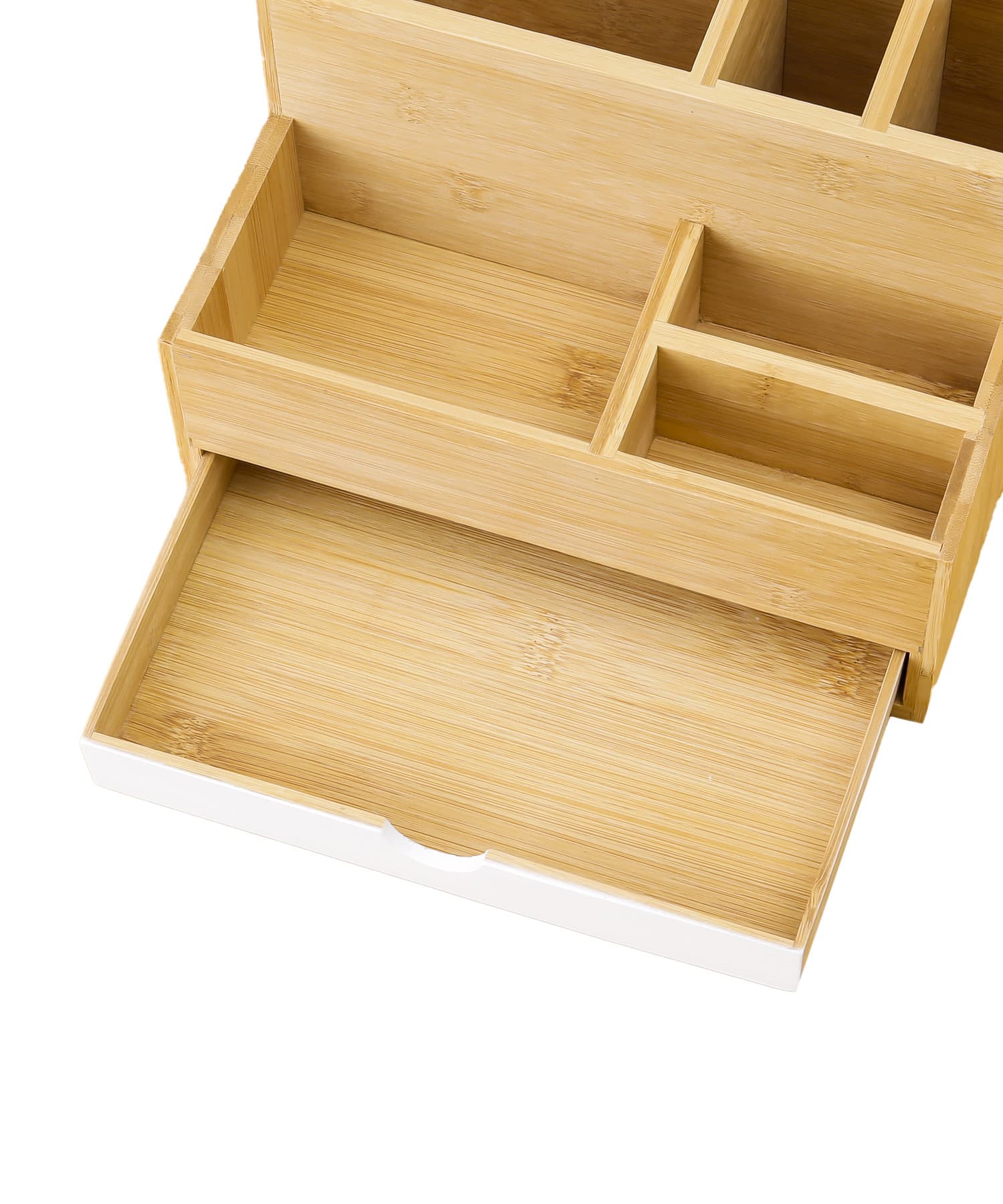 右側手前の縦にはリップ、その後ろに正方形の付箋を2つ、薄いコンパクト鏡を1つ。その後ろには、はさみ、ペン類。左どなりの大きくて深い所にはよくある正方形で持ち運び簡単のセロハンテープ、ポリエチレン手袋100枚入を箱ごと、雑貨っぽいジップ袋たち♡♡などなど。その手前には低めの筒状の化粧水ボトル、ハンドクリーム数種などなど入れてます♡引き出しにはガムやヘアピンやジム用クリップなど細々とした物を入れてます。仕事用でデスクに置いてるのでジャンル色々なものを置いてますが、めちゃめちゃ使い勝手が良いです!