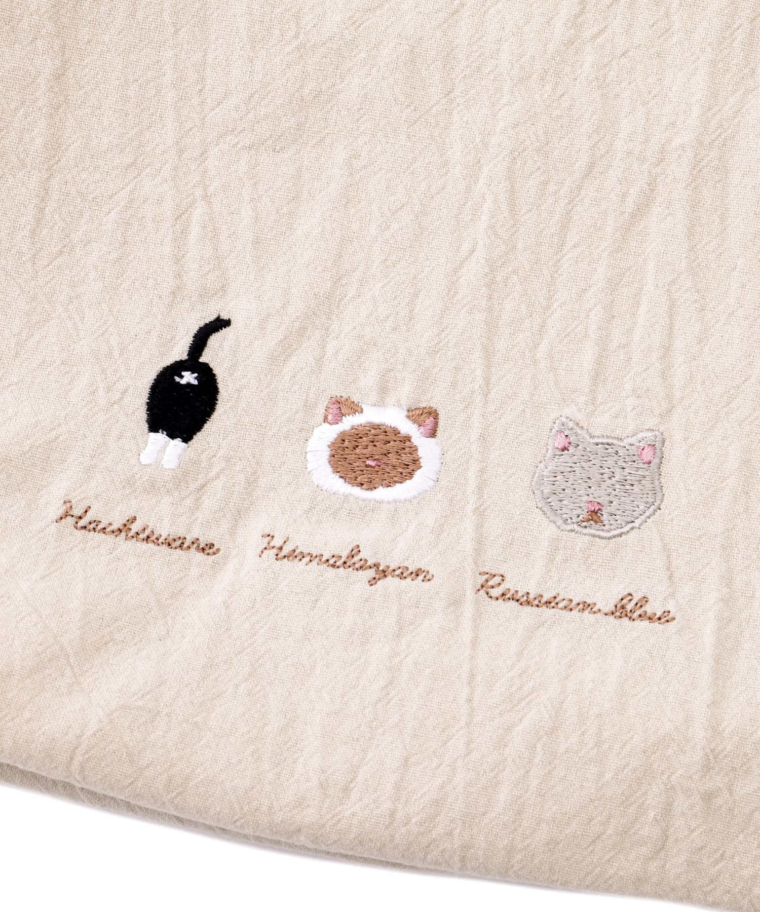 ワッシャー加工の生地とナチュラルなカラーが猫の刺繍を引き立てます。