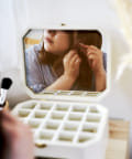 ●蓋のガラス面は特殊加工のため、ミラー代わりに使用できピアスを装着する際などに活躍してくれます!