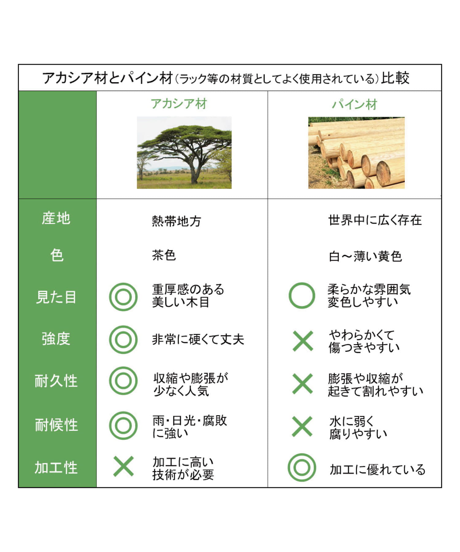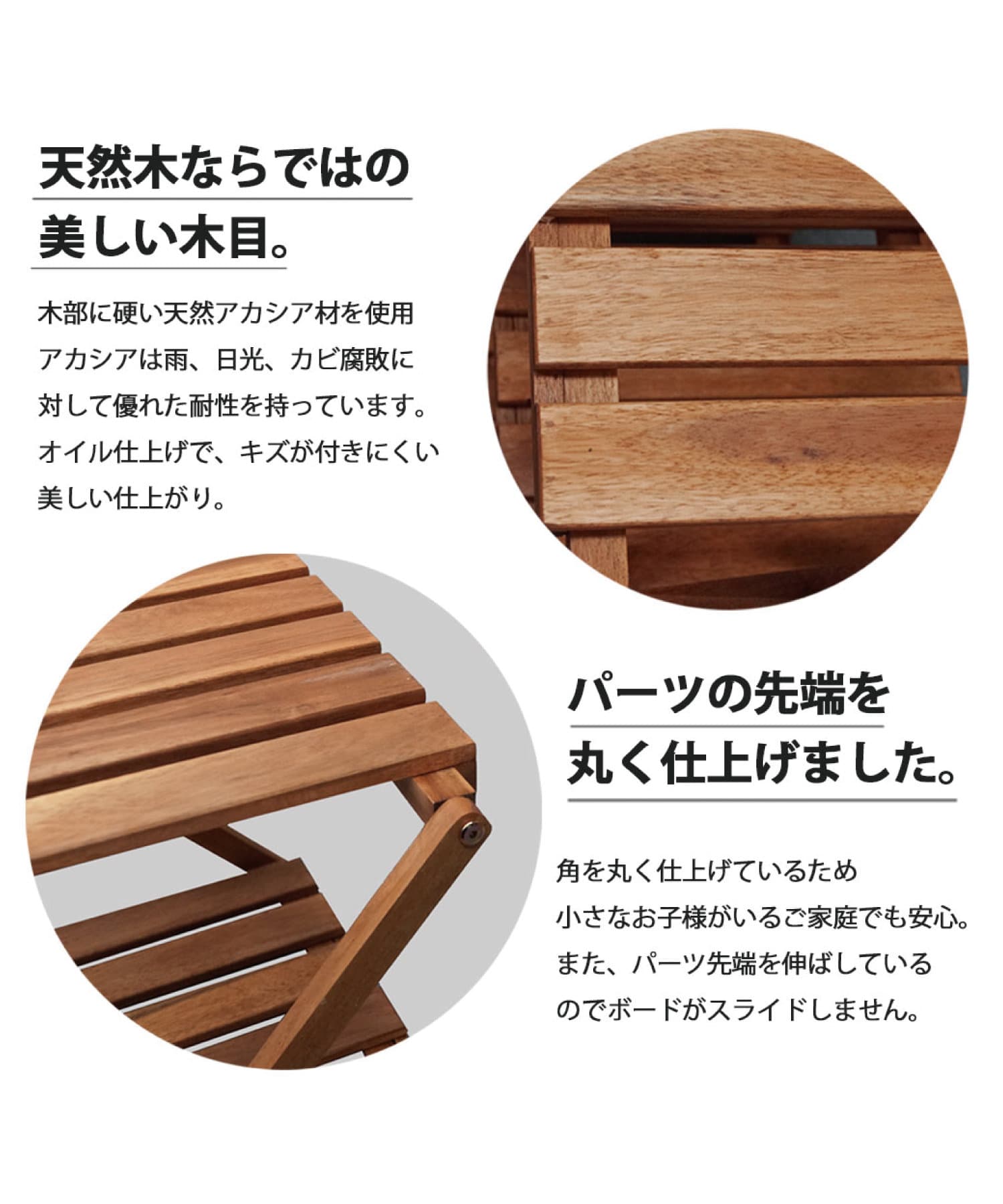 ●天然アカシア材を使用しており、アカシアは雨、日光、カビ、腐敗に対して優れた耐性をもっていてお庭などの屋外シーンにも適しています。