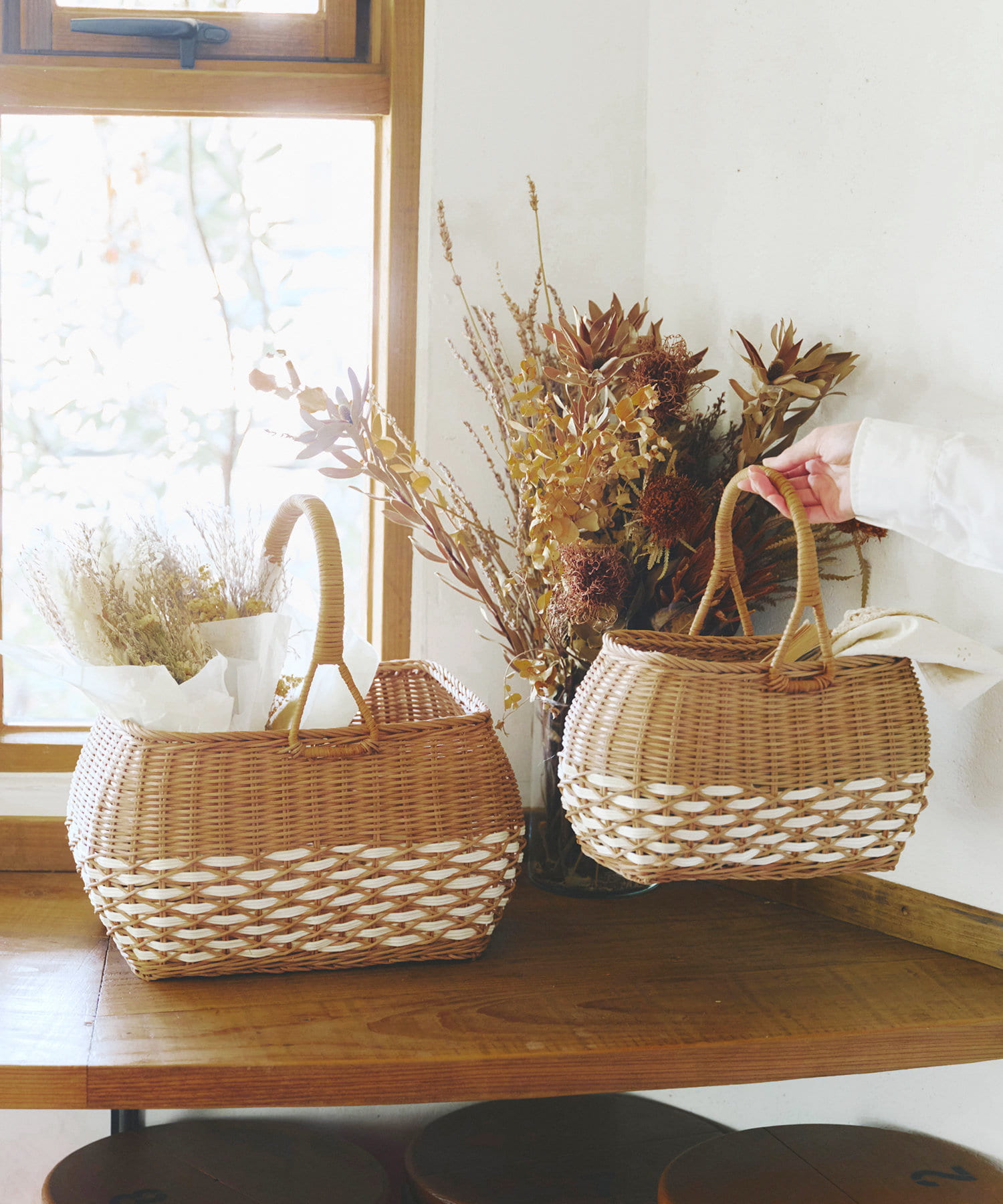 ●軽くて丈夫なラタン素材のバスケット。