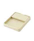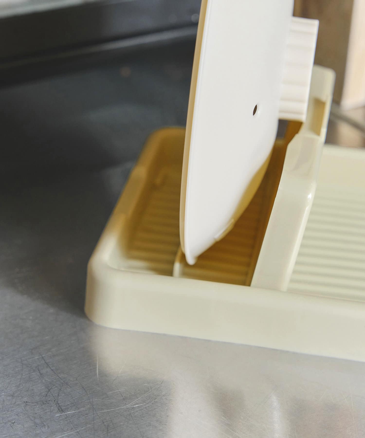 ●鍋蓋を立てかけるホルダーと、スパチュラやレードル、トングなどを一時的に置けるトレイが一体になっています。