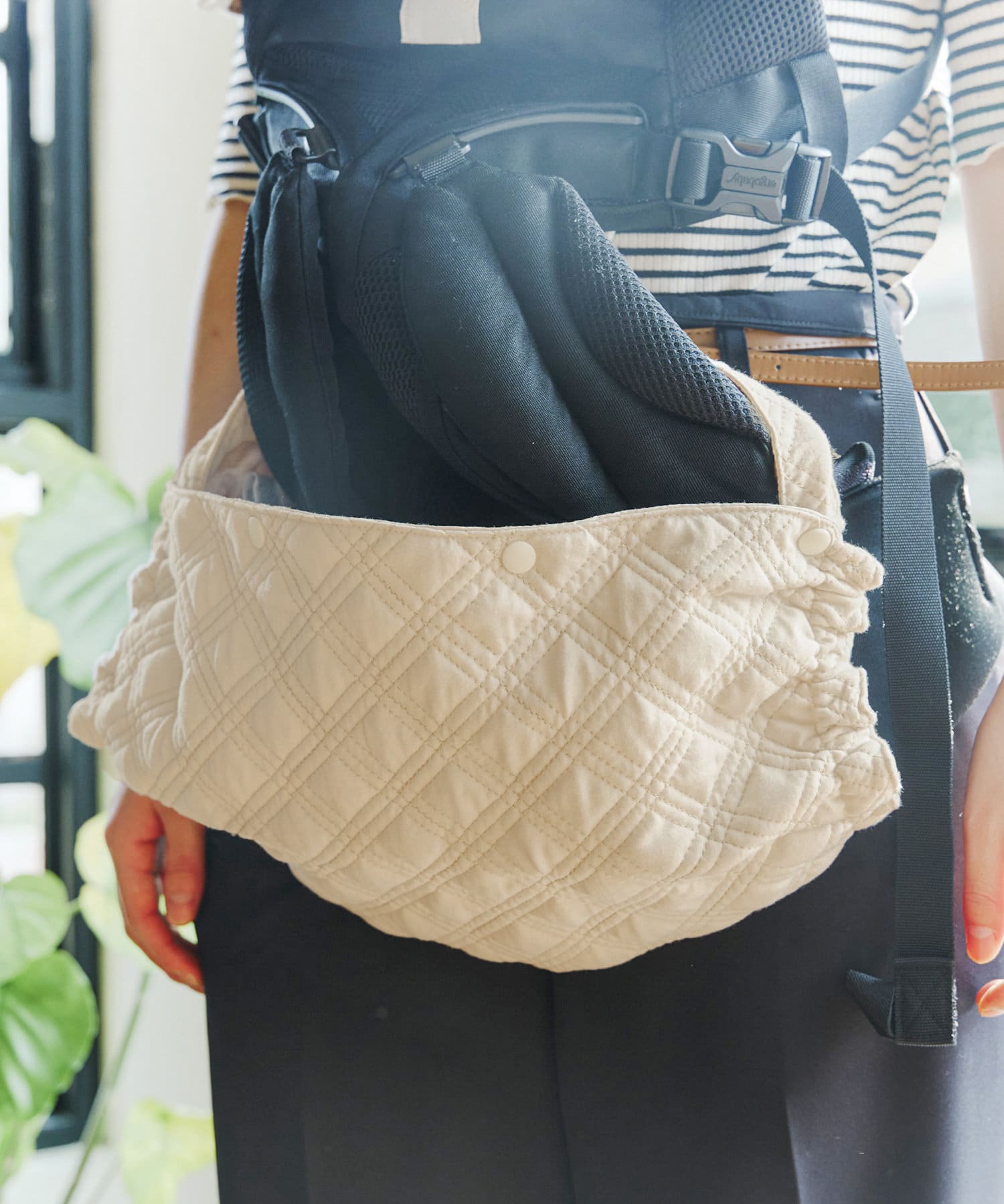 ●抱っこ紐の使用時もつけっぱなしで使用できるので、必要な時にサッと収納・取り出しが可能です。