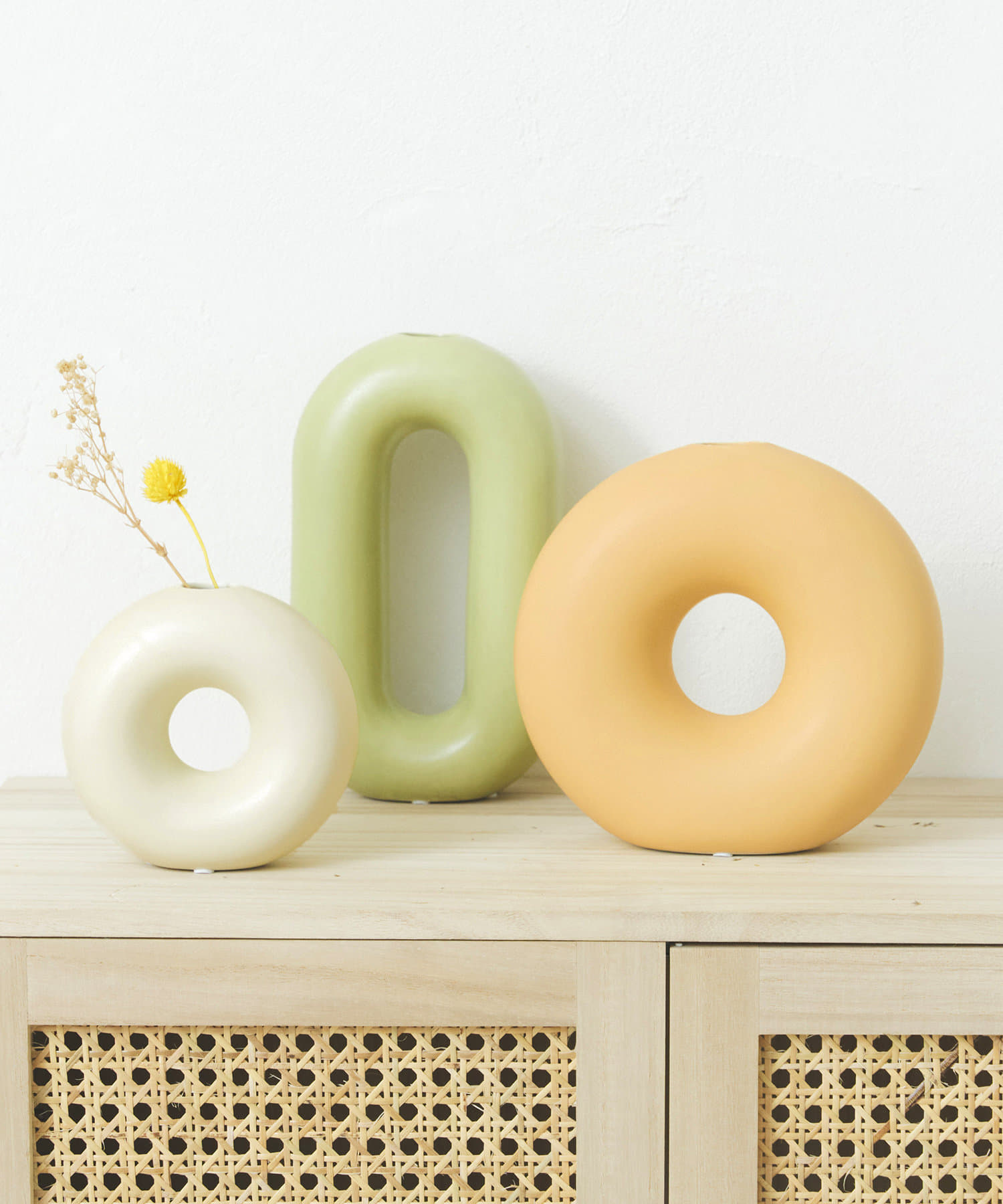 ●マットなカラーとドーナツ型がかわいいフラワーベース。