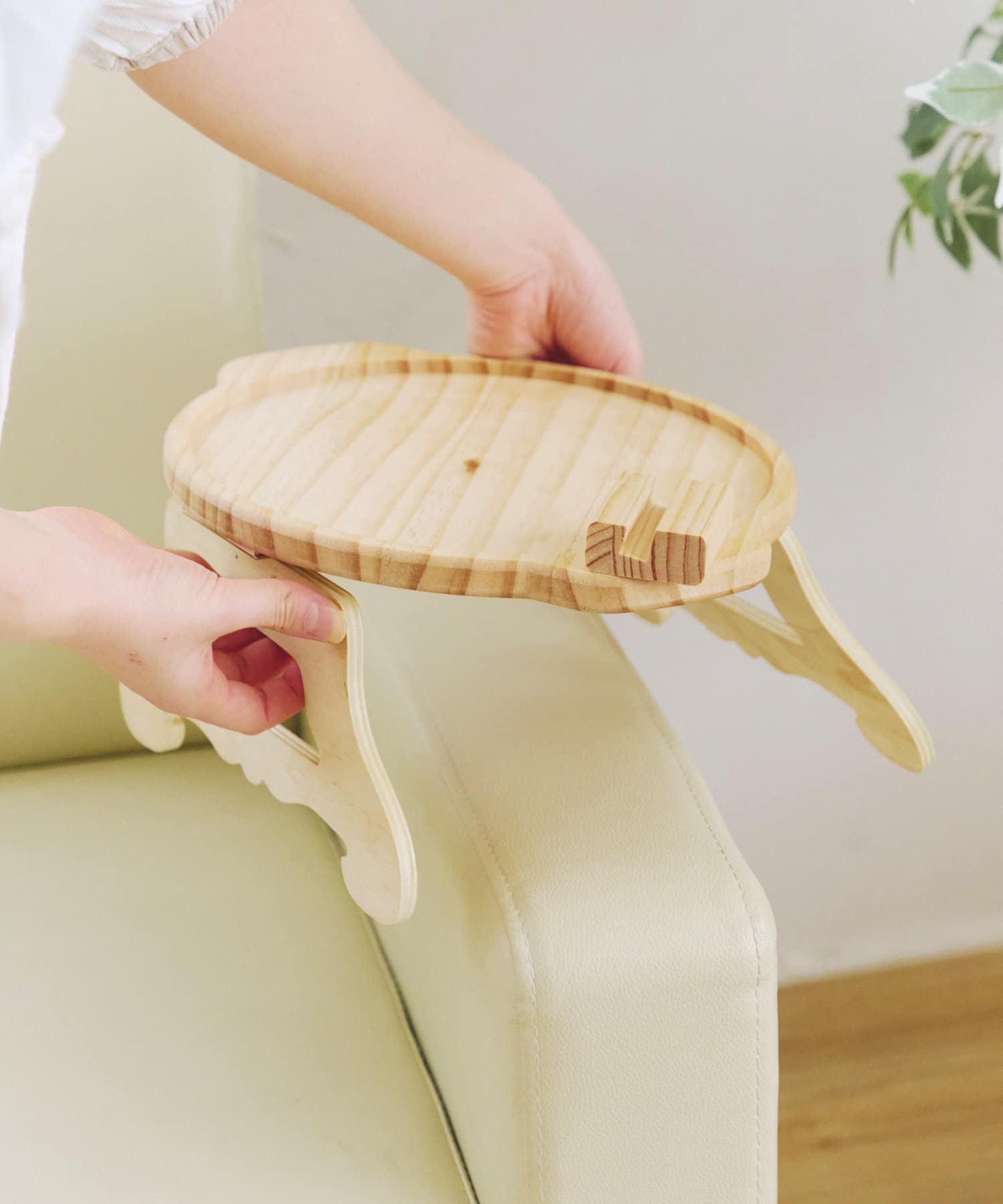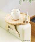●ソファーのアームレストにピッタリと設置できる、木製のテーブル。