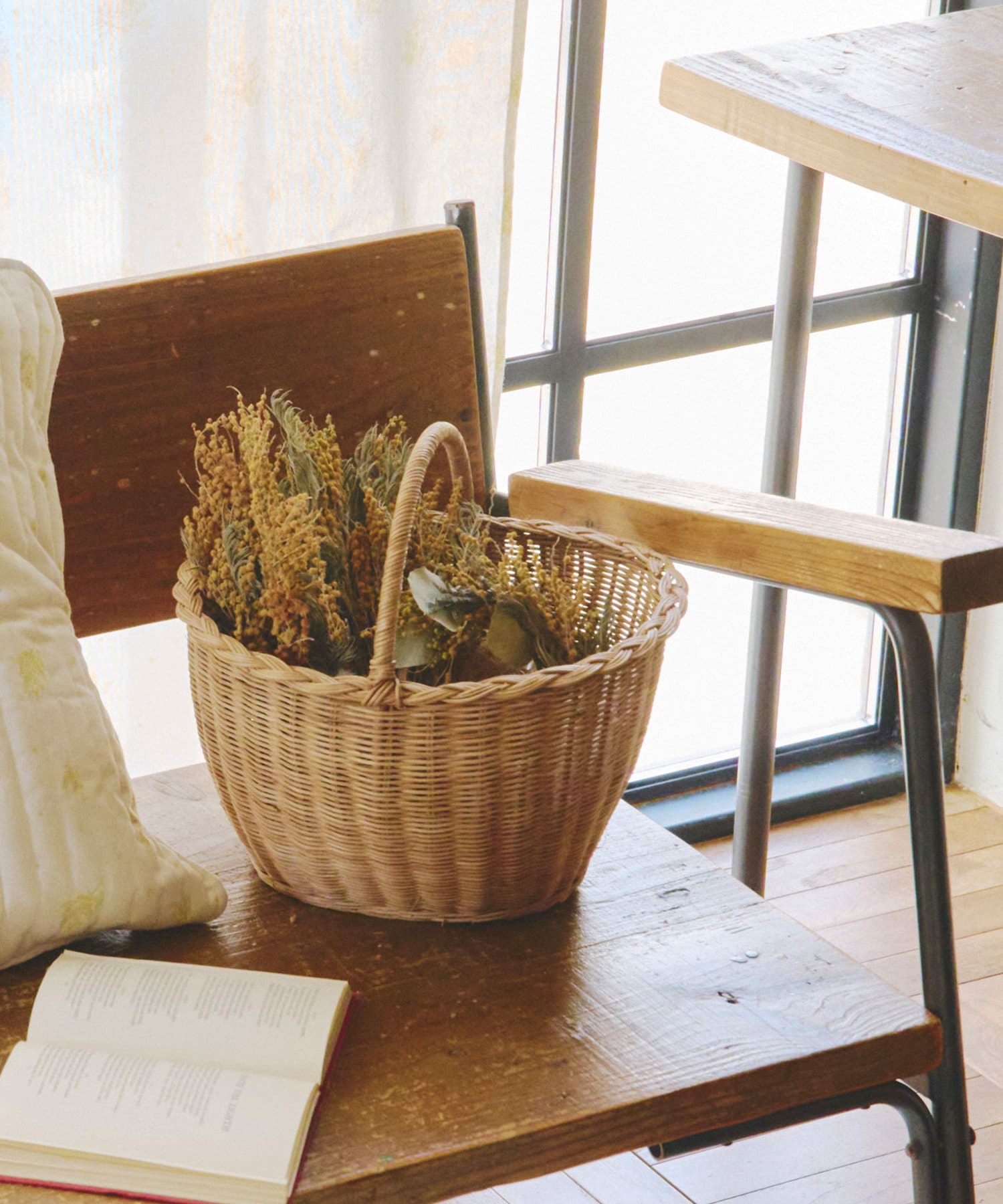 ●ふわふわとしたミモザのドライフラワーが、春の温かい雰囲気を演出します。