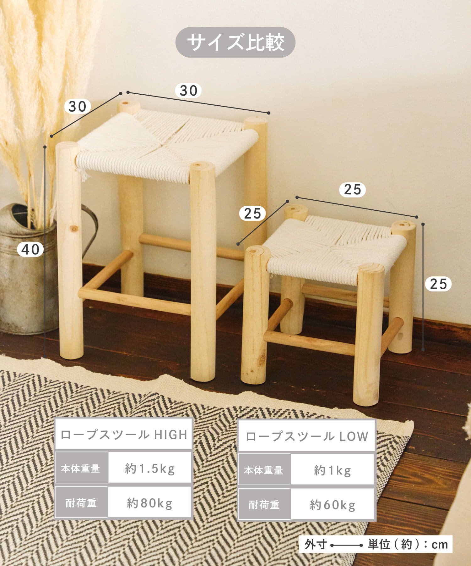 ●座面がロープで編まれたナチュラルなデザインのスツール。