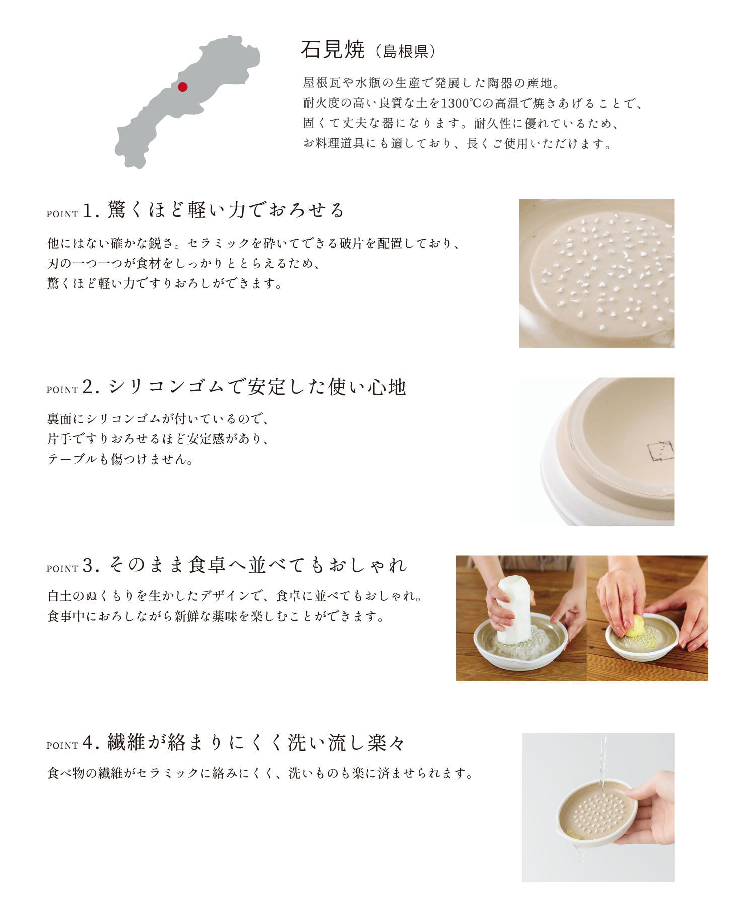 ●すり鉢、おろし器専門の元重製陶所が開発した石見焼の陶器製おろし器。