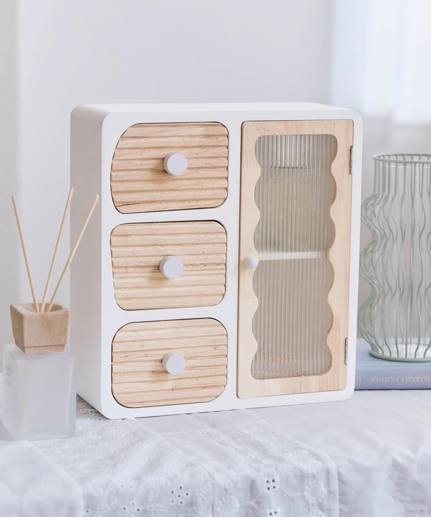 ●3段の引き出しとガラス扉付きで、収納力も抜群です。