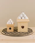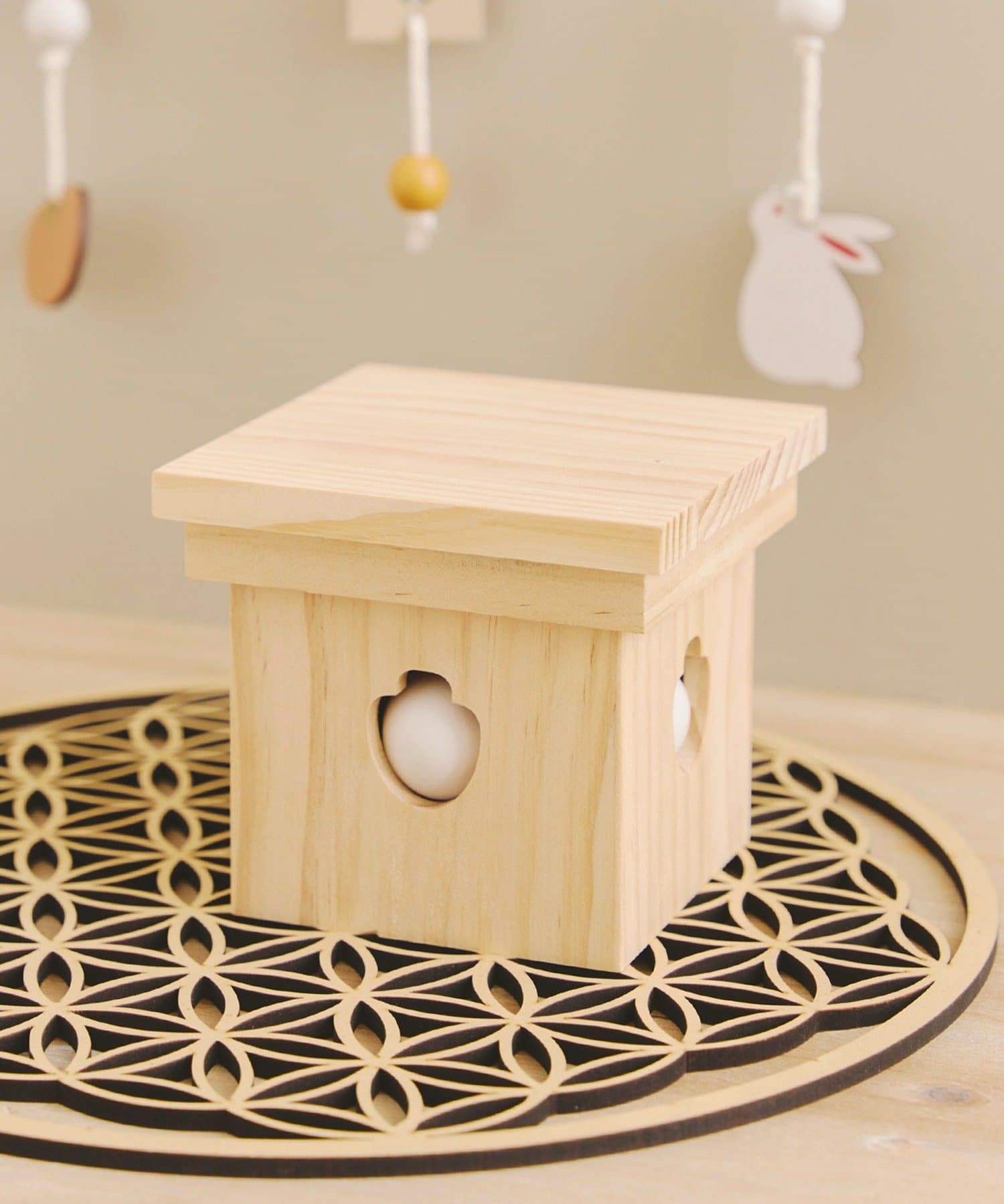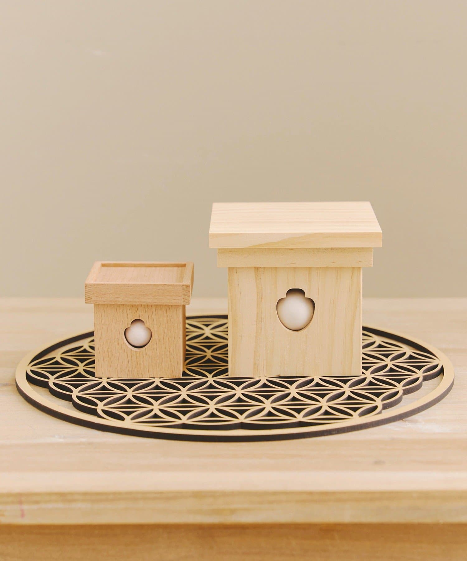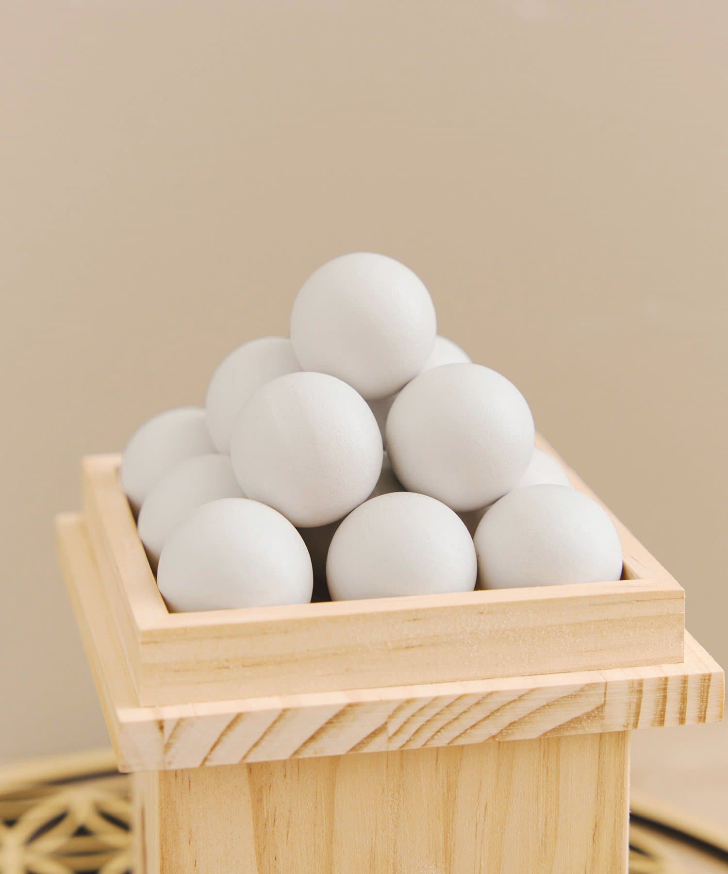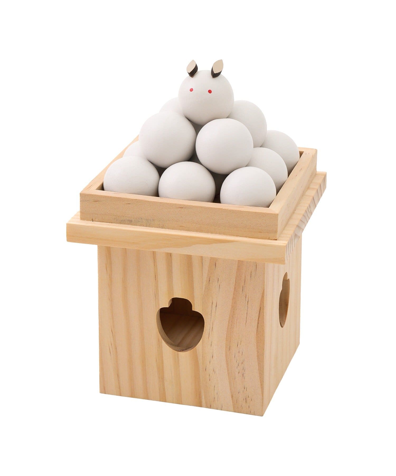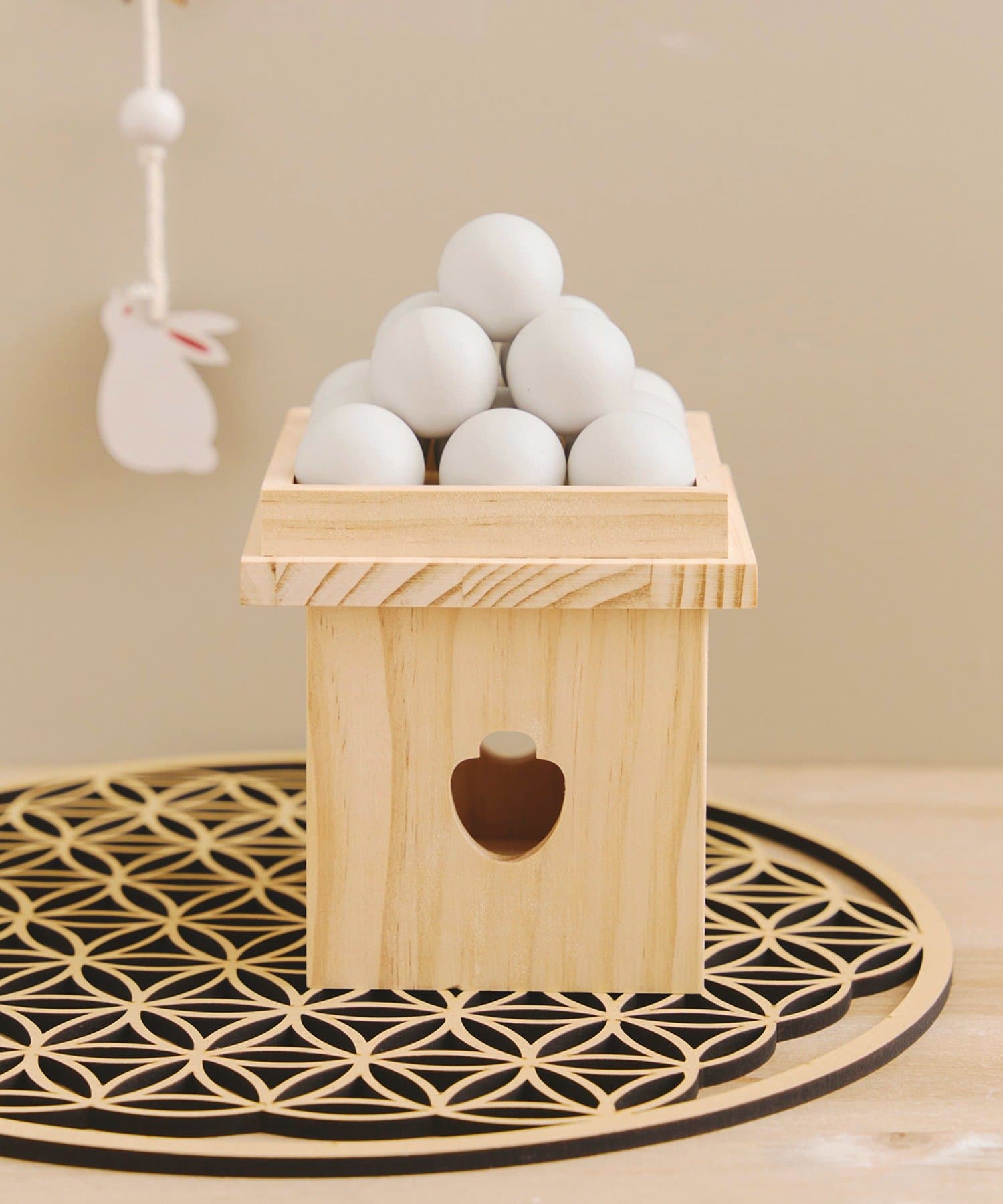 • 左:木彫りの小さいお月見団子、右:収納できるお月見団子