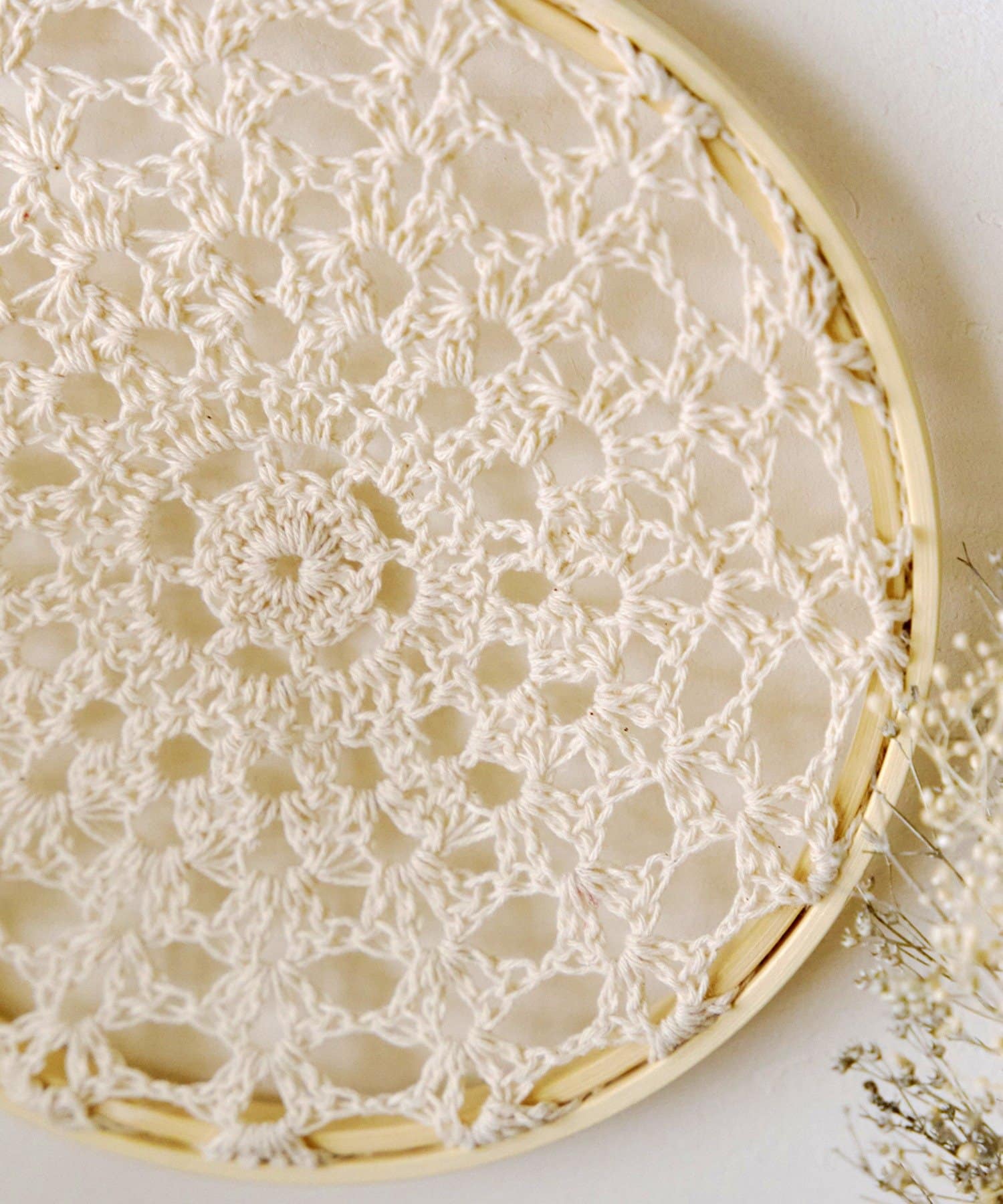 ●丸い刺繍枠にクロッシェ編みのドイリーが貼られた、ナチュラルな壁掛けパネルです。