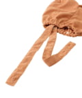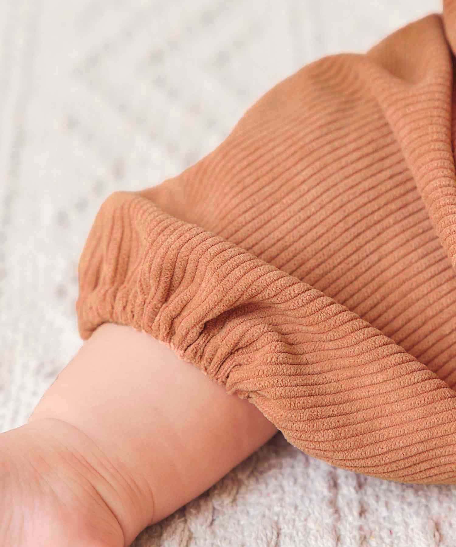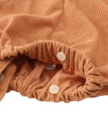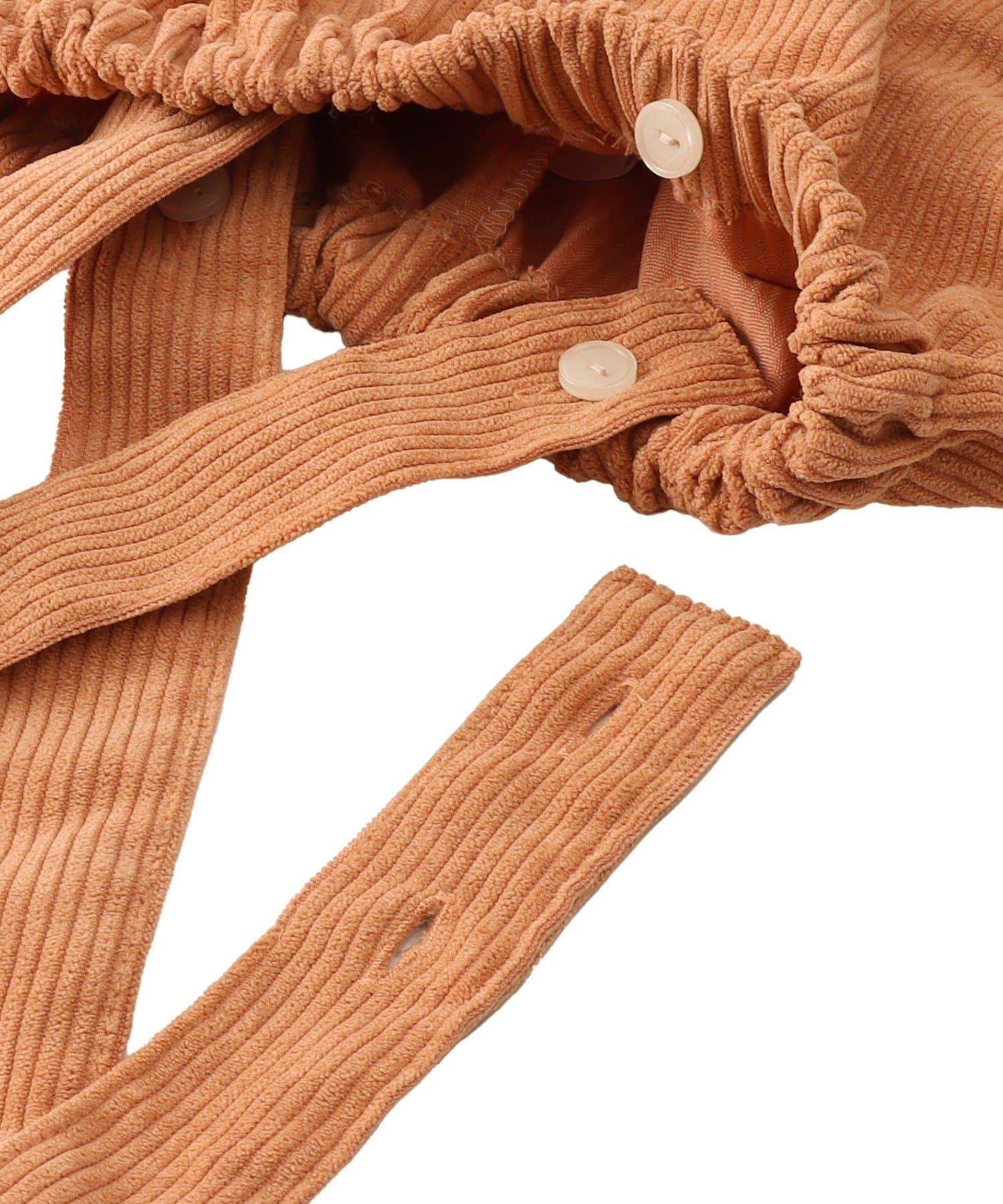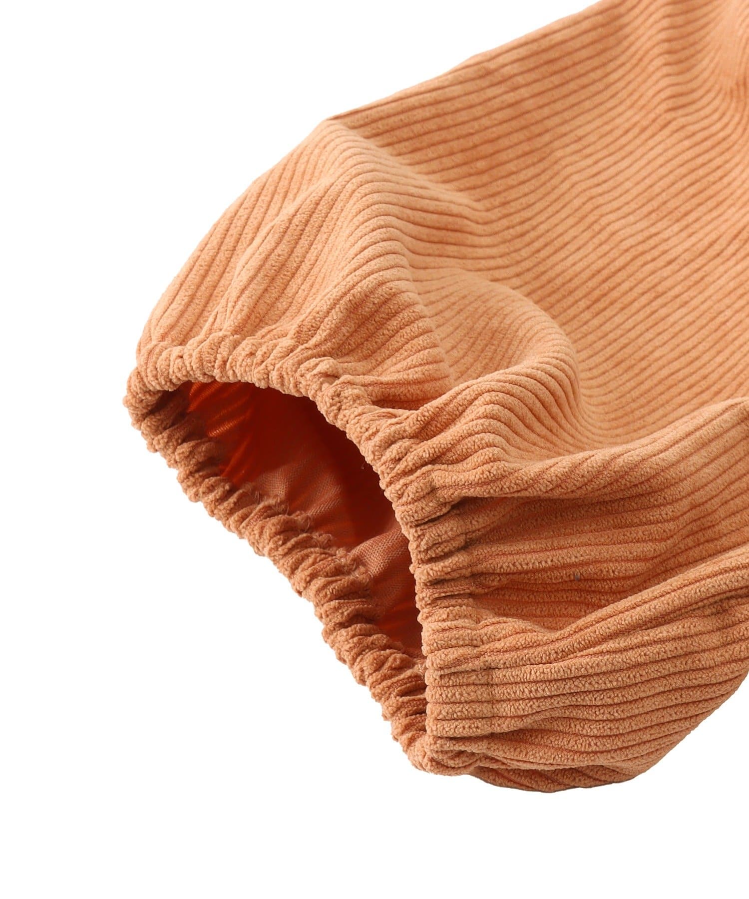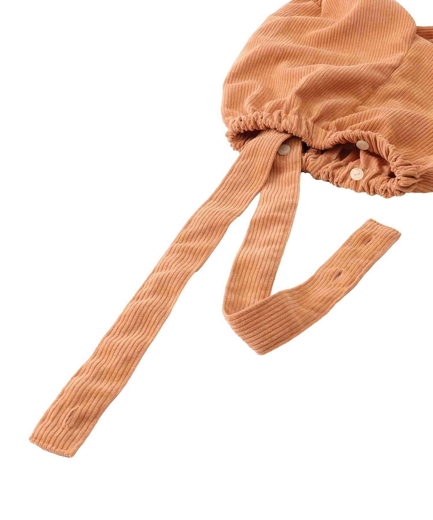●くすんだかぼちゃカラーのベロア素材で仕立てた、ベビーサロペット。