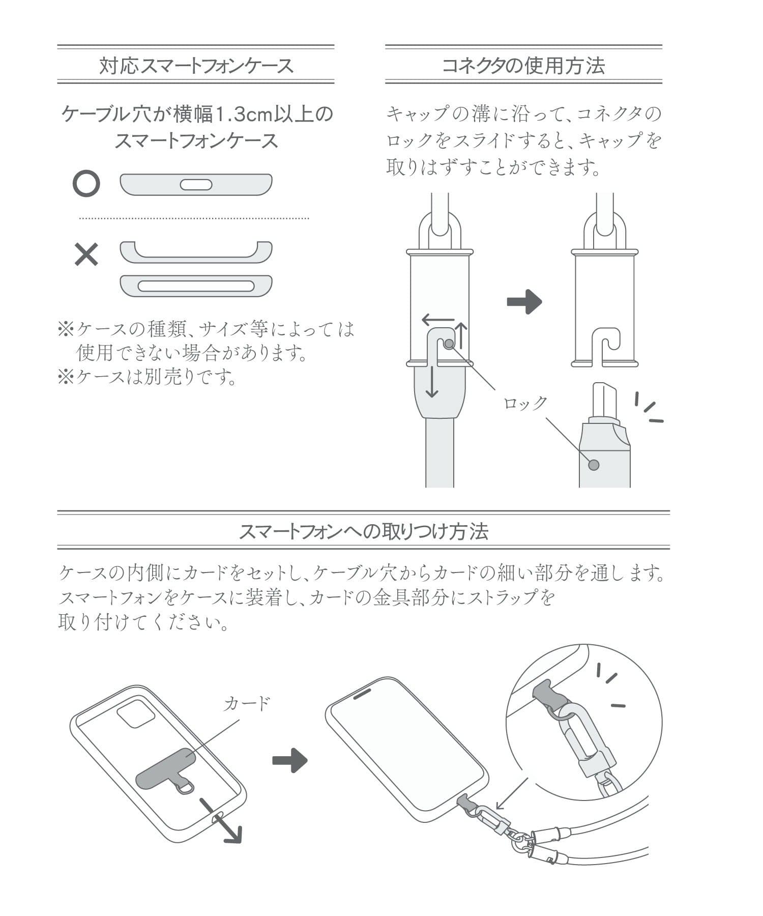 ●ショルダーストラップとして使用する際は、スマートフォンケースにしっかりと取りつけられていること、ストラップのコネクタ部分のキャップが閉じていることを確認してから使用してください。