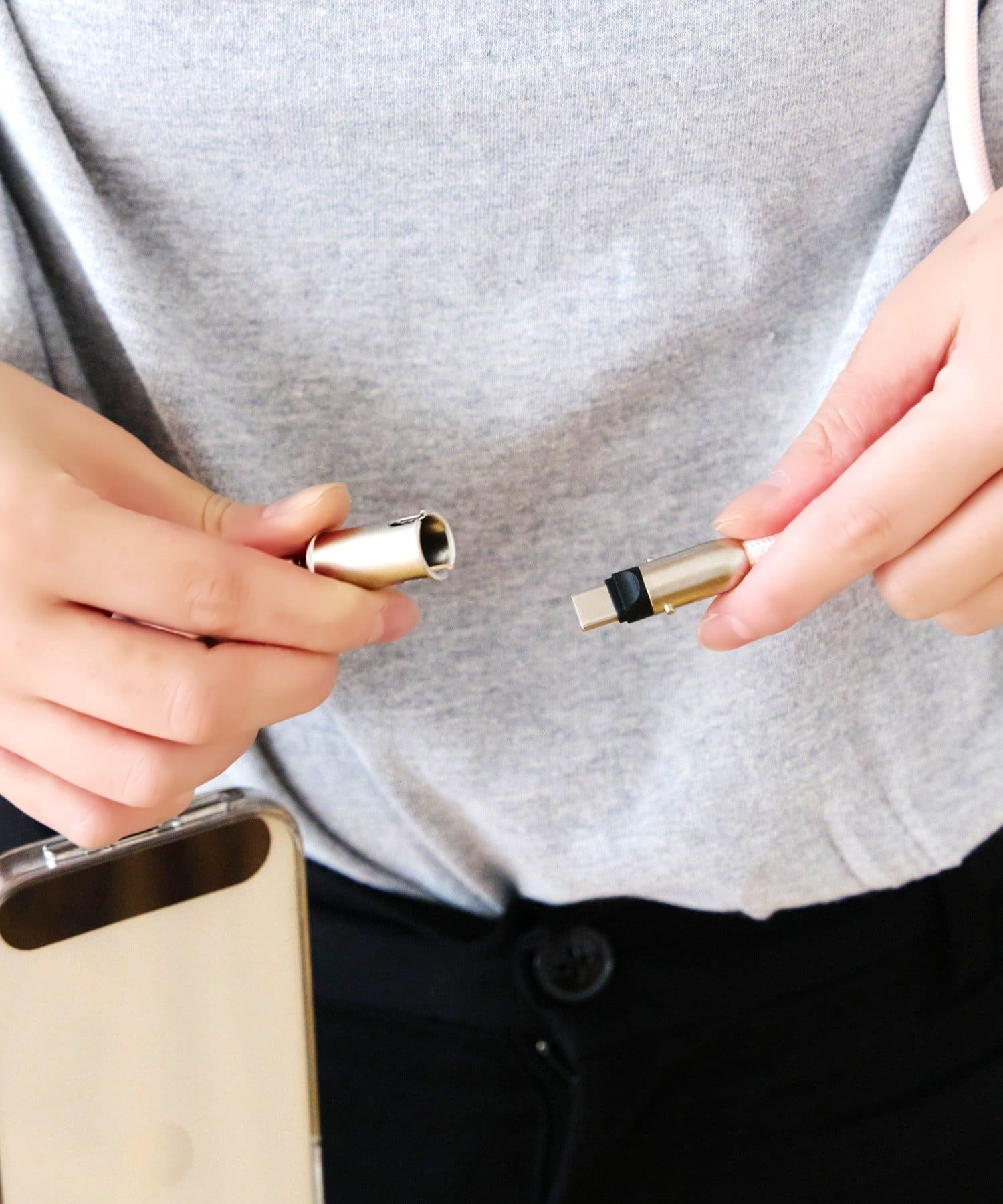 ●充電ケーブルとして使用する際は、キャップ部を取り外して対応のアダプタやモバイルバッテリーに接続するだけでお使いいただけます。