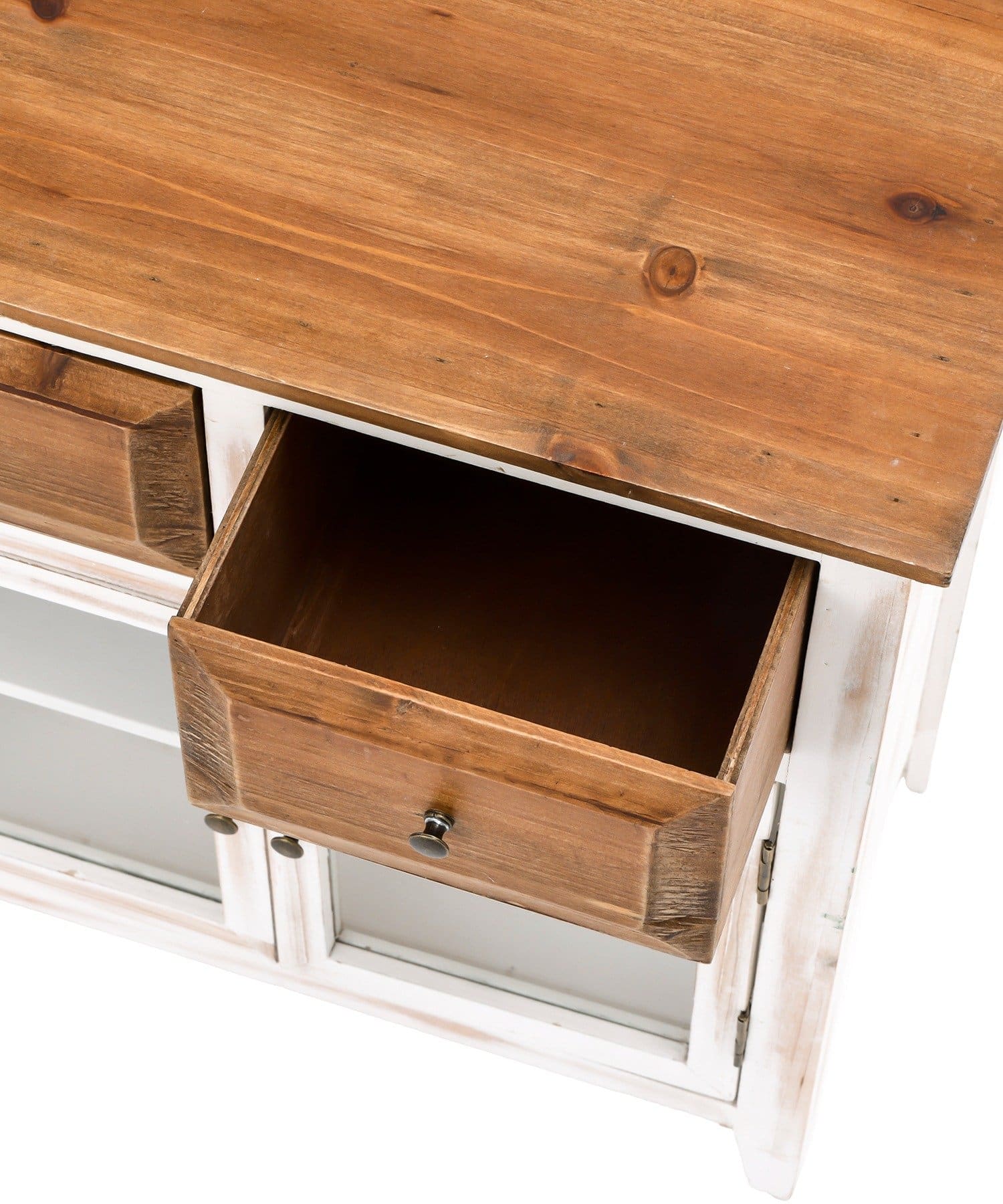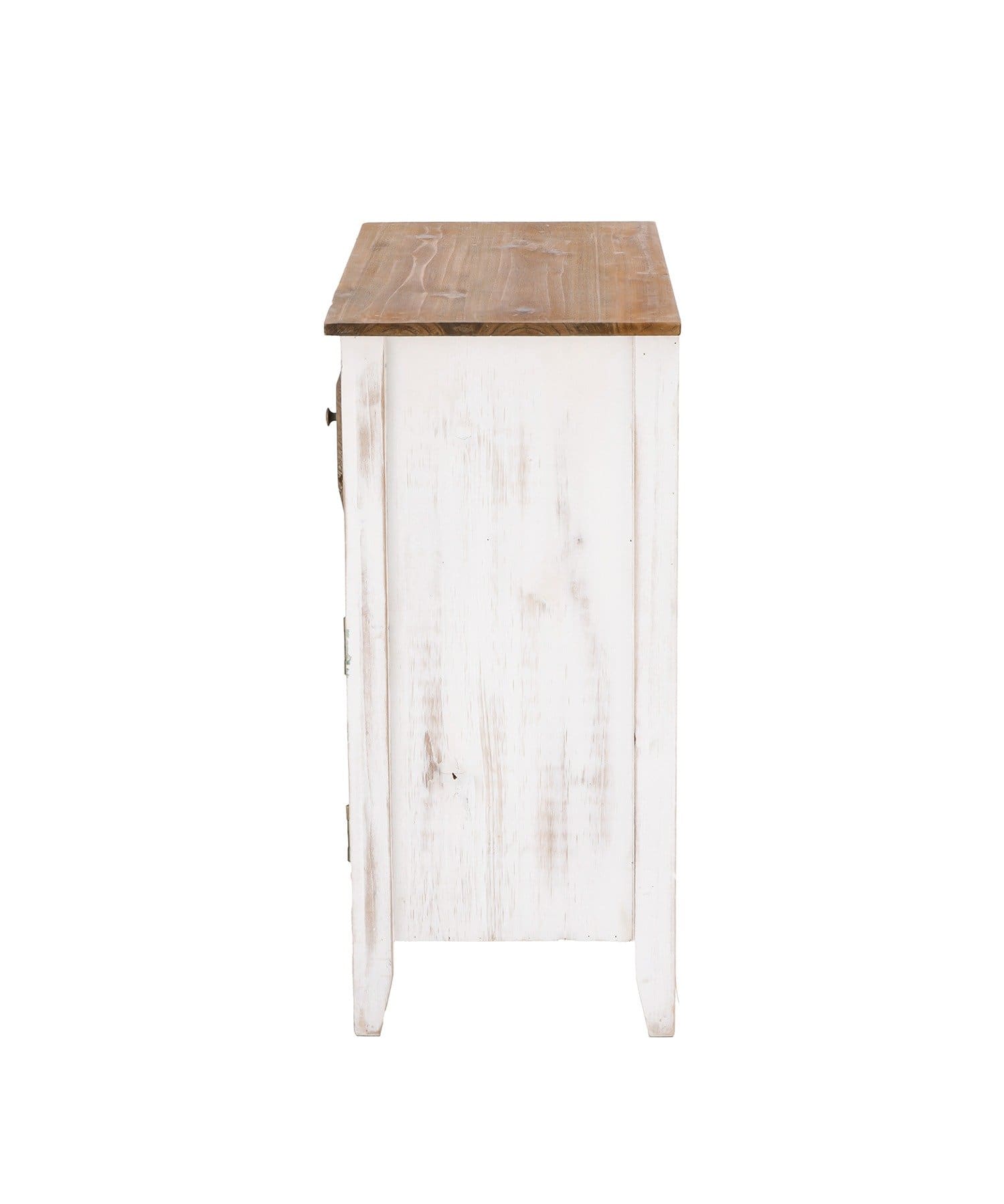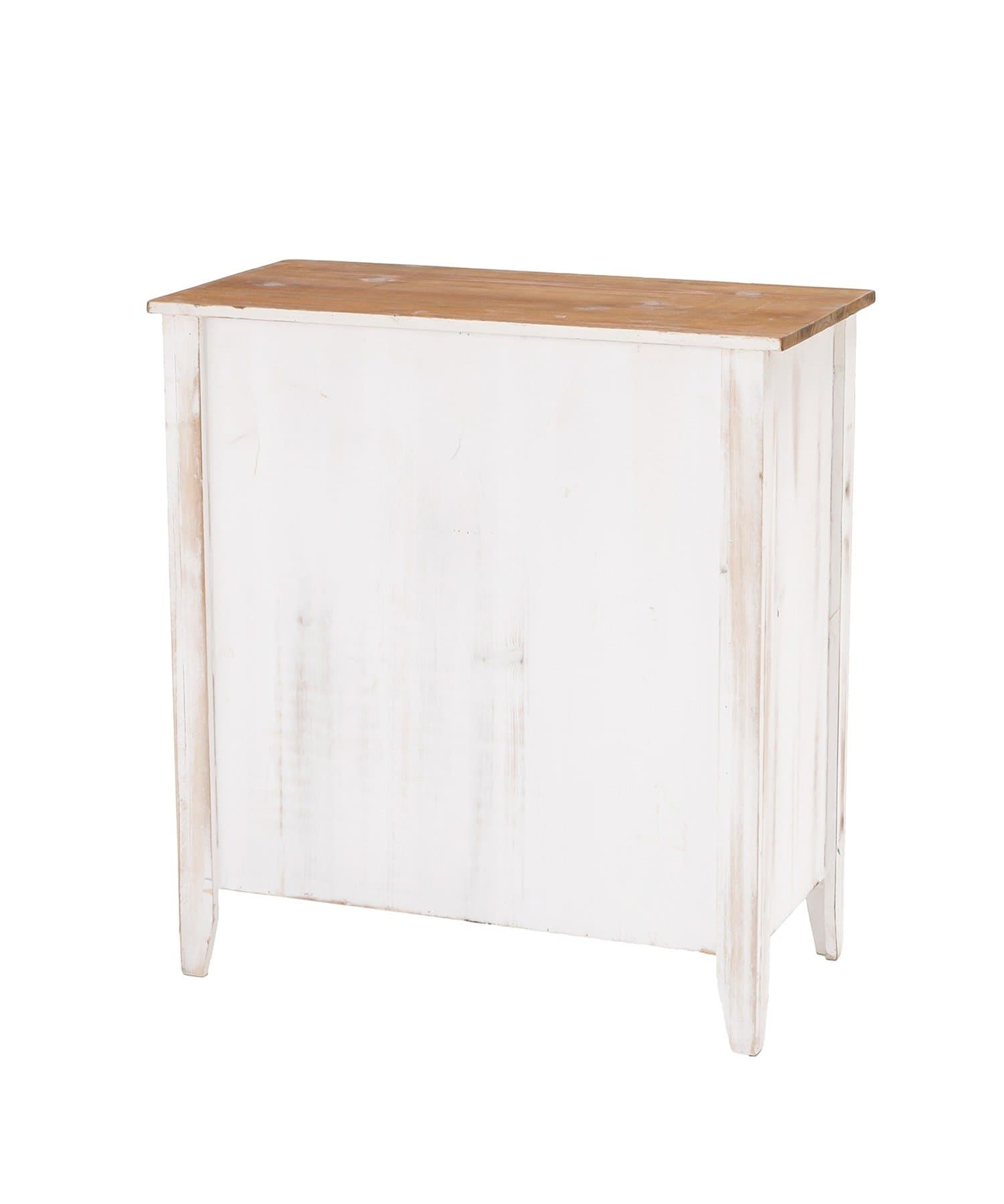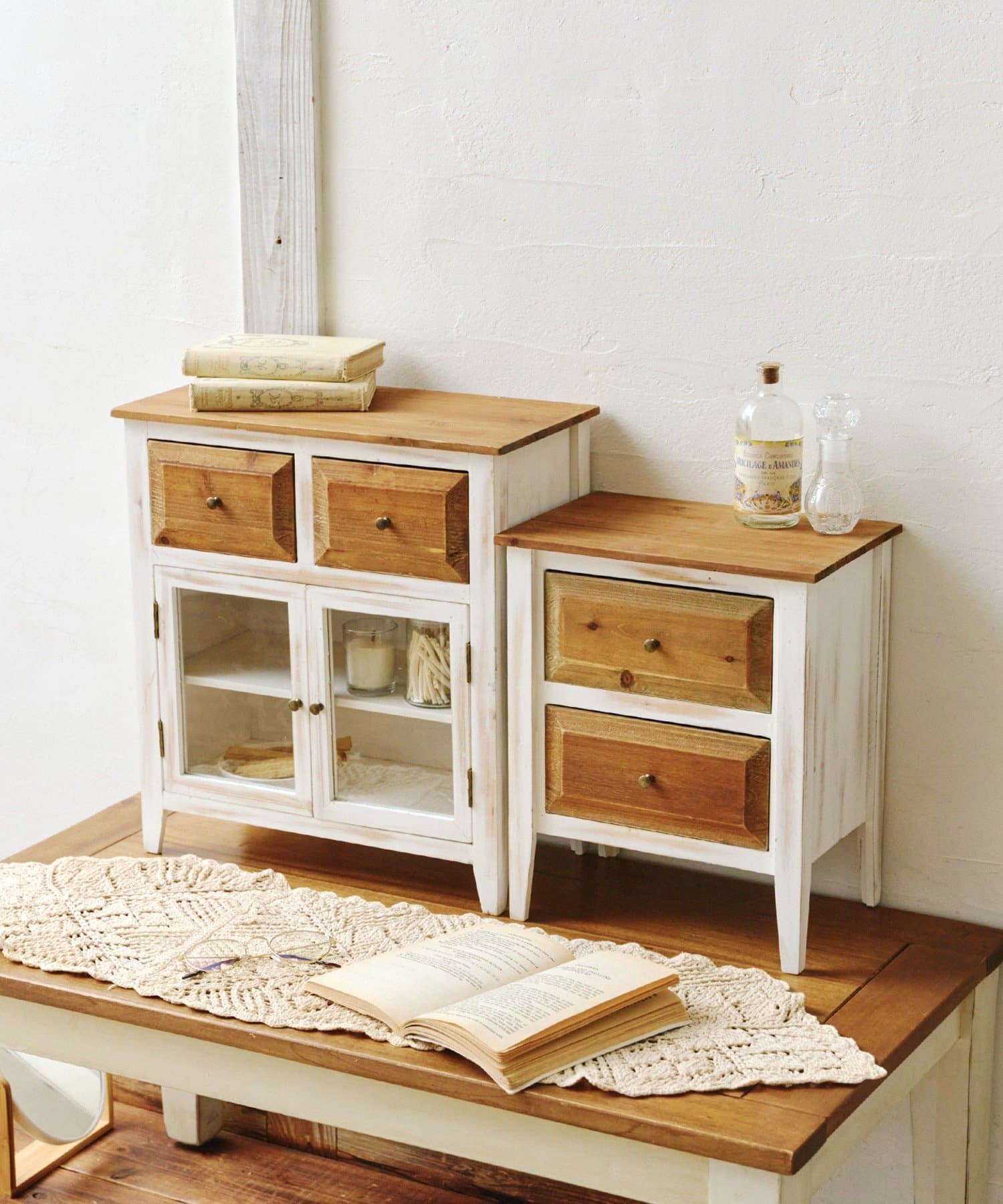 ●シャビーなホワイトとブラウンの木製天板と引き出しが魅力のドロワー付きキャビネット。