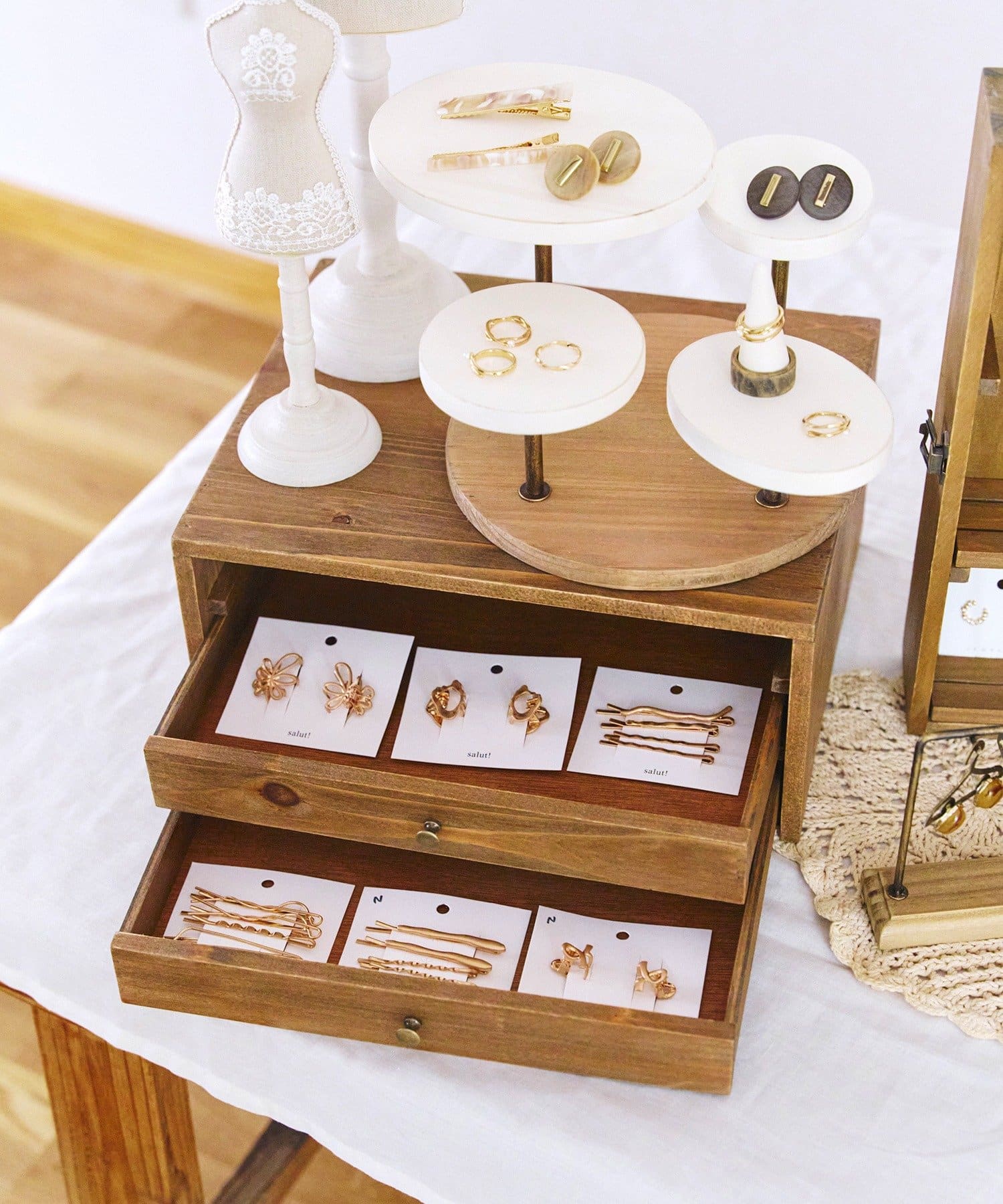 ●上に作品を飾り下段には在庫を収納するなど、マルシェやハンドメイドイベントでの商品展示にもピッタリです。