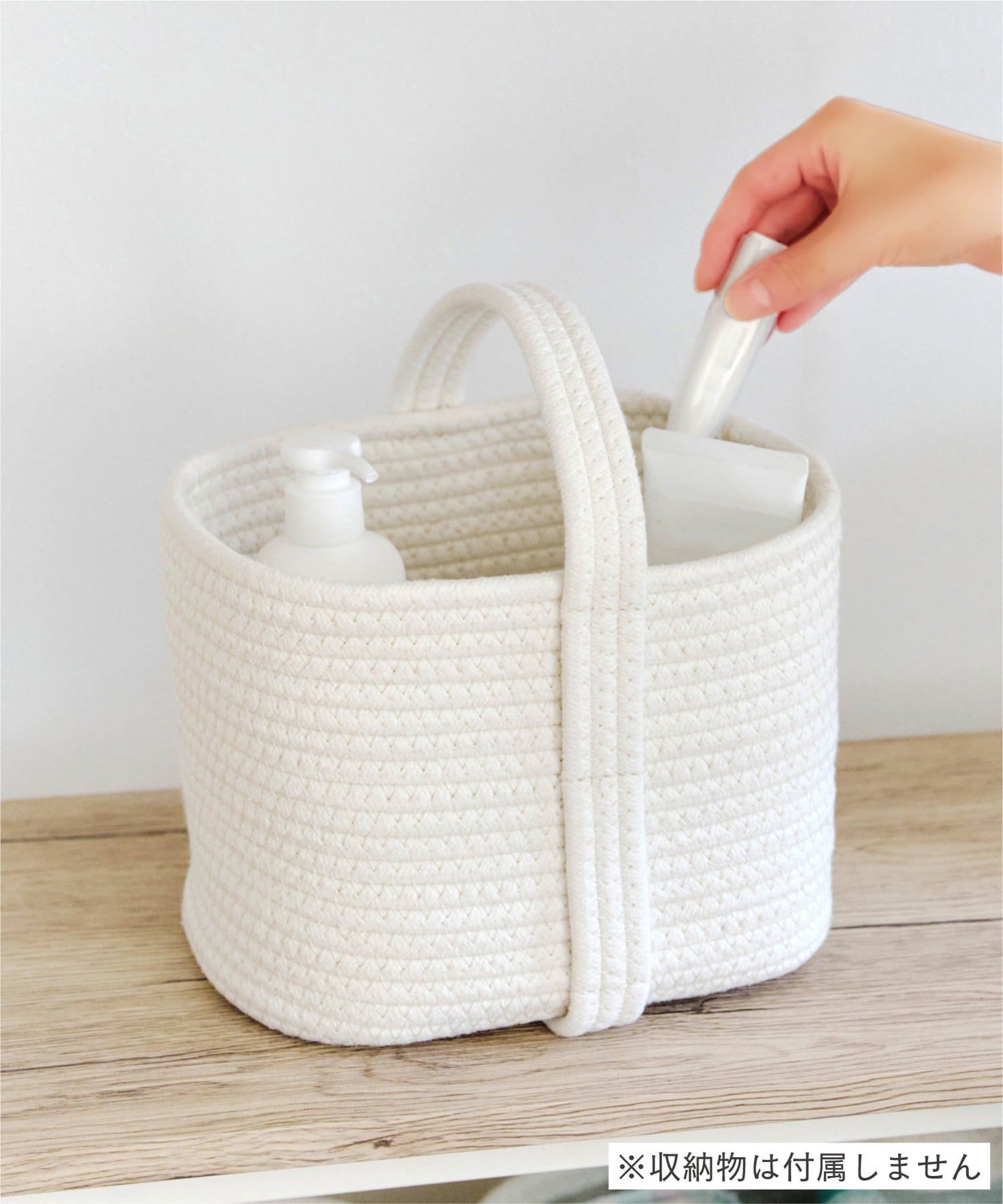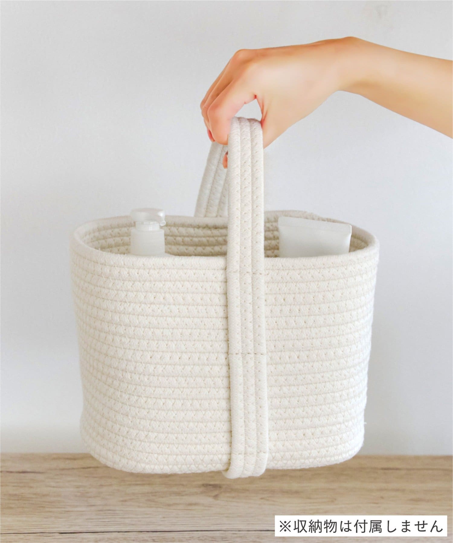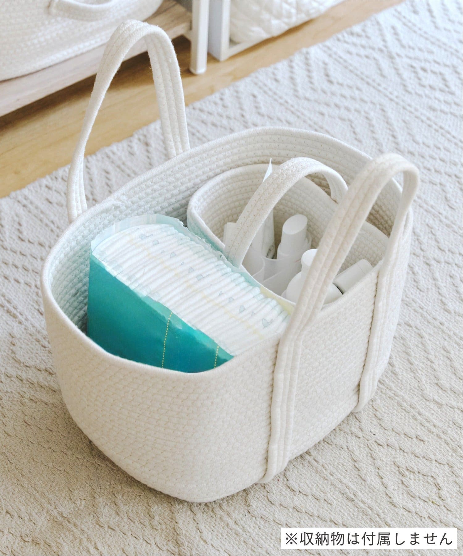 ●保湿剤、綿棒、つめきり、体温計、おしりふきなどベビーのお世話セットをまとめて収納できるロープバスケット。
