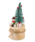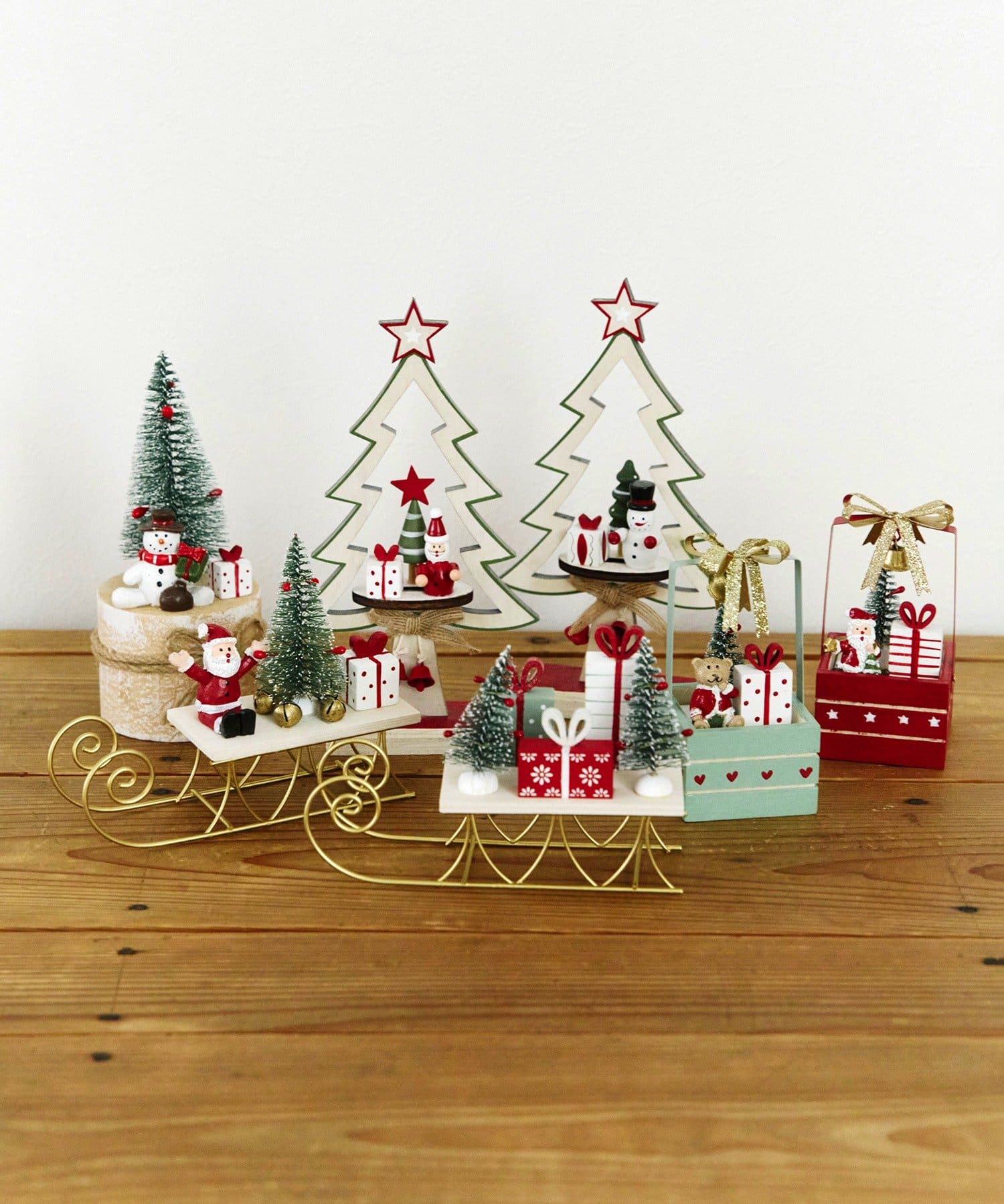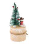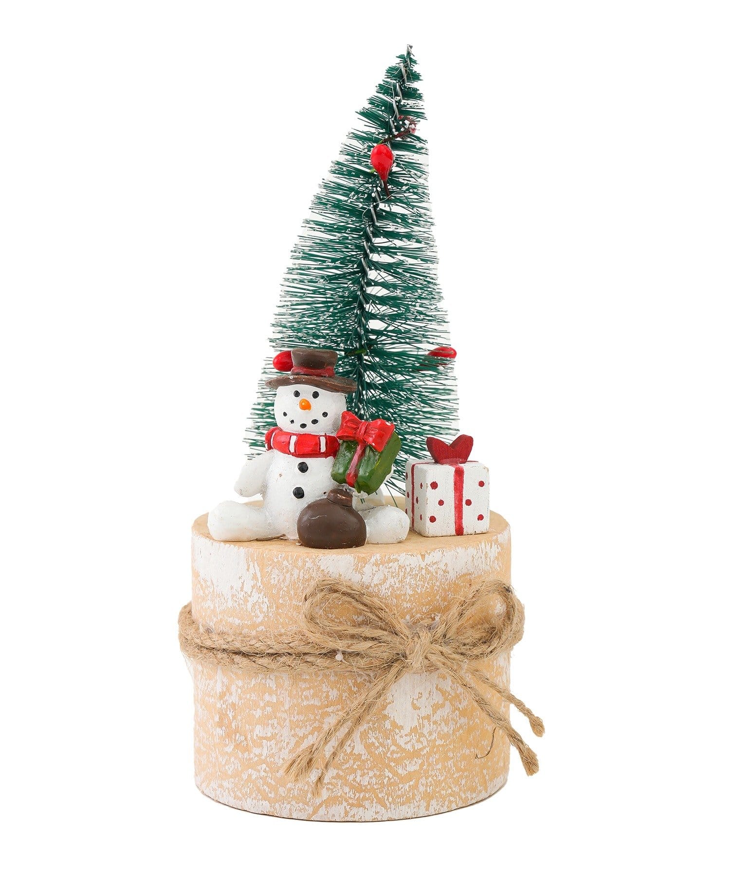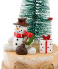 ●木目調の切り株ベースに、白いスノーマンと小さな緑のツリーが乗せられ、赤いリボンやプレゼントボックスがアクセントに。