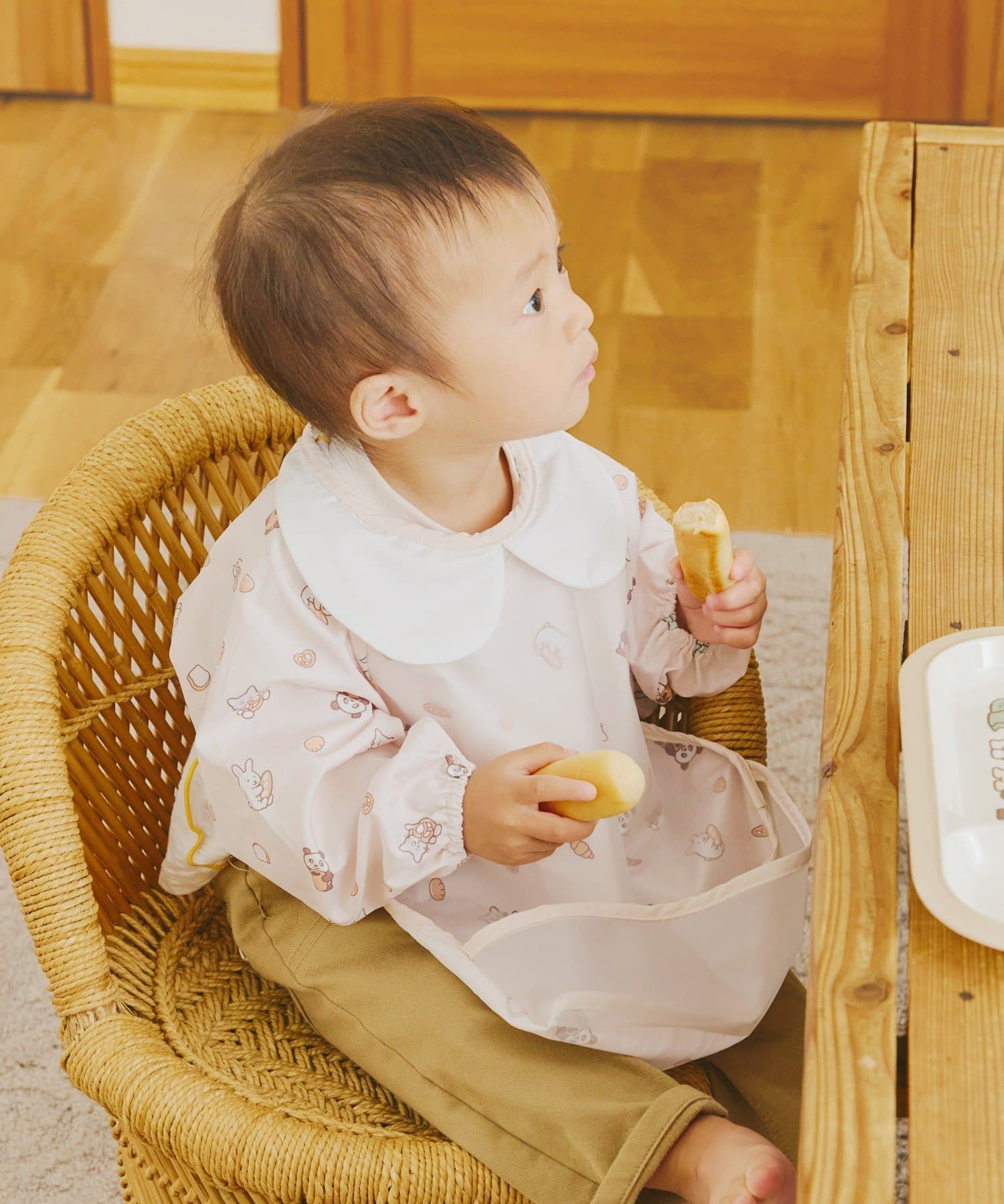 ●スモックのポケットは食べこぼし受けとしてご使用ください。ポケットに食品やその他のものを入れないでください。重さで首に負担がかかります。