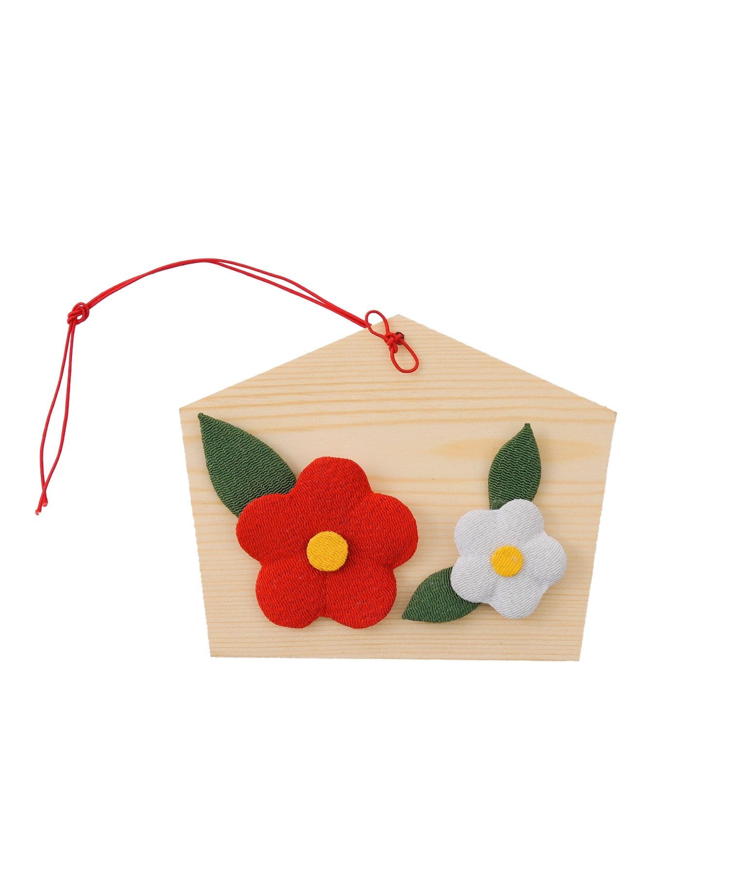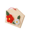 ●ちりめん素材の椿モチーフがあしらわれた絵馬オブジェ。