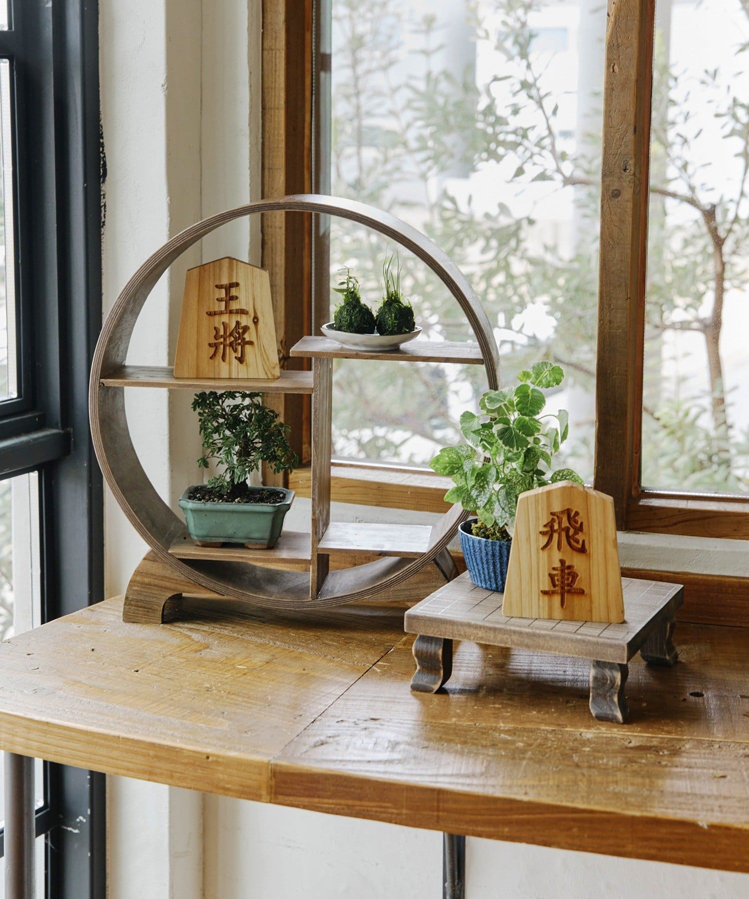 円形ラック/苔玉と盆栽
