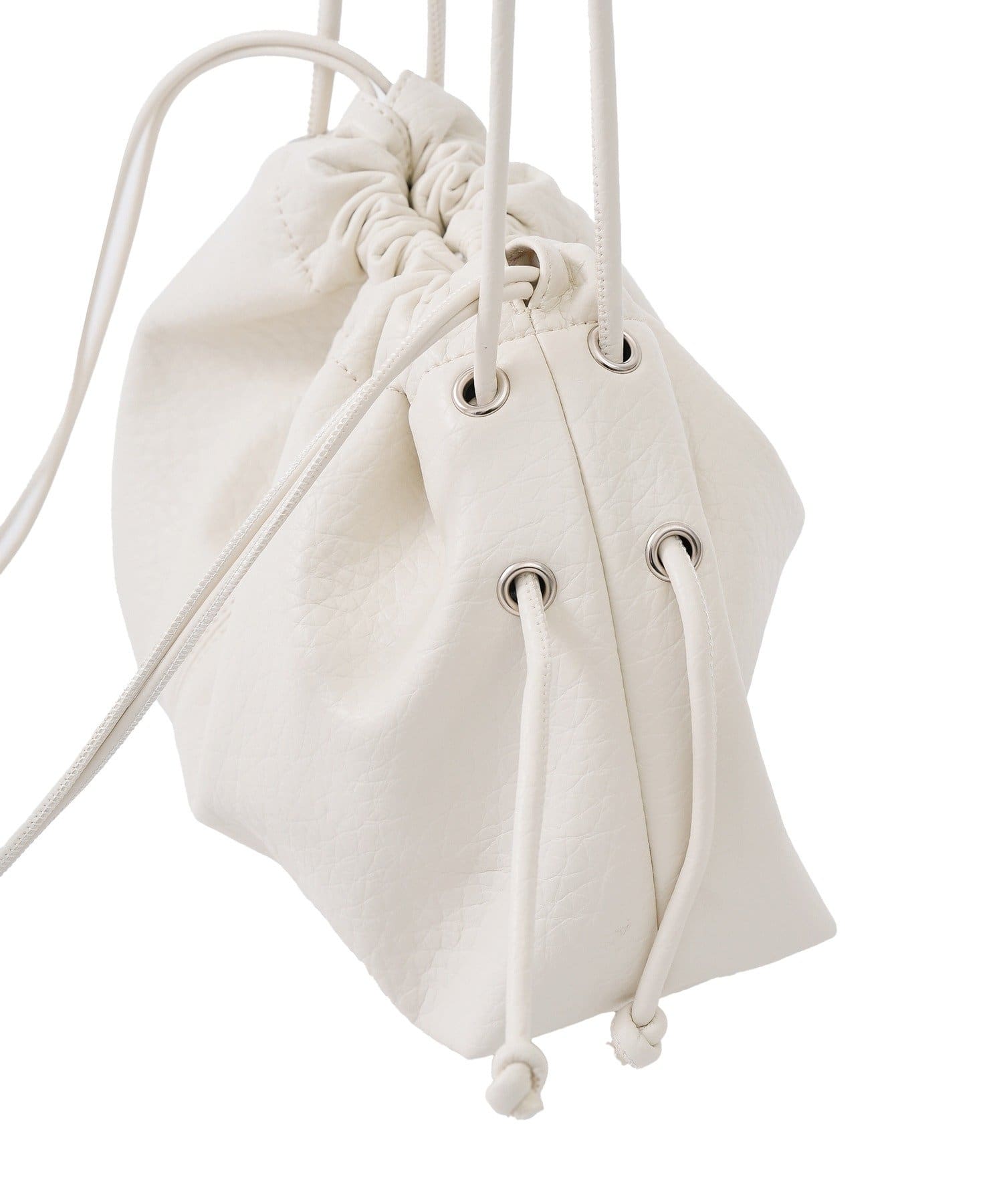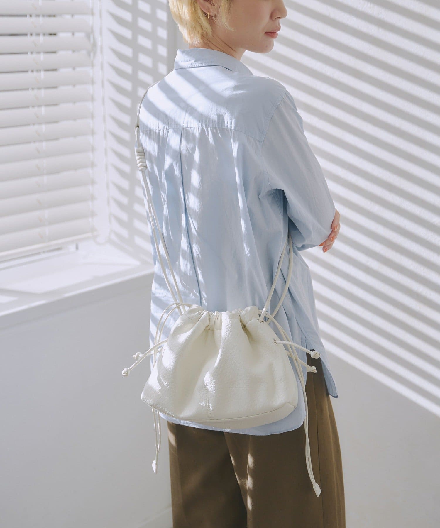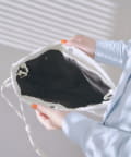 ●巾着のように絞れる、ドローストリングショルダーバッグ。