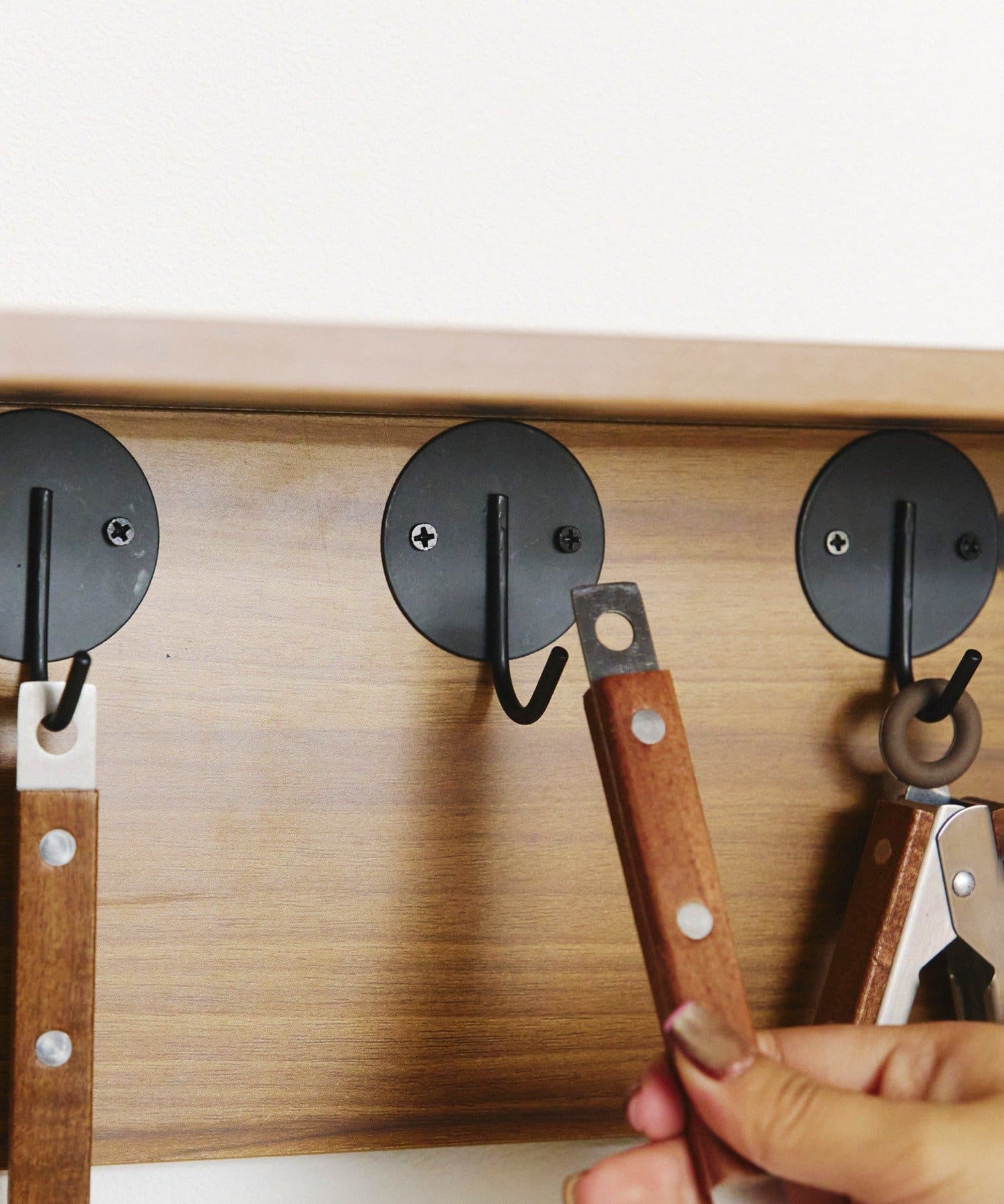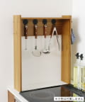 ●上段に調味料やキッチンツールを置き、下のフックでお玉やミトンをサッと掛けられます。