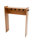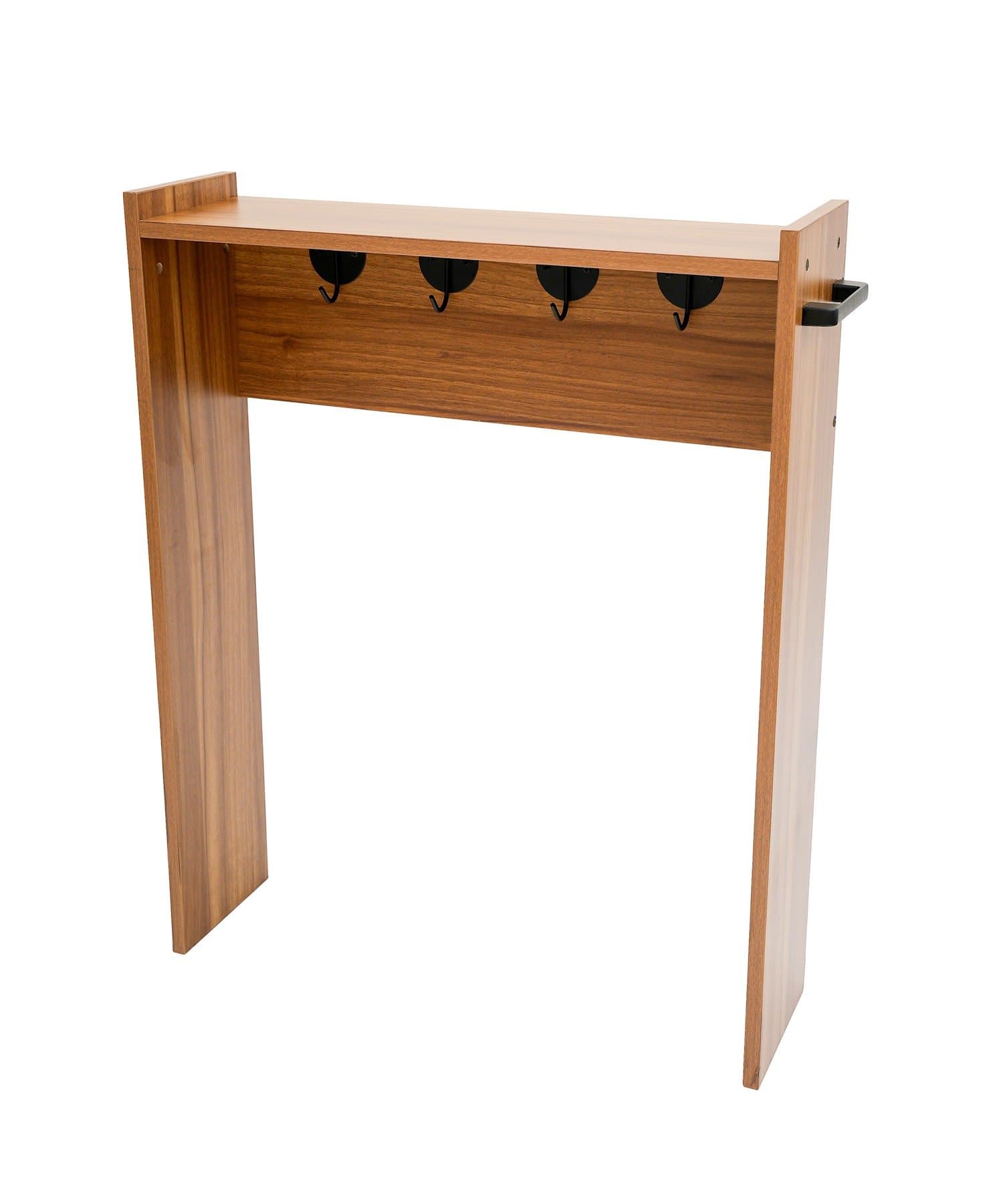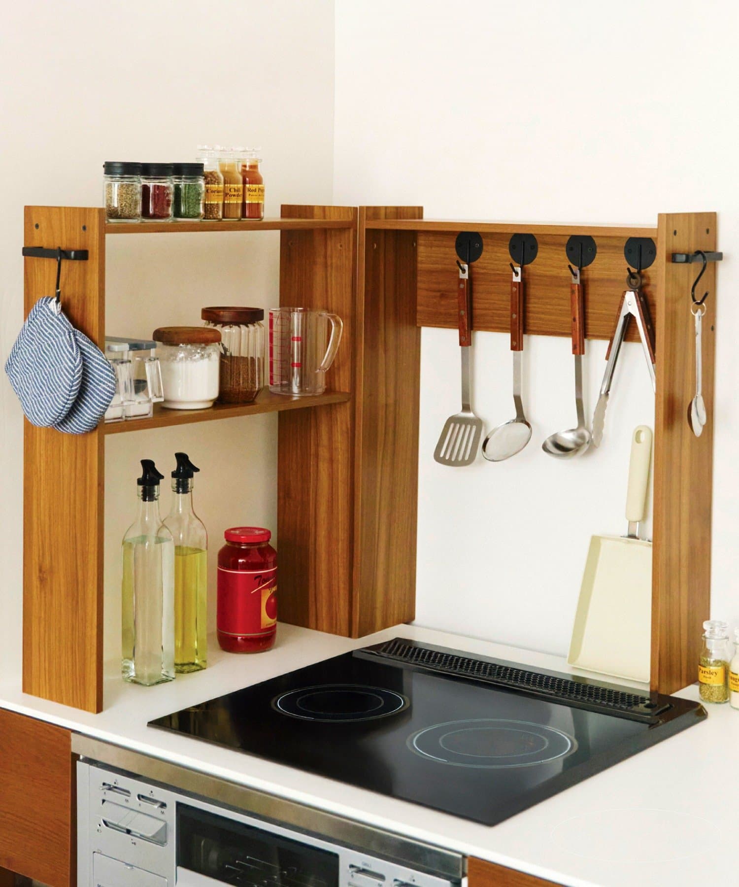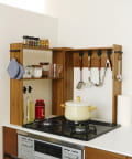 ●コンロ横に置ける木目調サイドラックに、便利なフックバーが付いたラック。