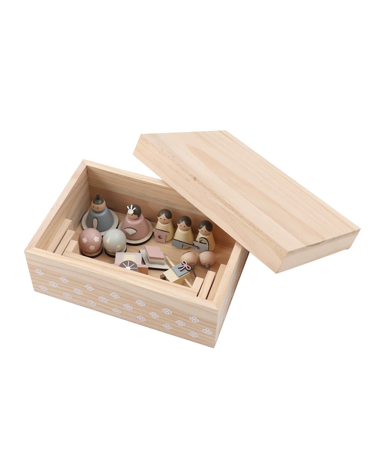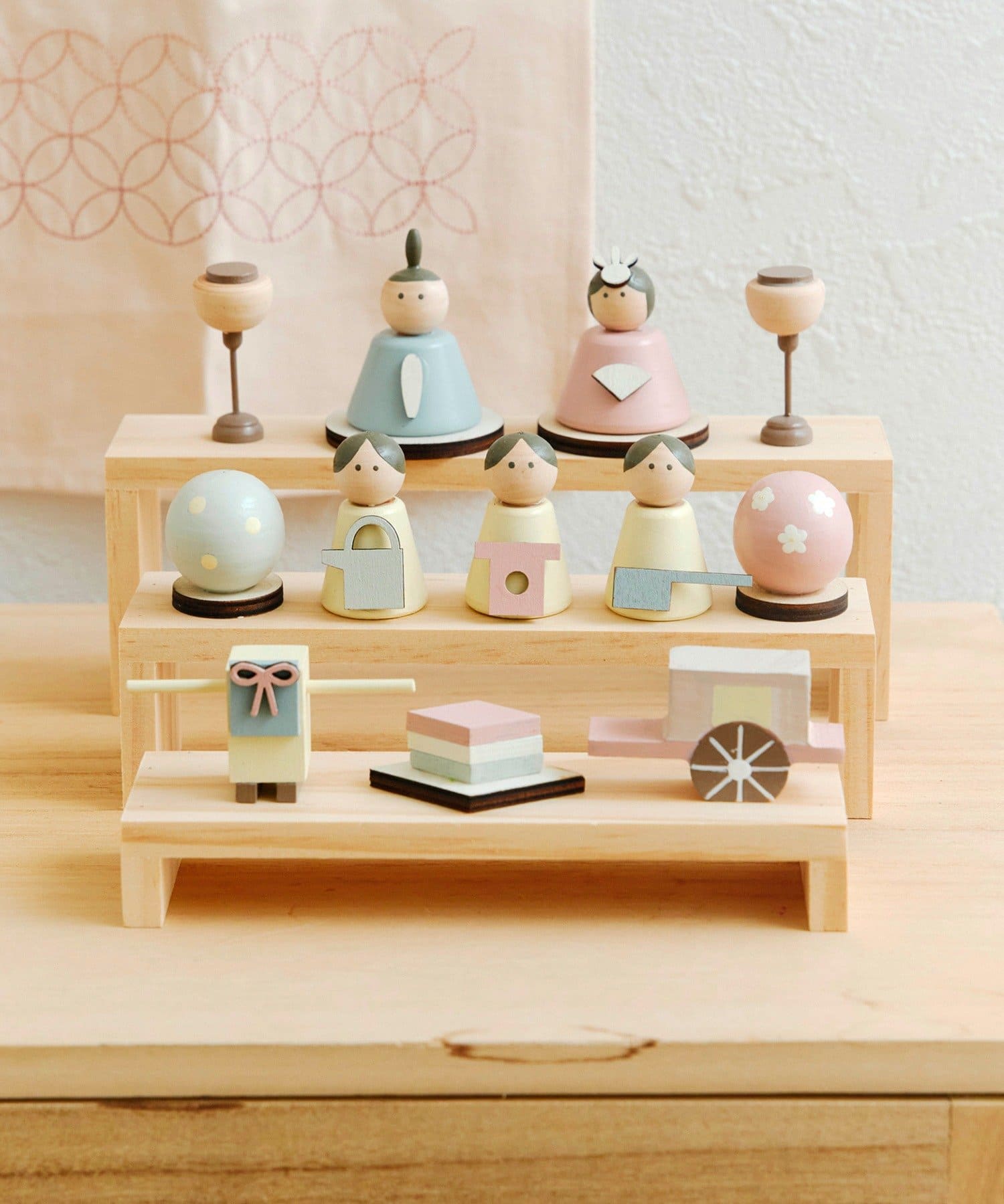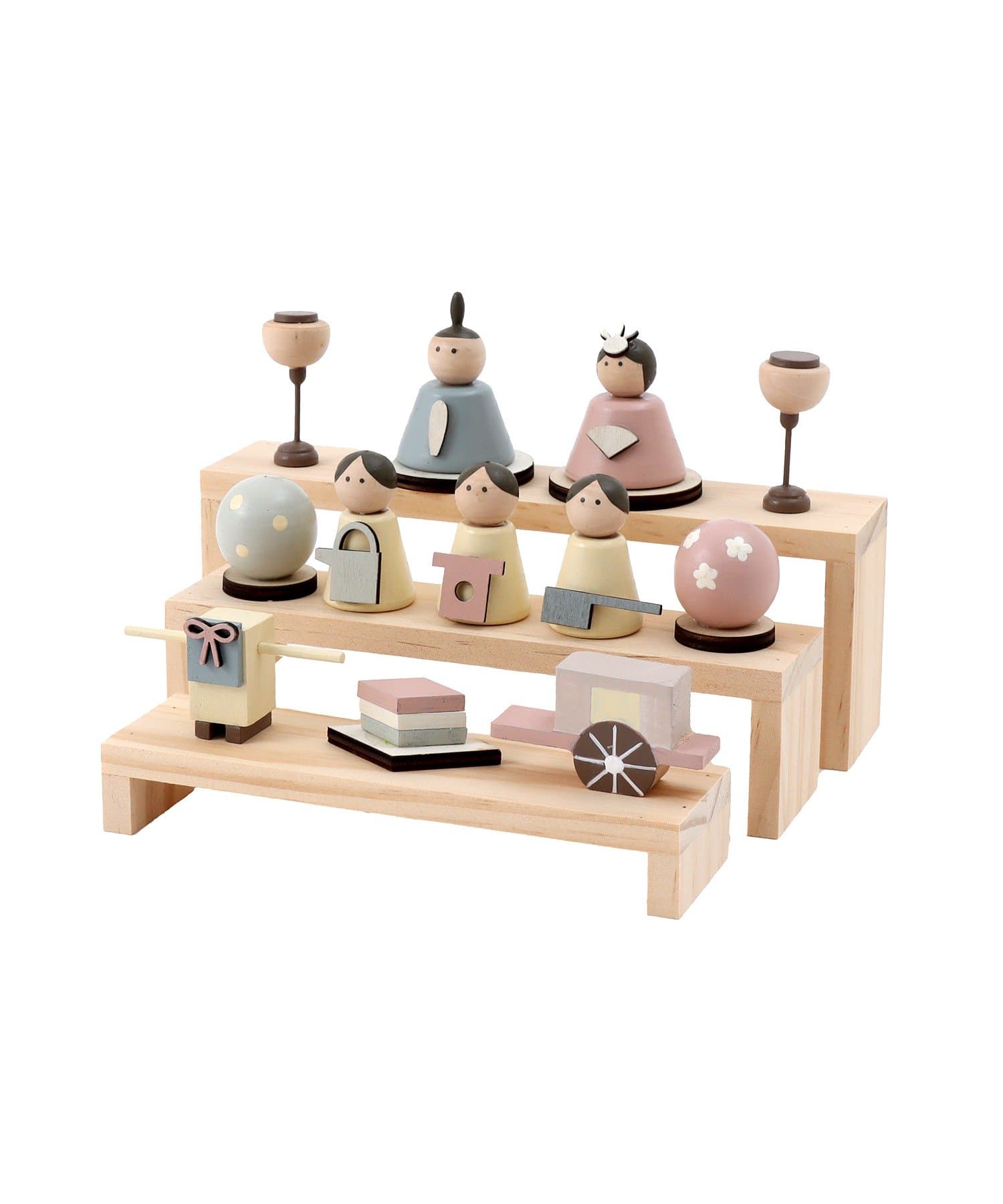 ●優しいパステルカラーと丸みのあるフォルムが可愛い、収納できる木製雛人形セット。