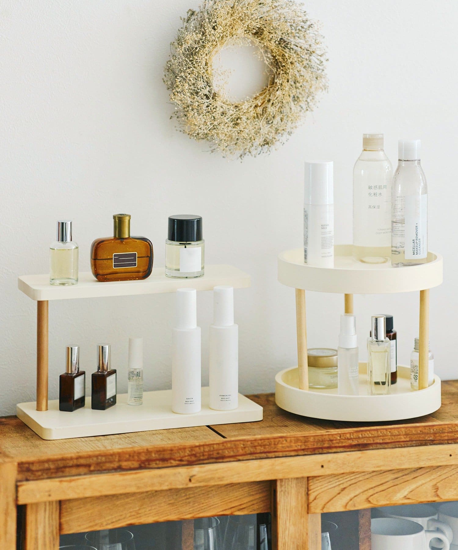 ●くるっと回して必要なアイテムをサッと取れる、回転式コスメ収納。