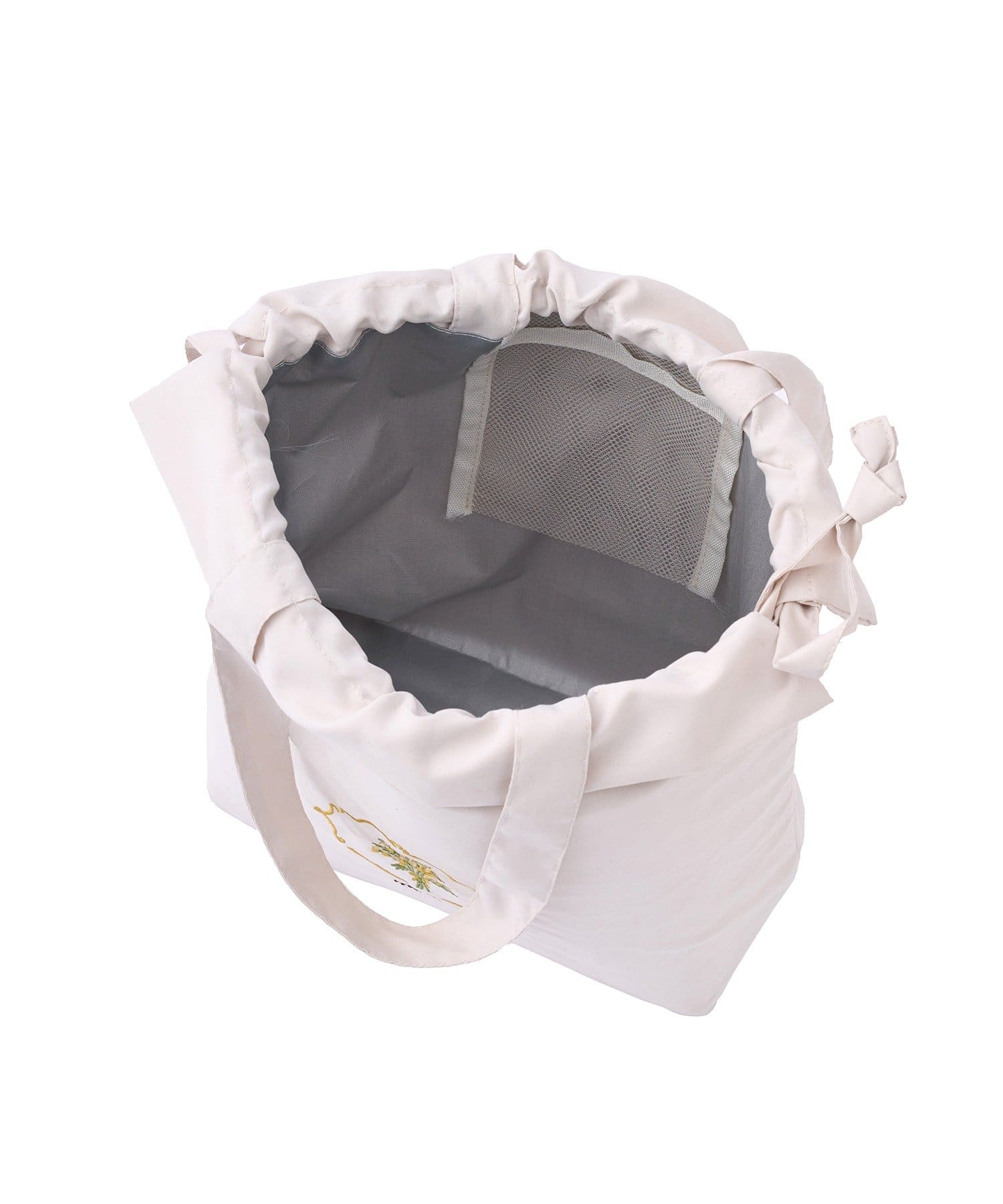 ●ミモザの花束が優しく刺繍された、保冷機能付きのオシャレな巾着バッグ。