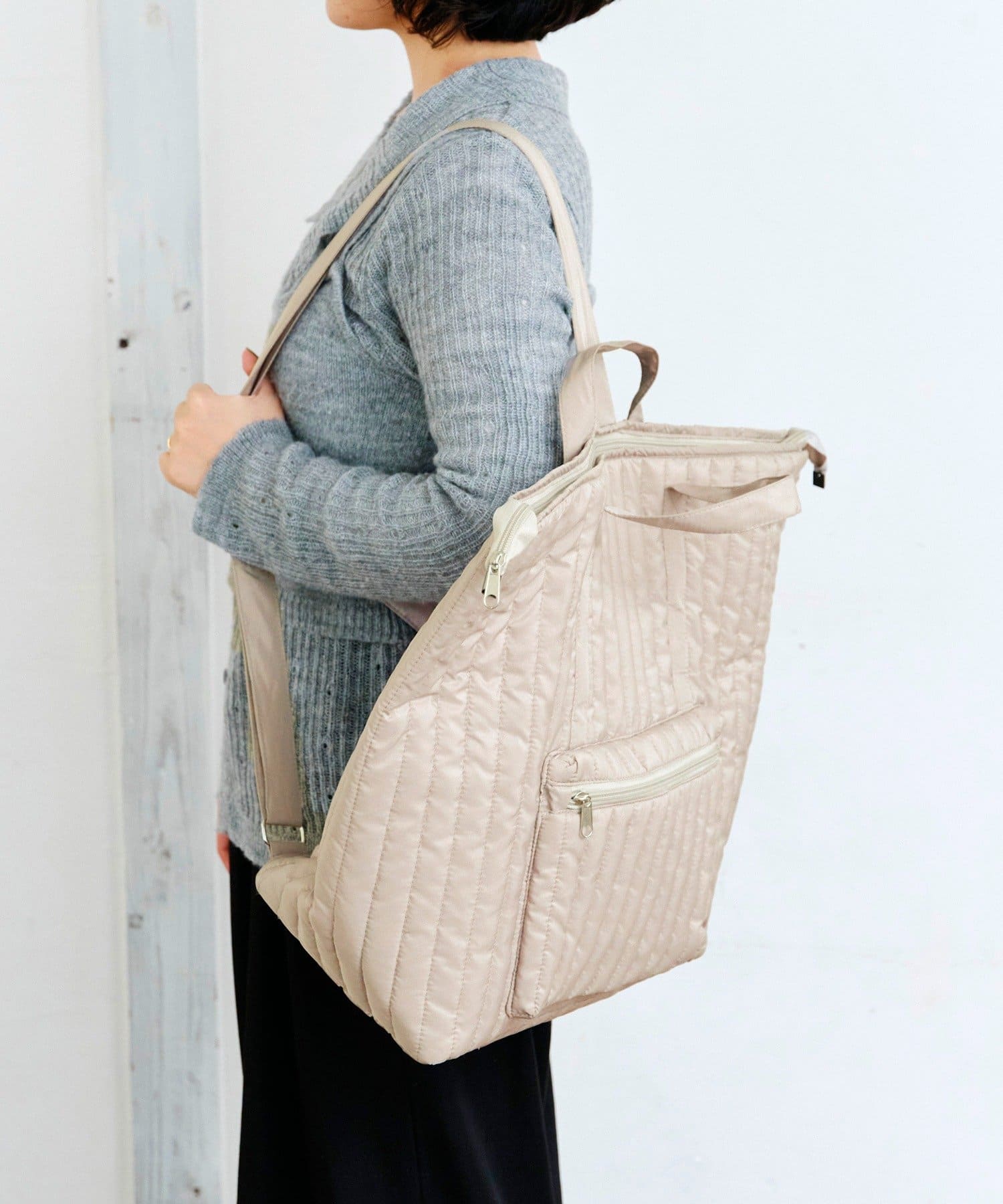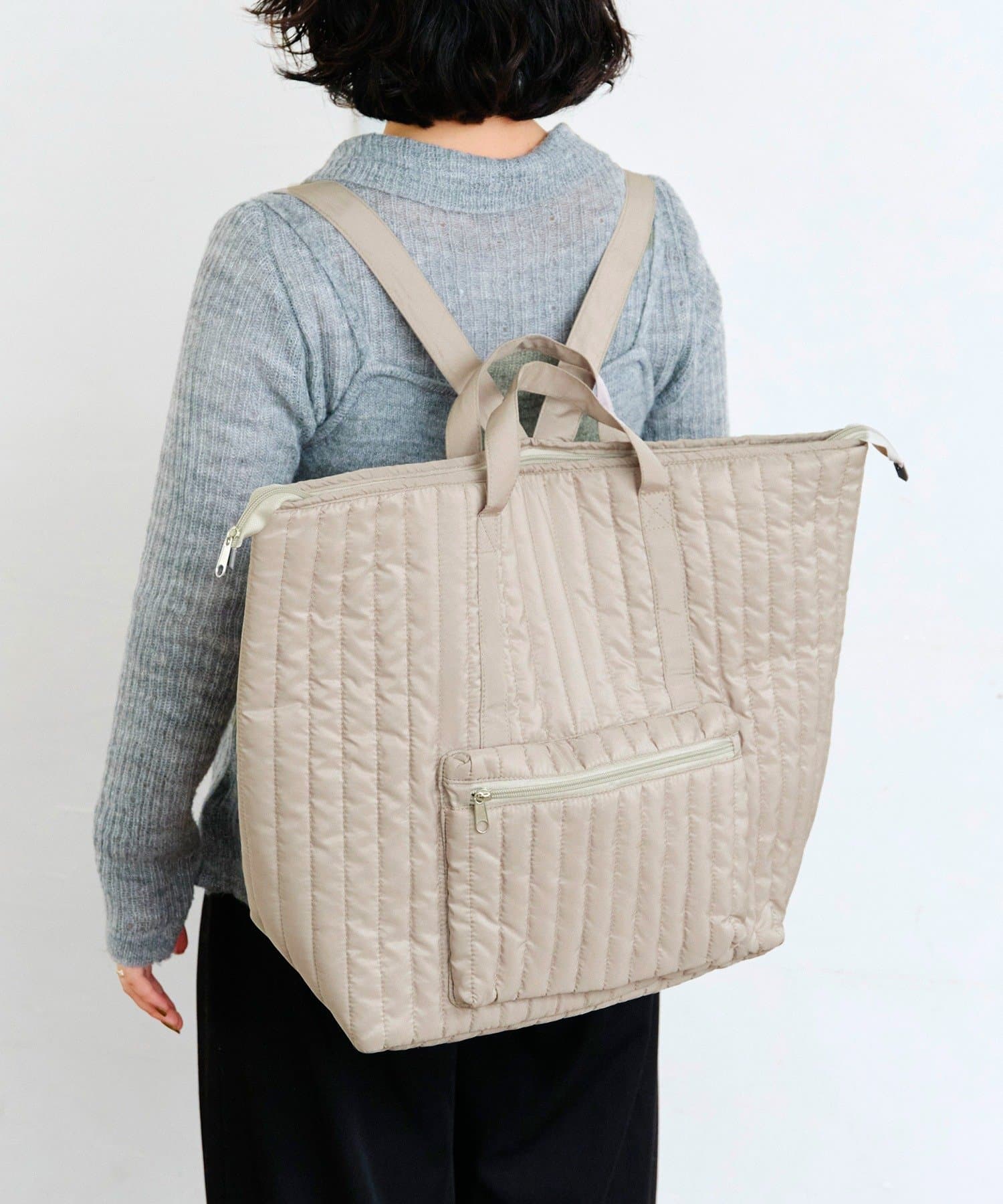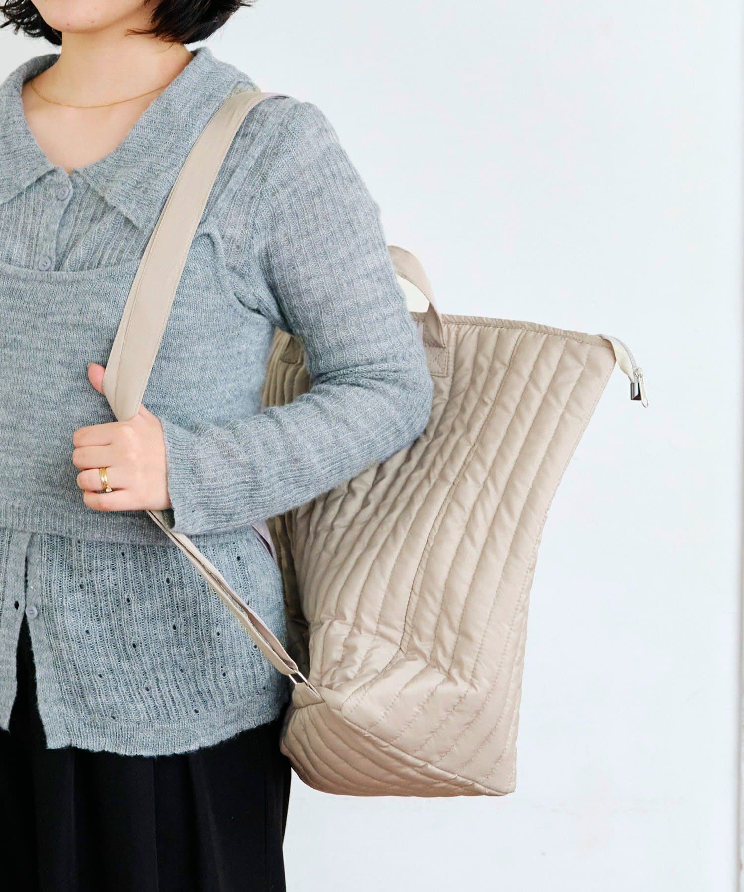 ●ふんわりとした縦キルティングのデザインが上品で、エコバッグ感が出すぎず、いつものコーディネートにもおしゃれに馴染みます。