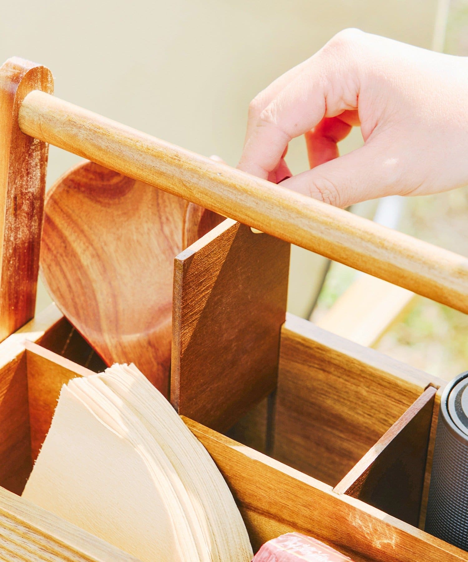 ●カトラリーやコーヒーグッズなどをまとめて収納でき、持ち運びもスムーズです。