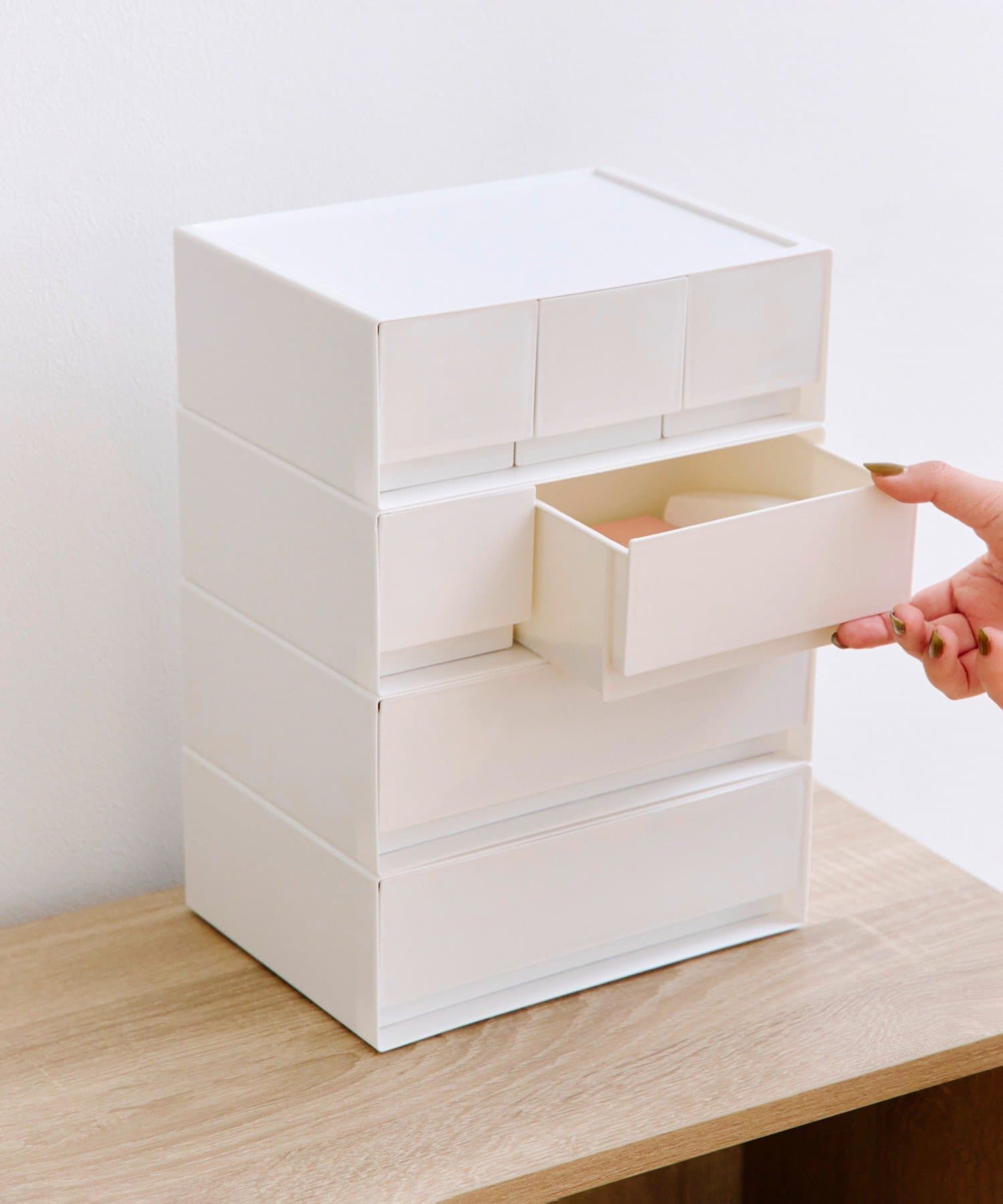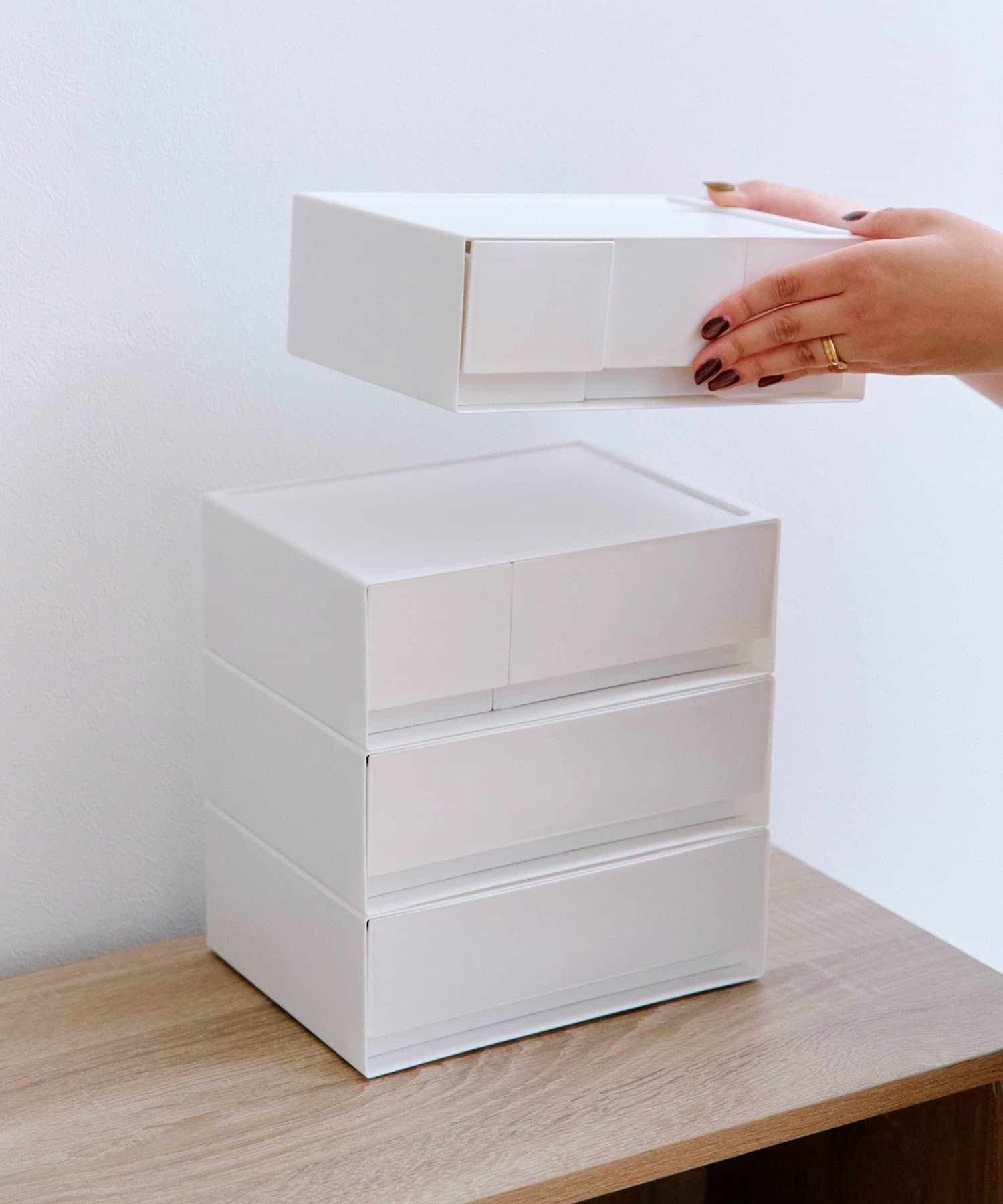 ●用途に合わせてスタッキング3引き出しボックス、スタッキング引き出しボックスと自由に組み合わせて、上に3個までスタッキングが可能です。