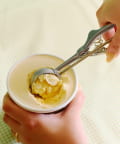 ●カップアイスクリームをすくってレバーを握るだけで、丸くきれいな形に盛り付けられます。