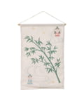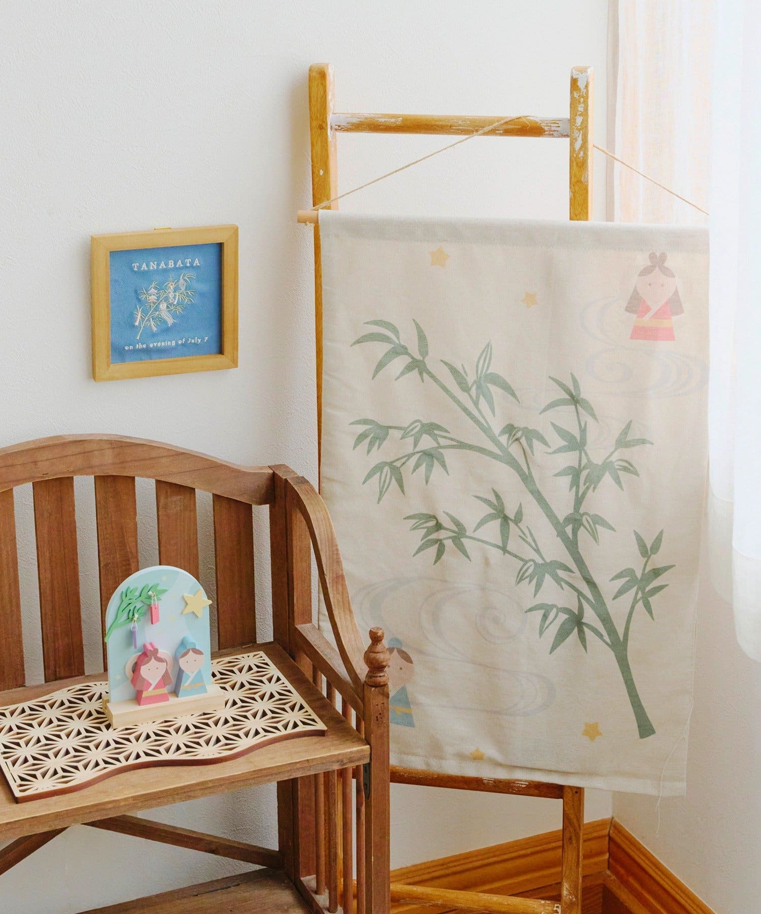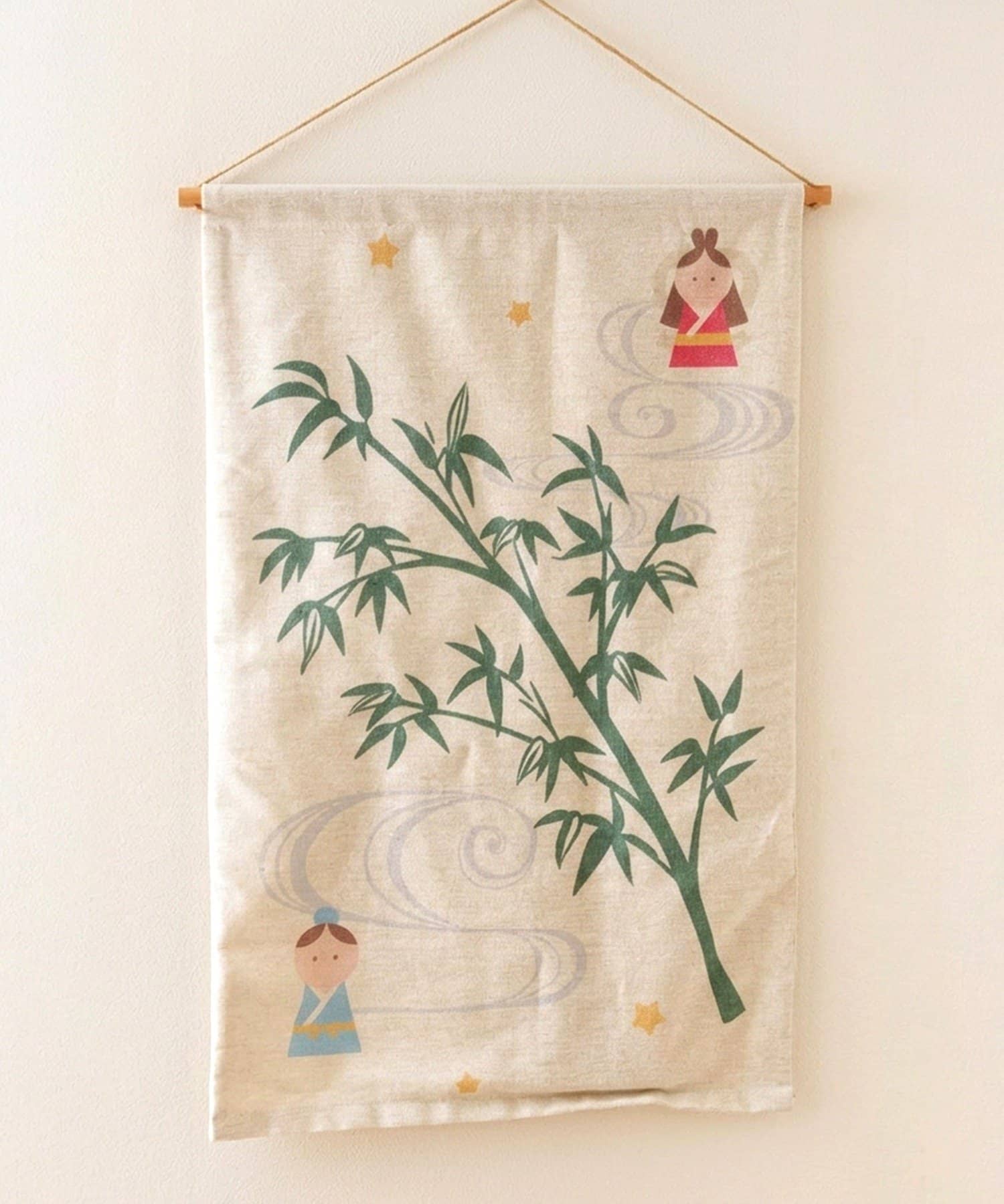 ●夜空を彩る天の川を背景に、大きな笹の枝が中央に描かれた、物語性を感じるロマンチックな七夕タペストリー。