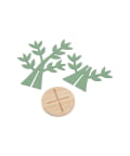 ●2枚の笹の葉パネルを十字に組み合わせ、円形の土台に差し込むことで完成する、立体的な笹のスタンド。