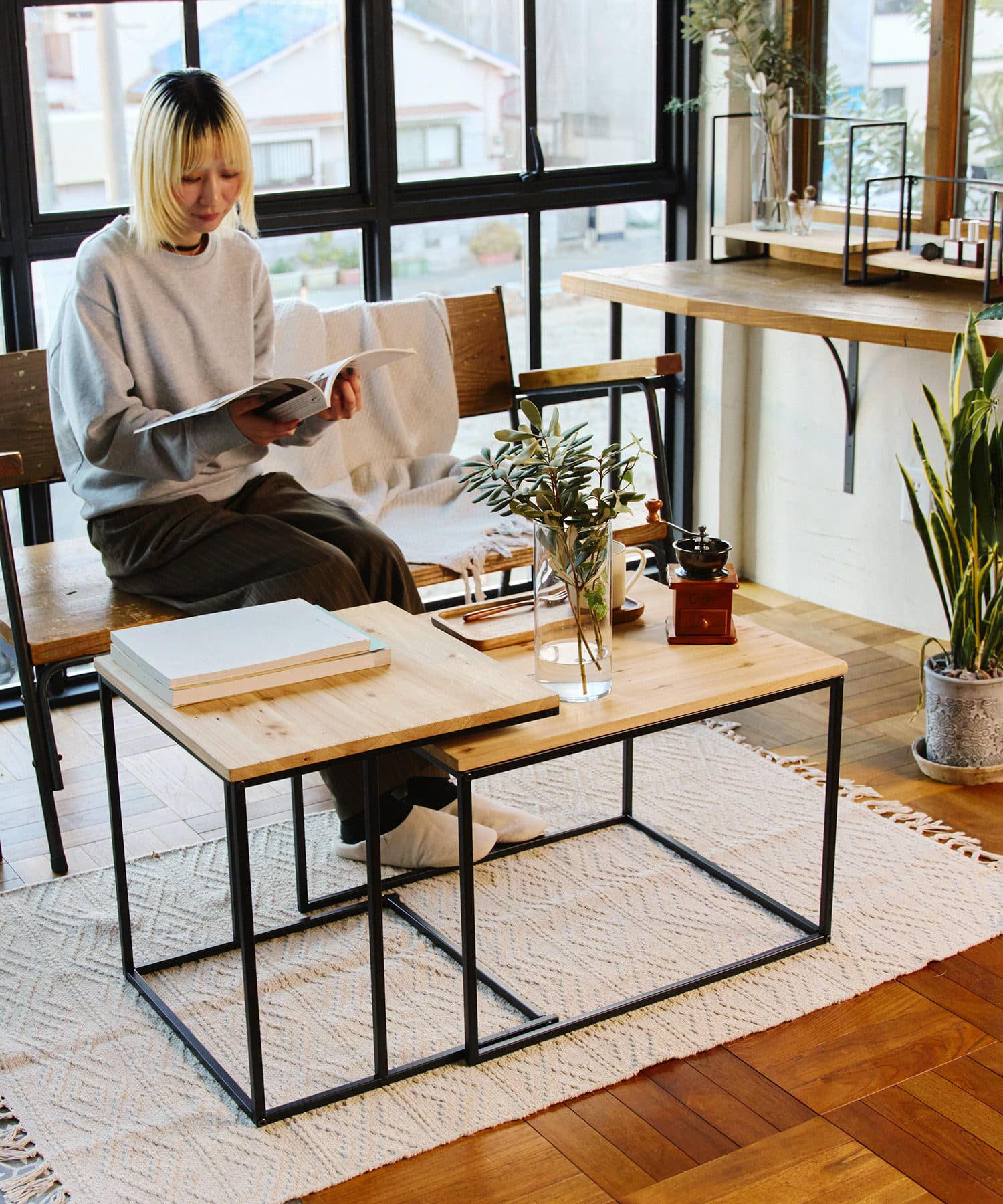 ●クールなアイアンと温かみのある天然木の組み合わせが魅力的なローテーブル。