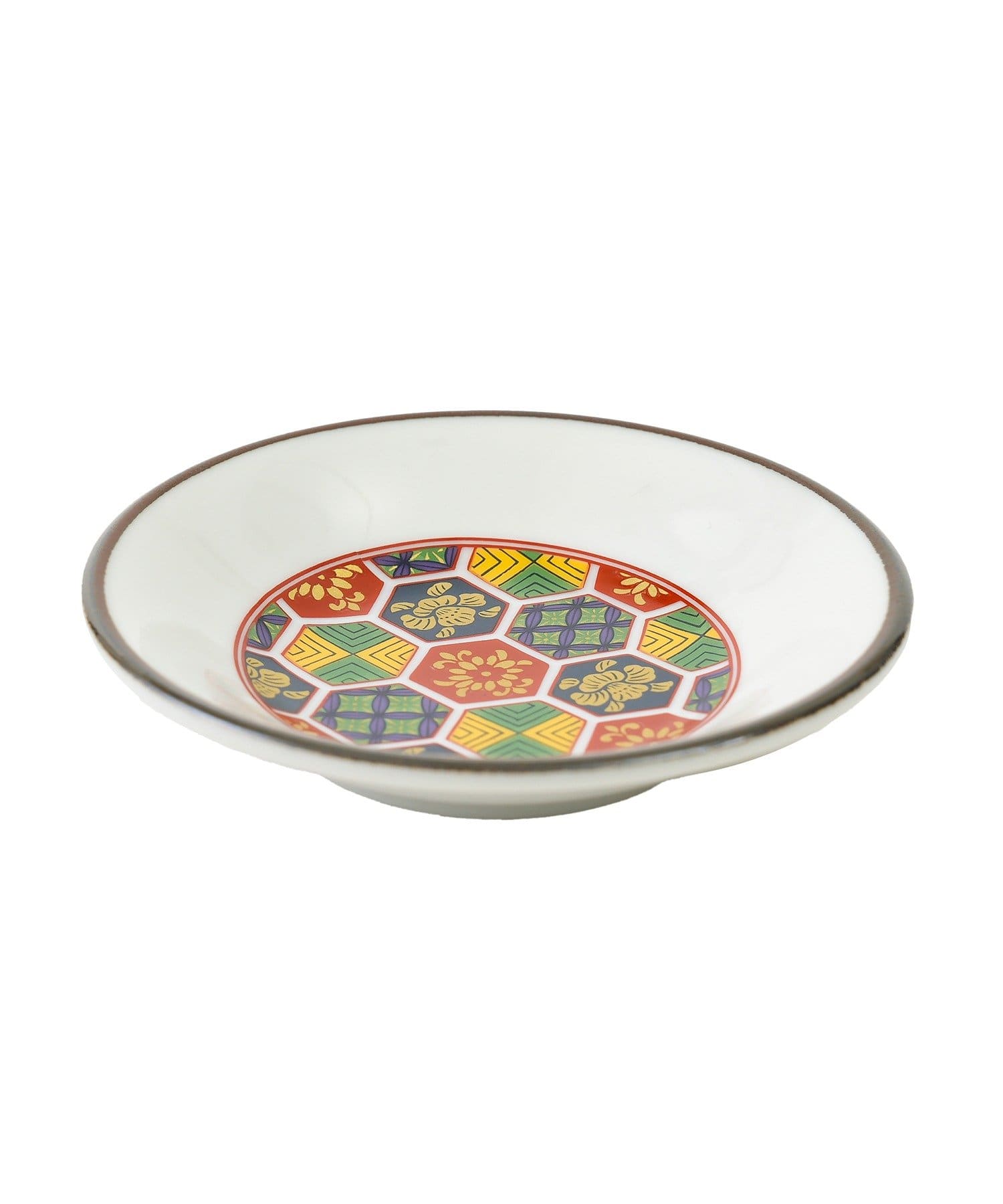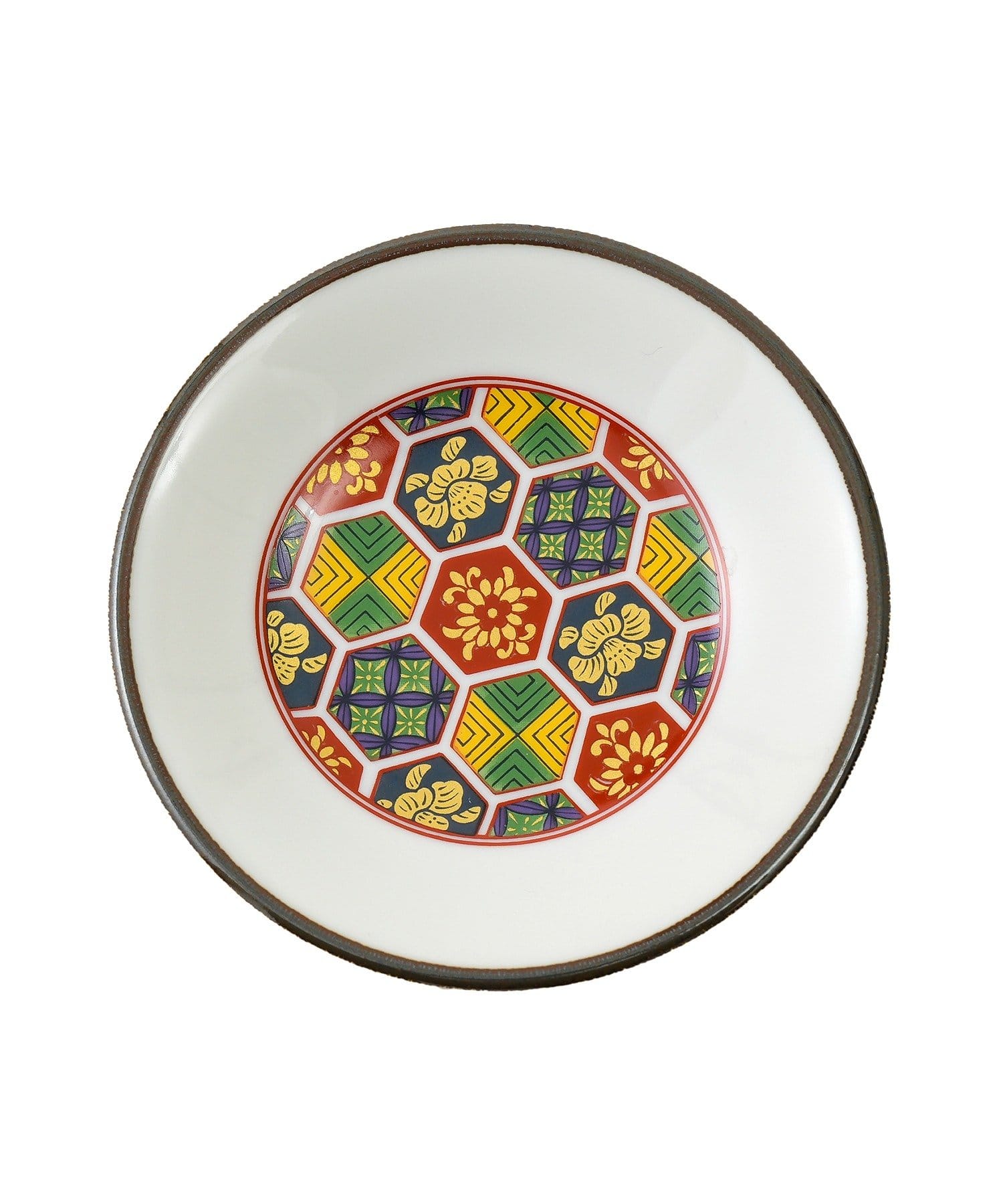 ●伝統的な亀甲模様と梅の花をあしらったカラフルなデザインの小皿。