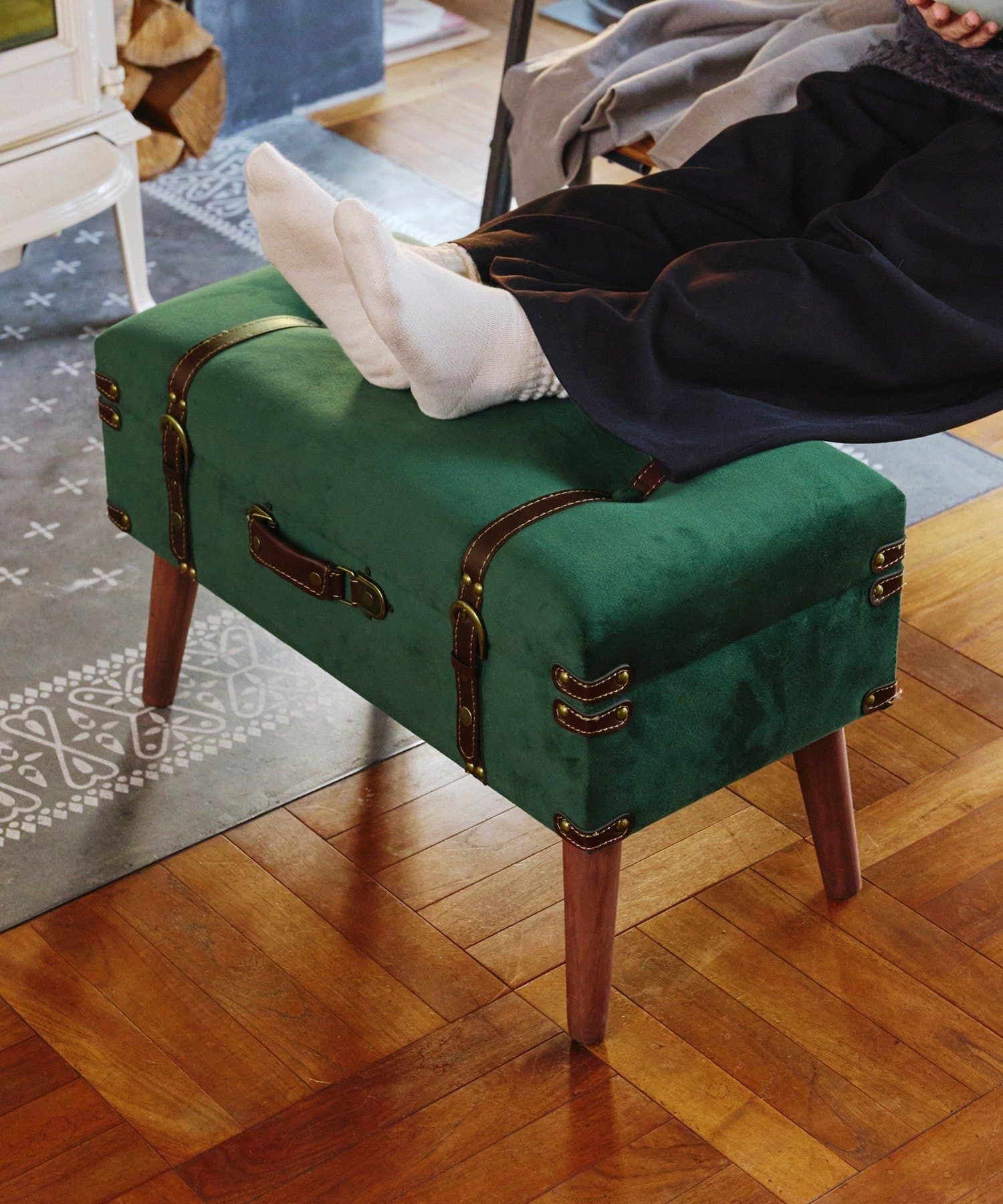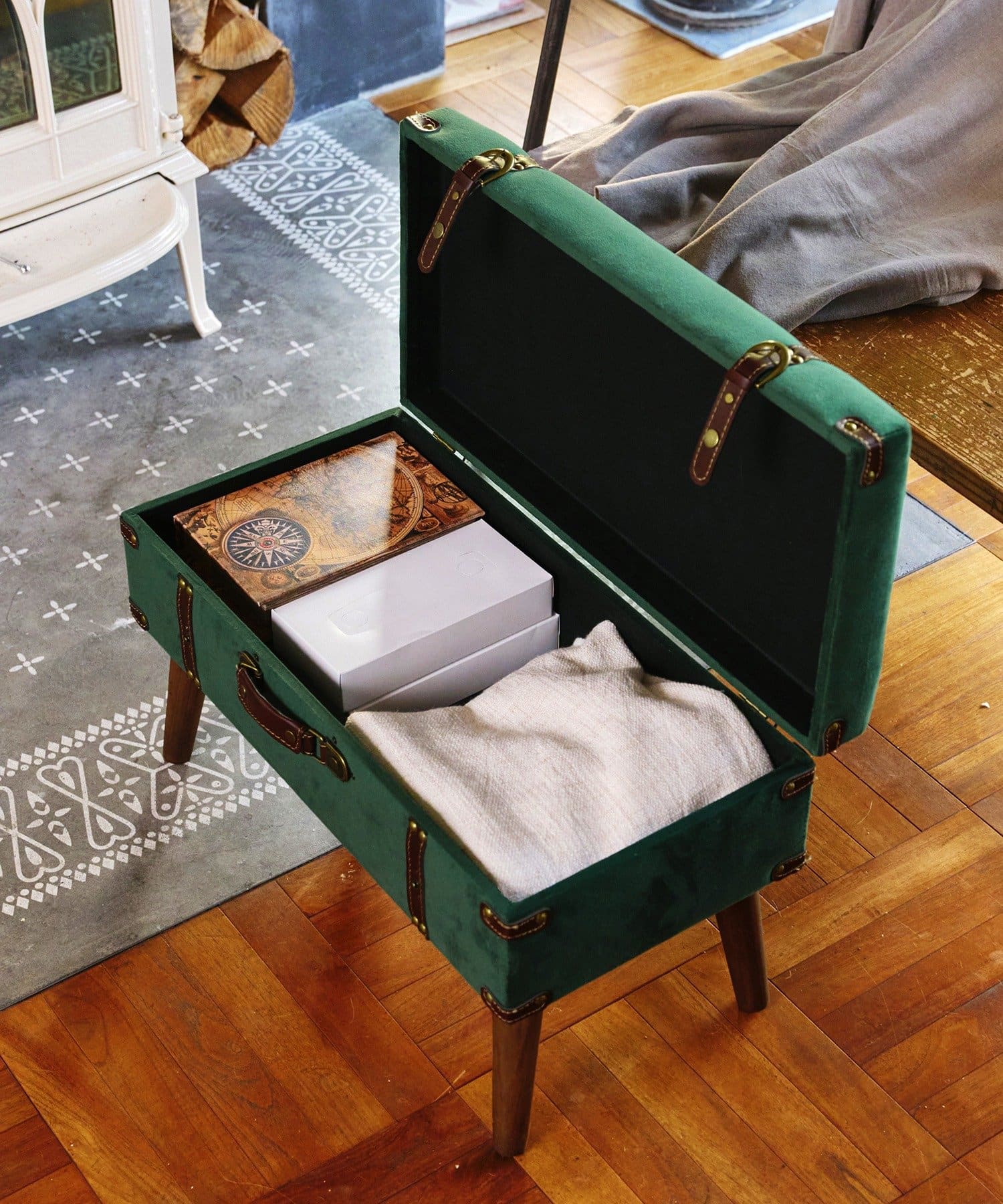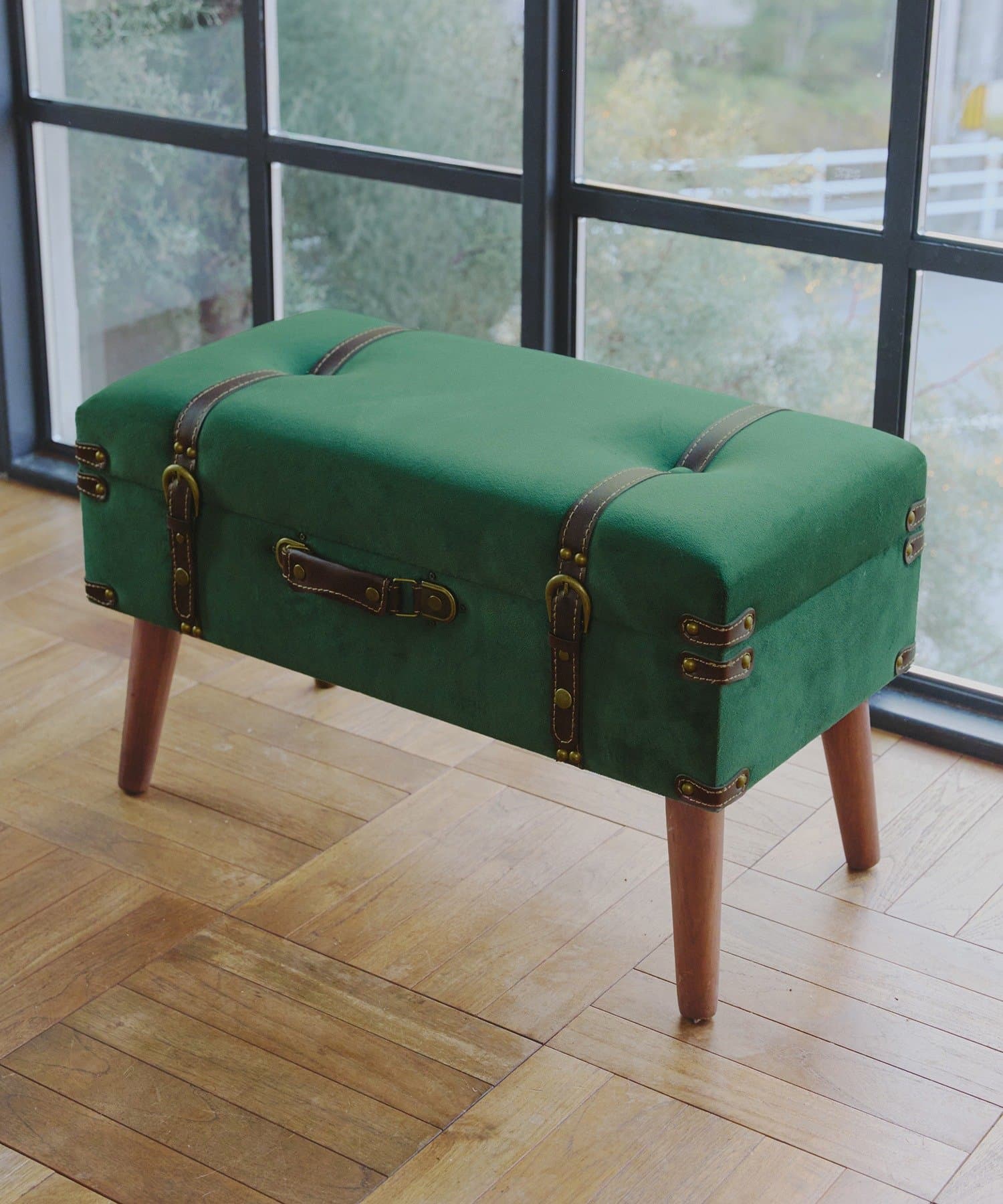 ●アンティークトランクをイメージした、ベルベット生地の脚付き収納スツール。