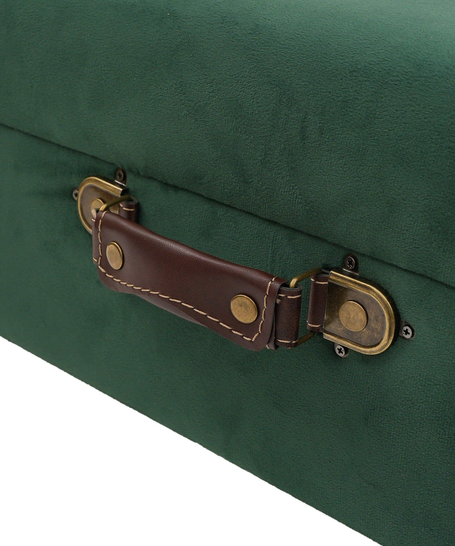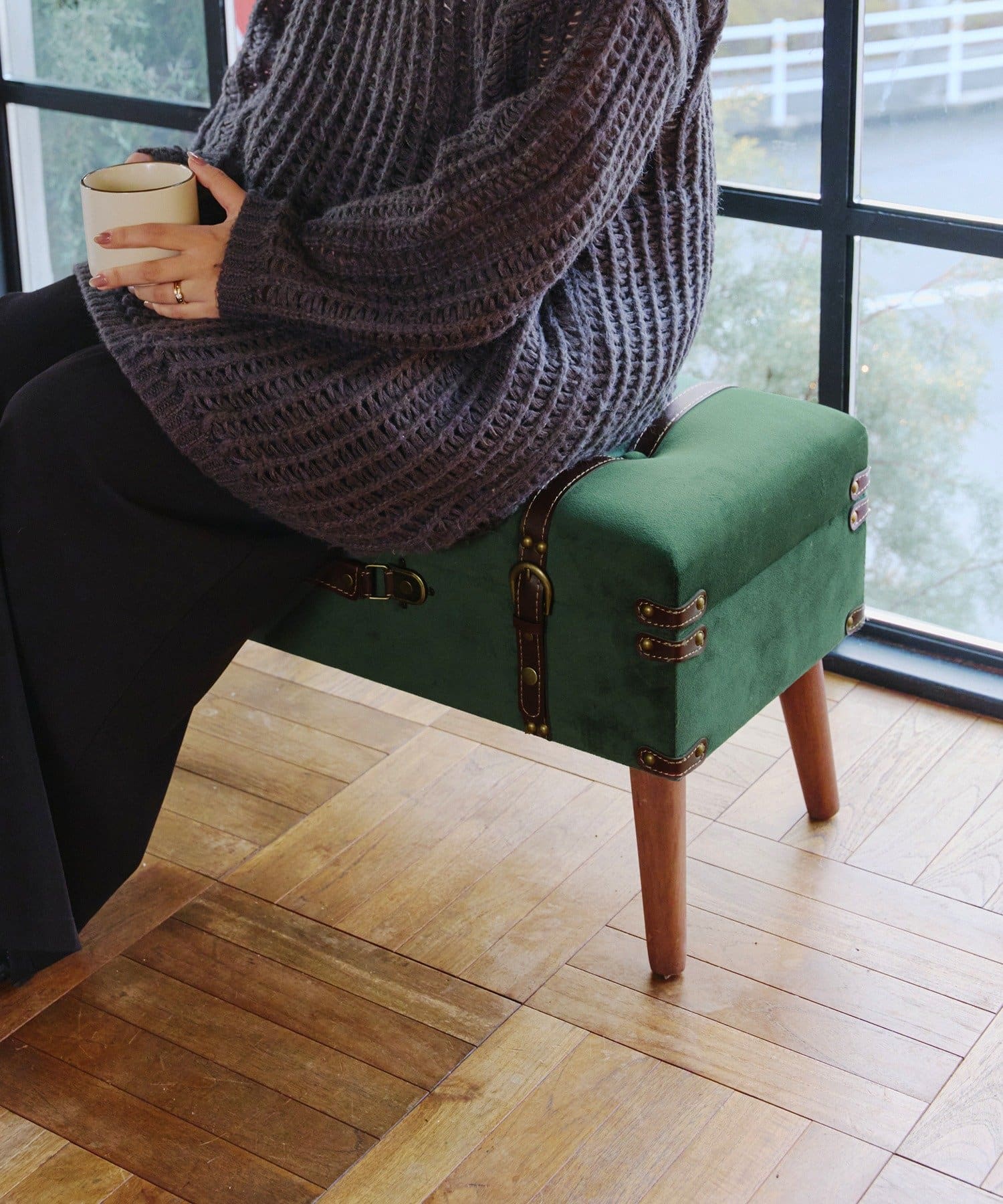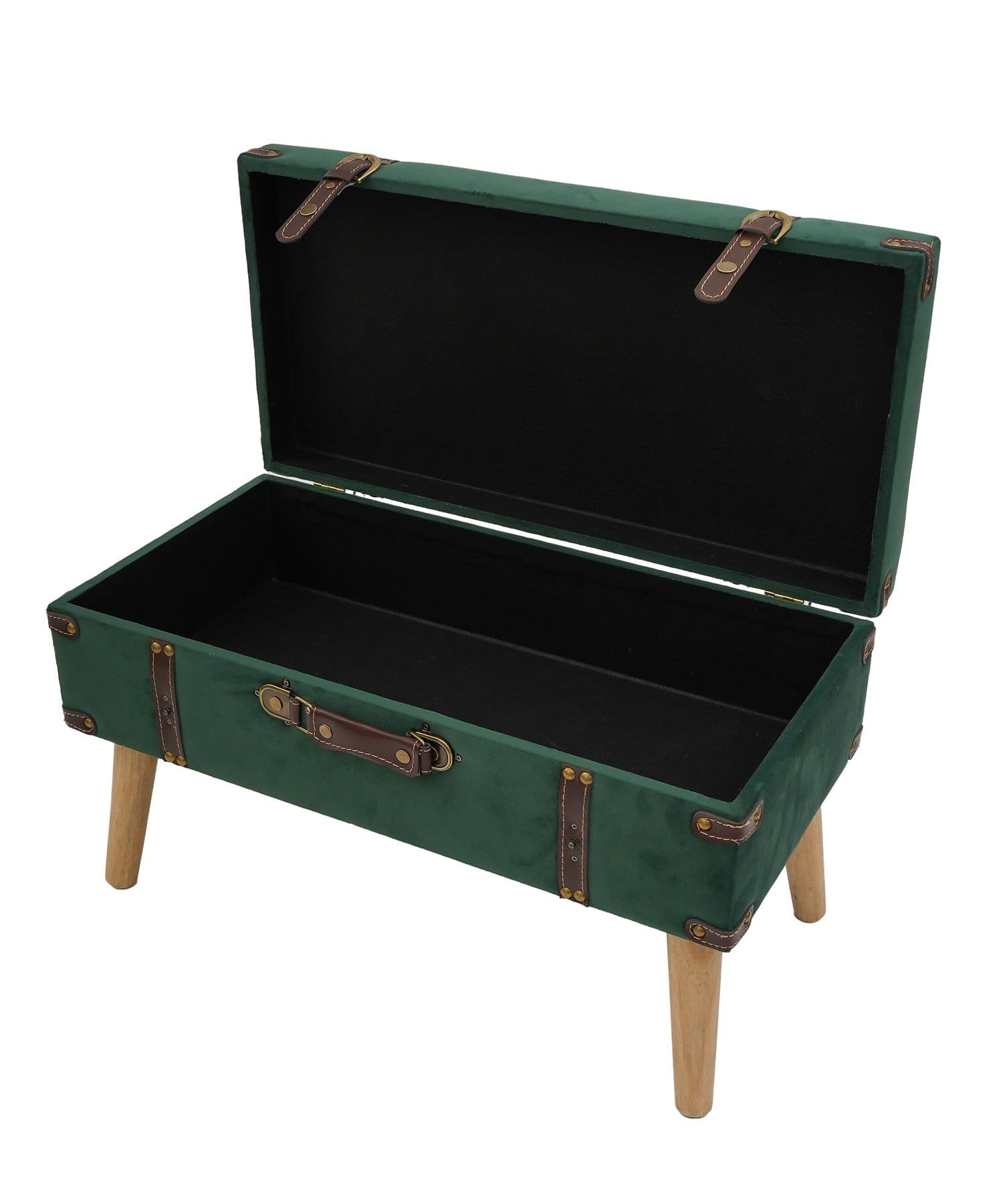 ●アンティークトランクをイメージした、ベルベット生地の脚付き収納スツール。