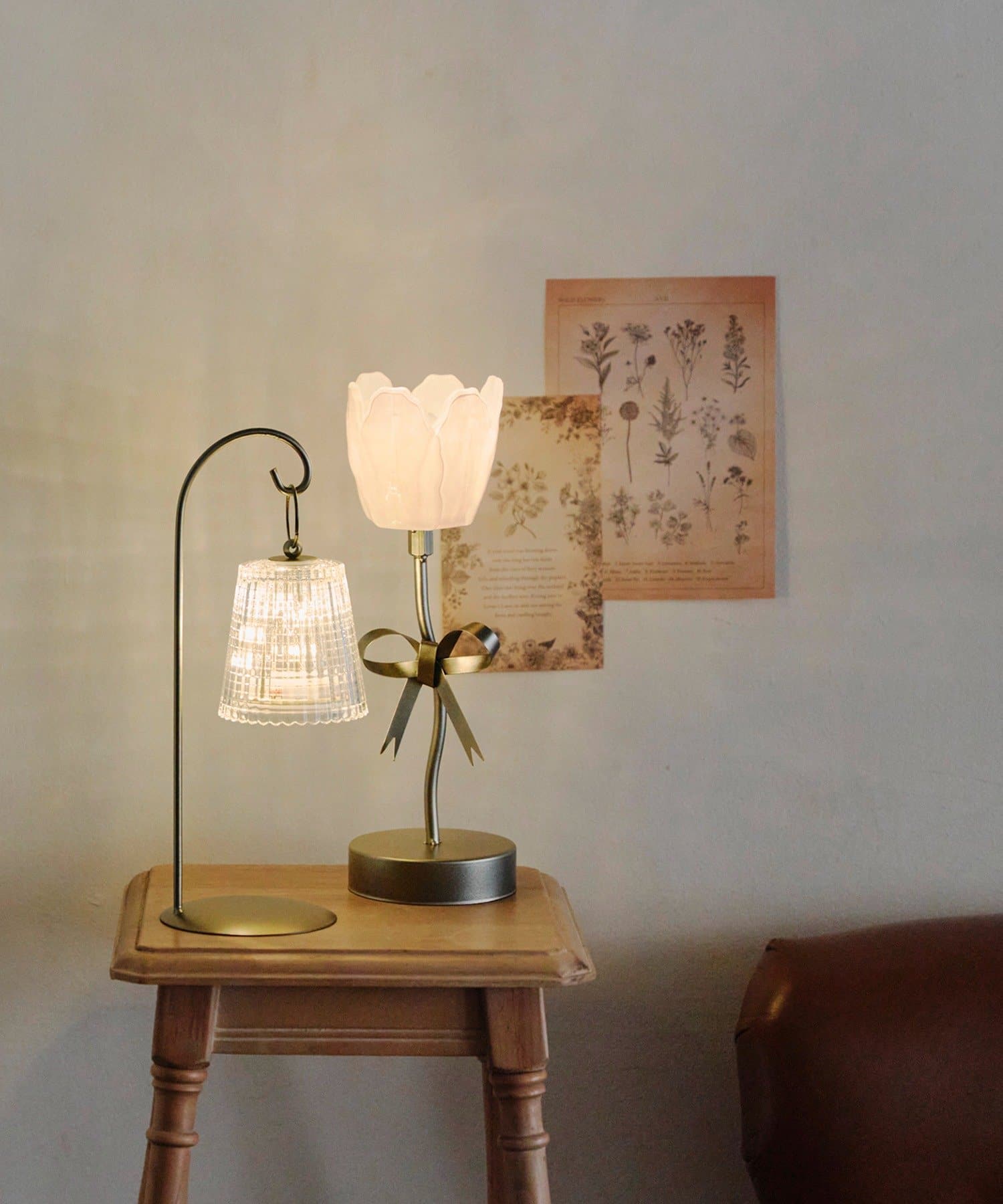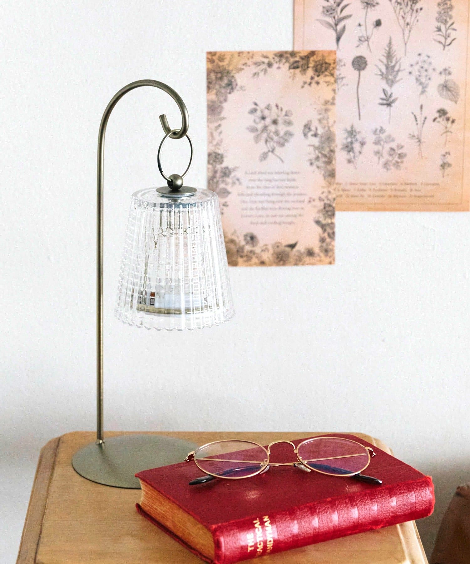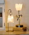 ●アンティーク調のアイアンフックスタンドに掛けるだけでベッドサイドや棚を上品で温かみのある空間に変えます。